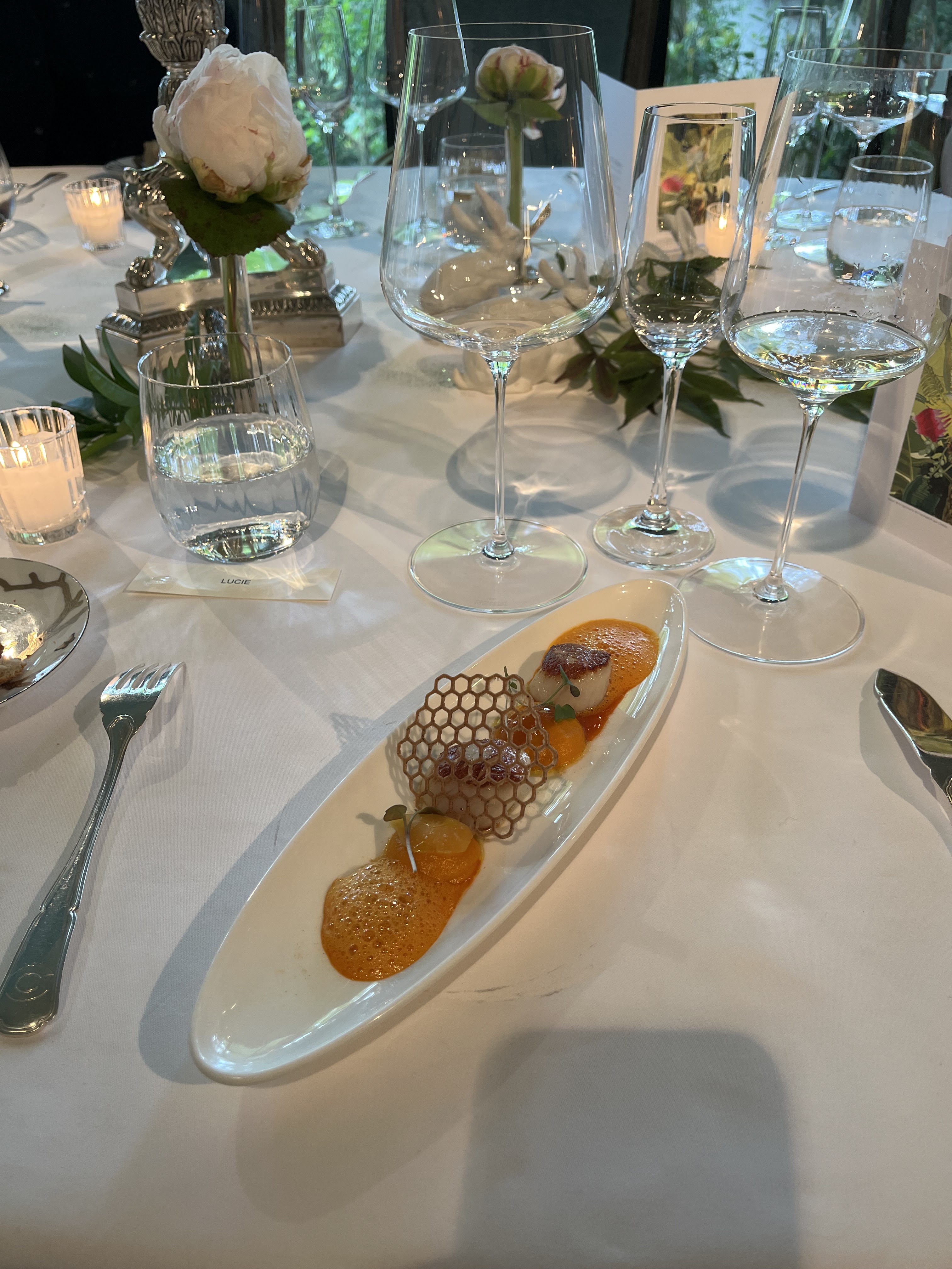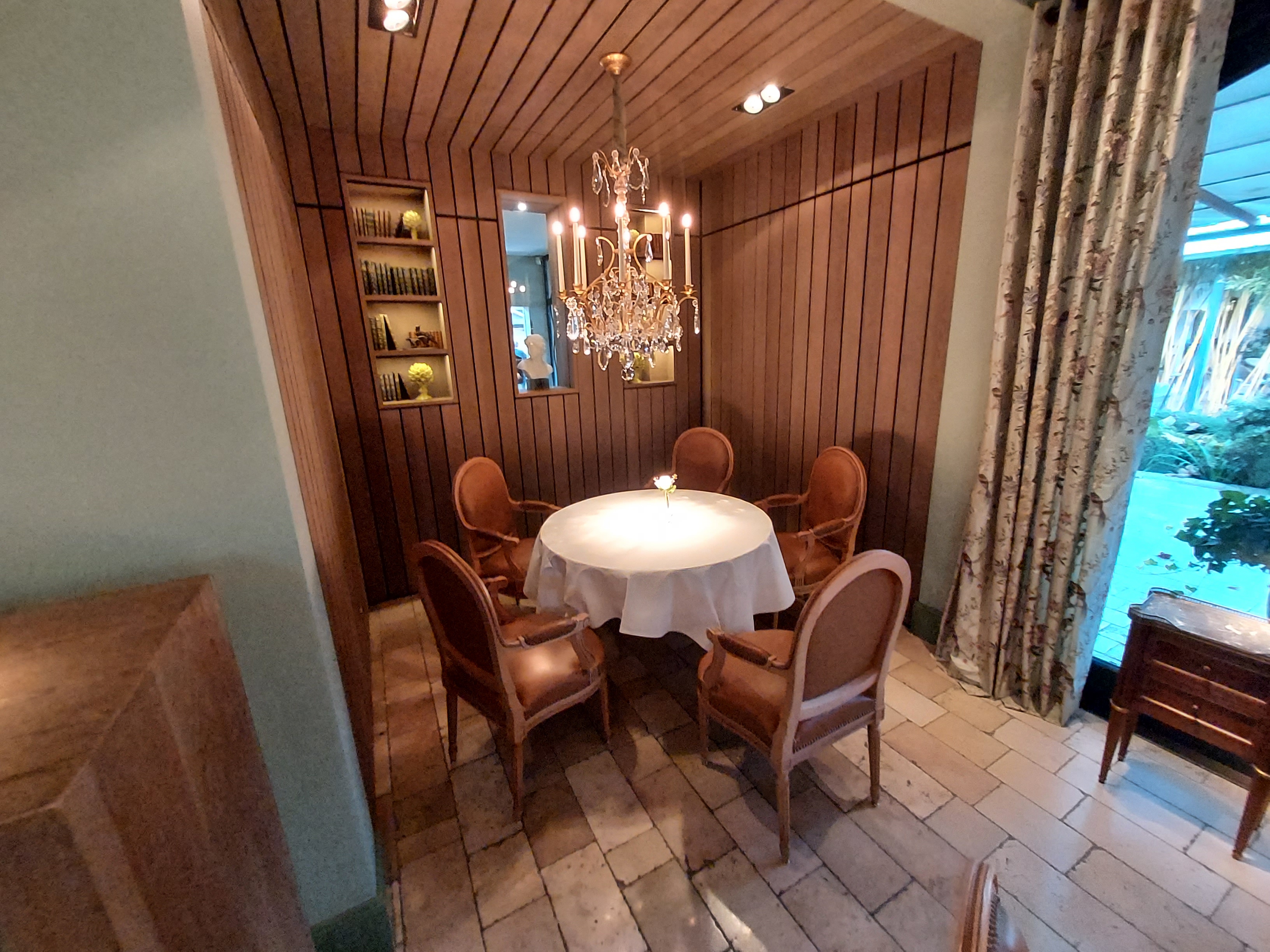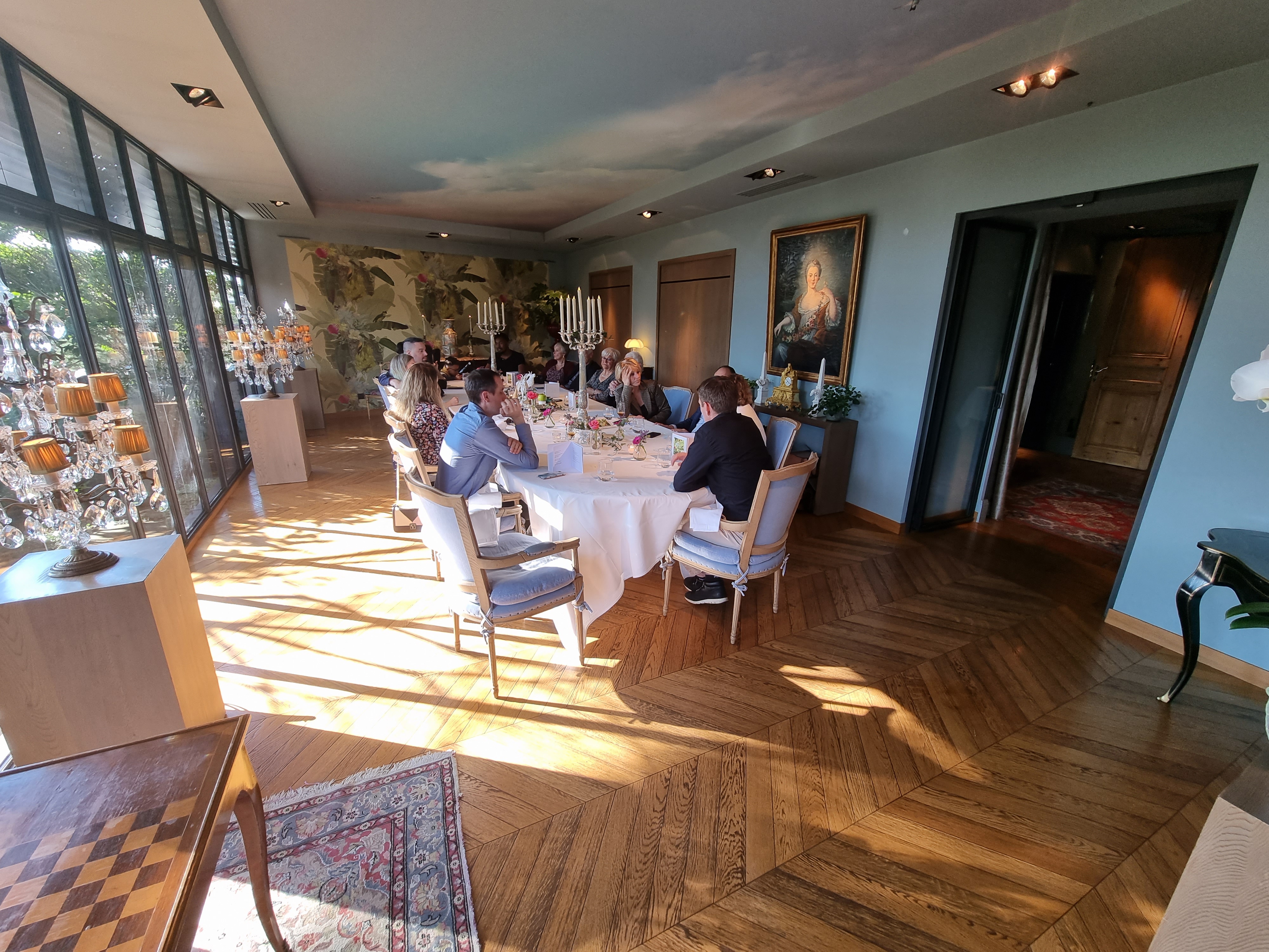 Déjeuner familial inoubliable dans un salon privatisé, l’orangerie… Véritable écrin de verdure à l’extérieur, décoration chaleureuse et feutrée à l’intérieur, table magnifiquement dressée, vaisselle en porcelaine superbe, cuisine recherchée, raffinée et savoureuse, le tout orchestré par un personnel au top 👌 Voir absolument les bougies bleues dans la cheminée, une sculpture en live !