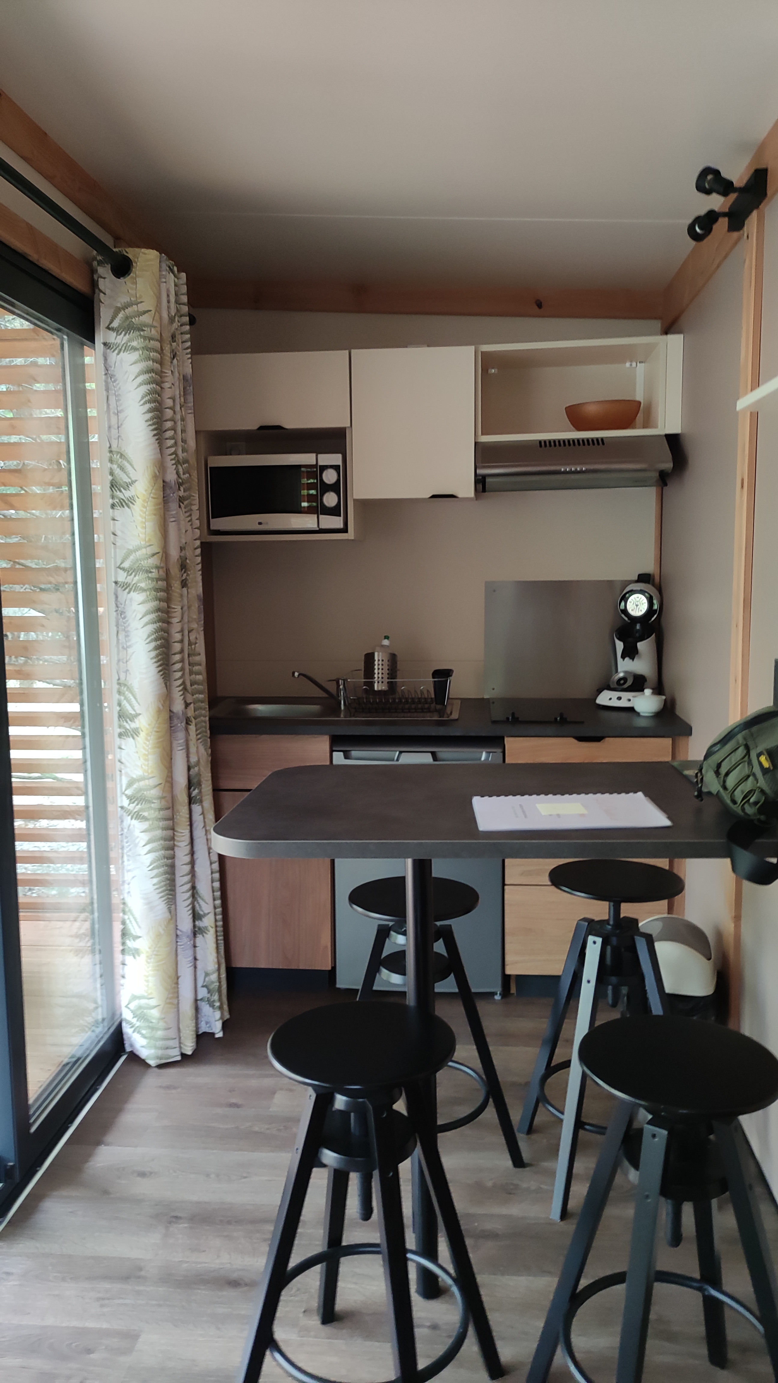 Bonjour, mauvaise surprise à l’arrière, un accueil déplorable, la gérante nous accueille dans le noir ( vraiment pas top ), aucun état des lieux n’a été effectué à l’arrivée ( au départ non plus ), un peu limité concernant la cotion. Des frais supplémentaires non annoncés lors de la réservation ( minimes mais toujours une mauvaise surprise ). Bref, un accueil déplorable. Pour la suite, attention ! Dans la piscine vous n’avez pas le droit au short de bain ( économie d’eau ) pas de bruit, pas le droit de nager, de jouer… juste le droit de rester dans l’eau. Point positif, les chalets sont jolies ( pas très spacieux). Seulement 1 ventilateur par chambre, pas de clime ( un endroit écologique… ) La salle de bain n’était pas propre ( trace de moisissures), pas de table sur la terrasse pour manger. Accès au chalet difficile à cause d’un laurier ( pas tailler ), une odeur d’égouts dans le bas du camping et pour finir, Prix quand même chere pour ce que c’est… et surtout attention au sangliers…