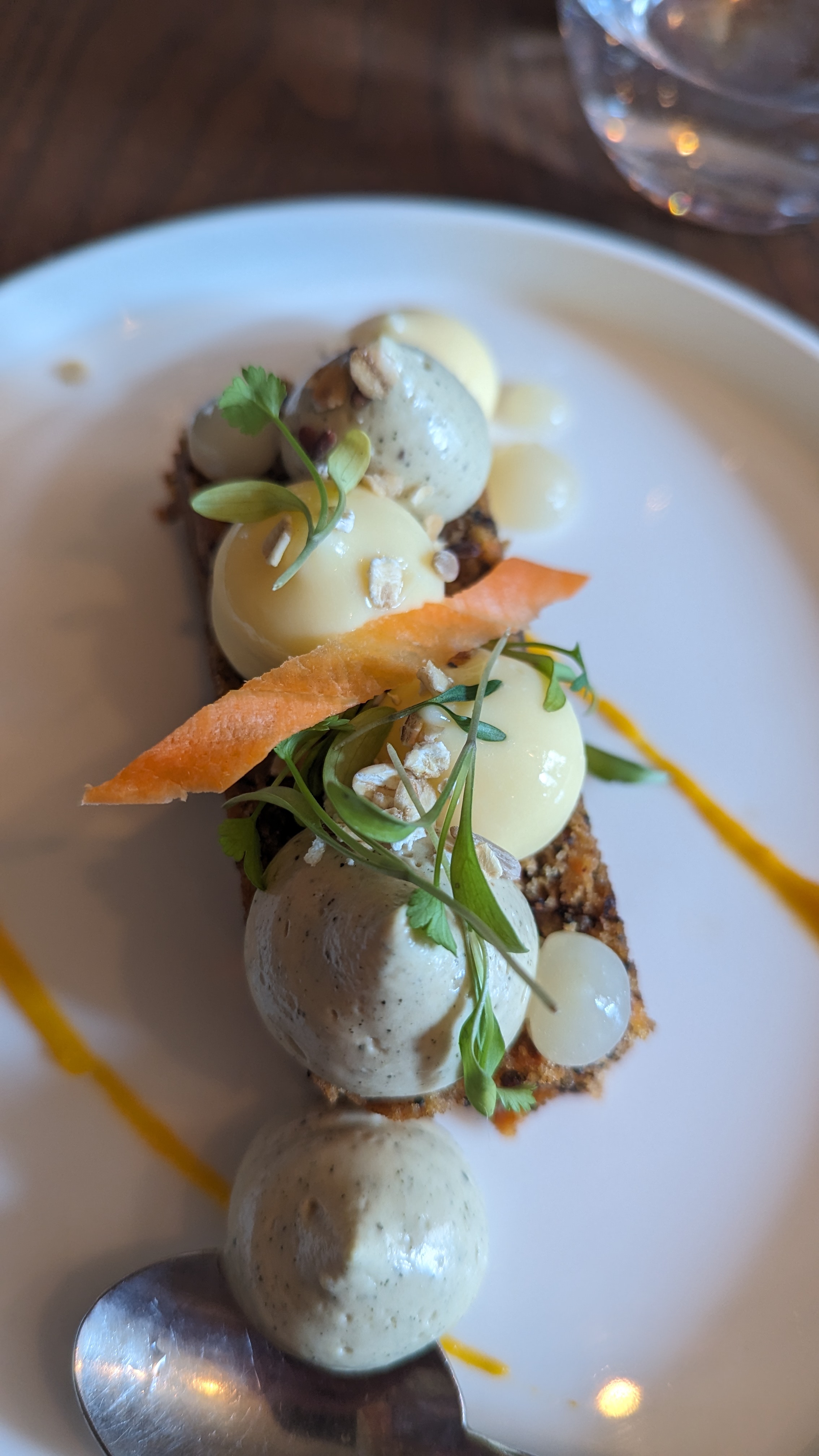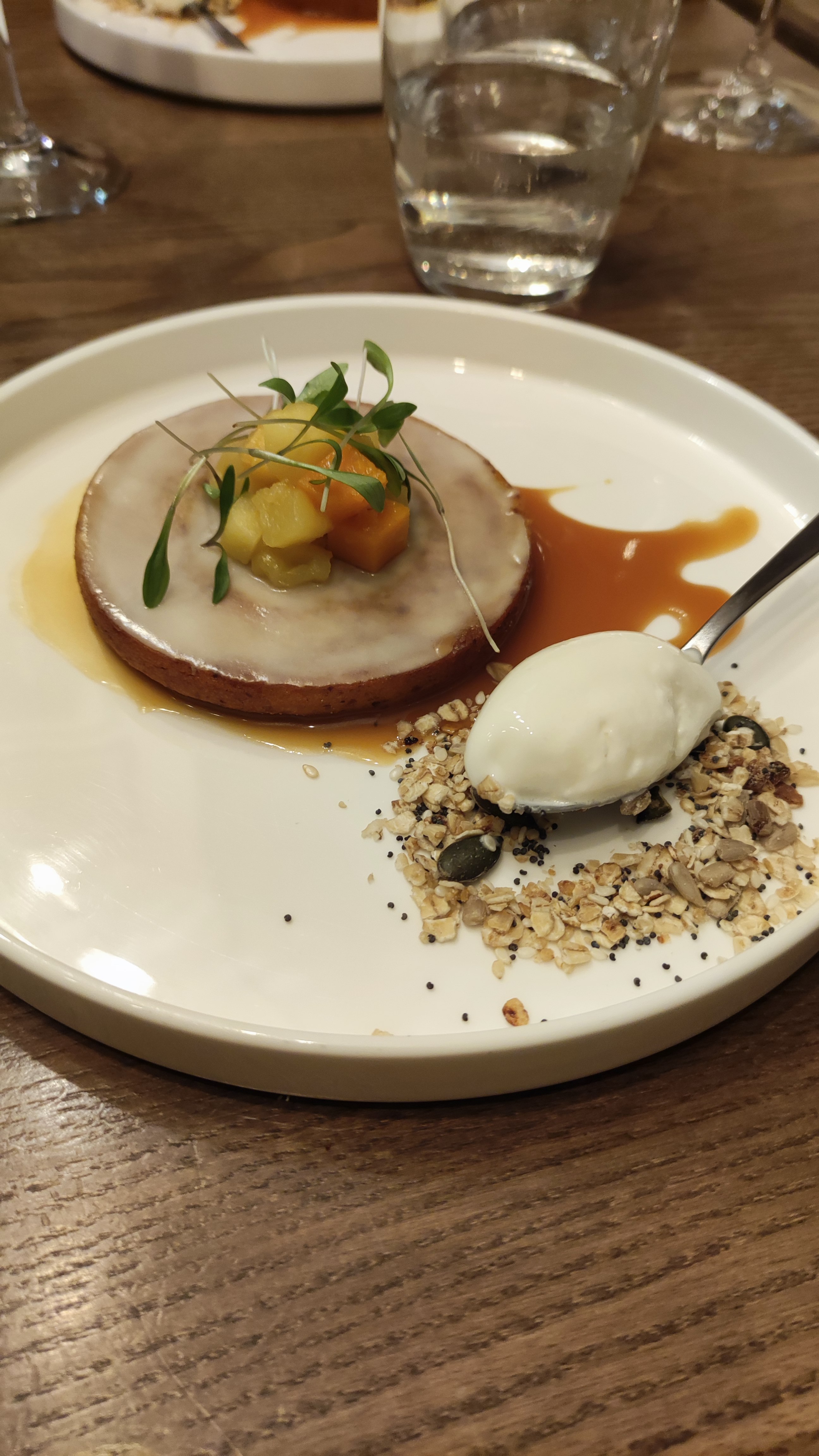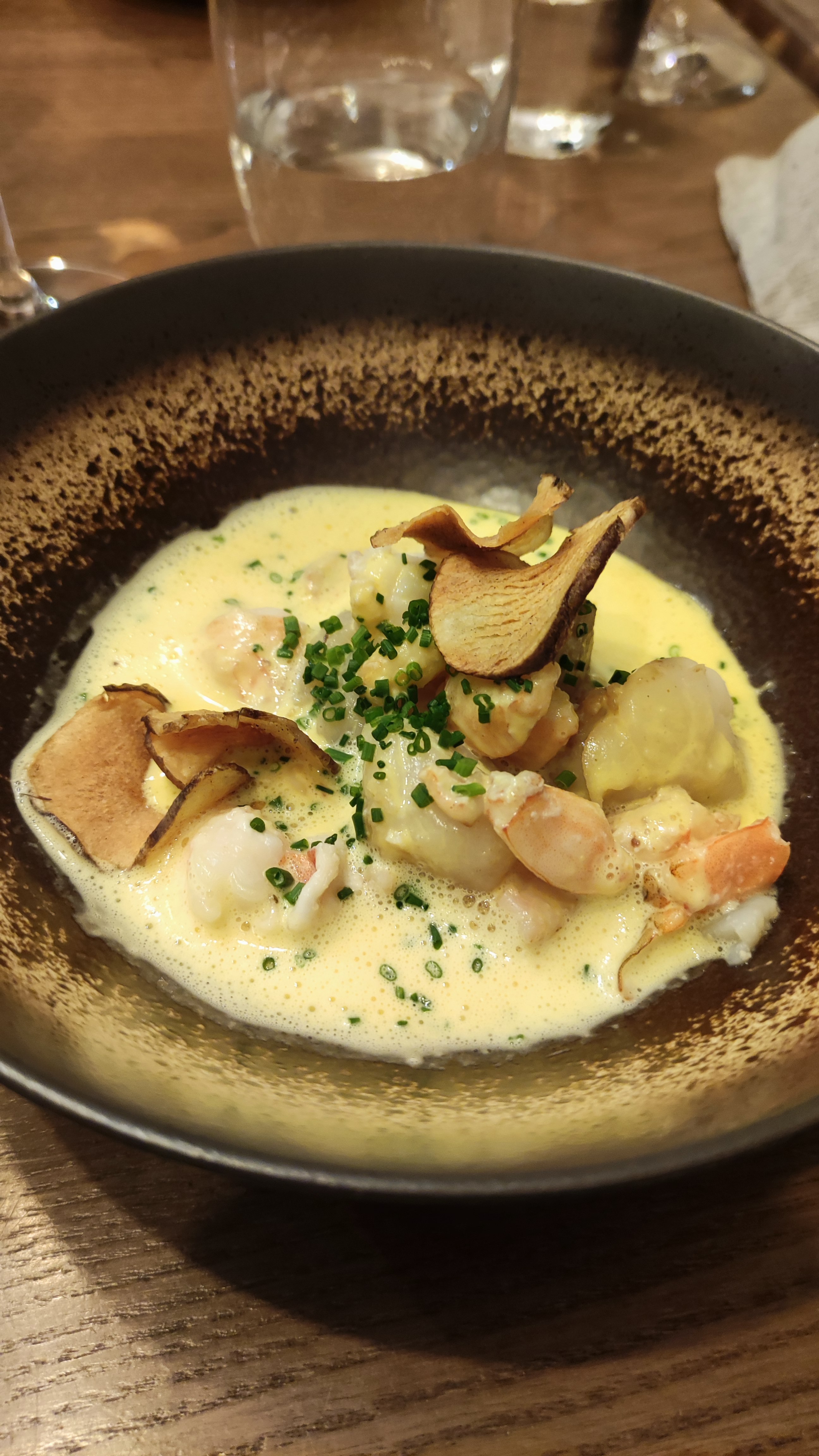 Nous avons démarré avec une belle entrée prometteuse et gourmande accompagnée d'un délicieux cocktail. Mais la suite était malheureusement décevante sans grande surprise : un plat à base de lieu noir et ses légumes puis un dessert composé d'un espuma au yaourth basique avec un granola. En résumé, un rapport qualité prix élevé par rapport au menu mystère du jour, dommage !