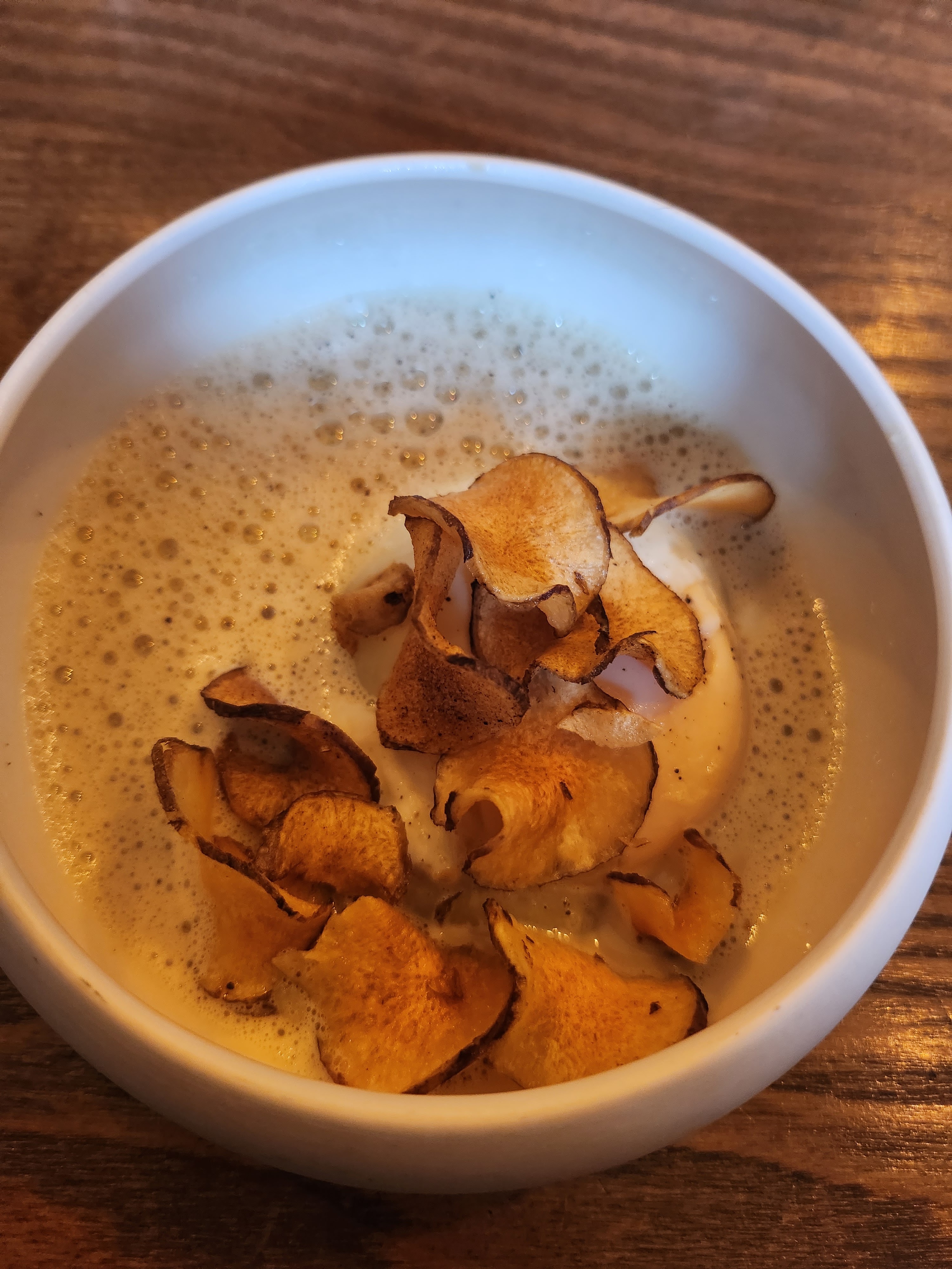 Repas intéressant, par contre quel inconfort ! Assis à 12 à deux tables collées. On ne pouvait ni bouger, ni manger ; on était coude en coude. De plus, assise sur des chaises en bois inconfort +++ ! Je suis sortie avec des crampes aux jambes. Dommage pour le/la chef cuisto qui a l'air très doué(e) et pour le concept qui a l'air séduisant.