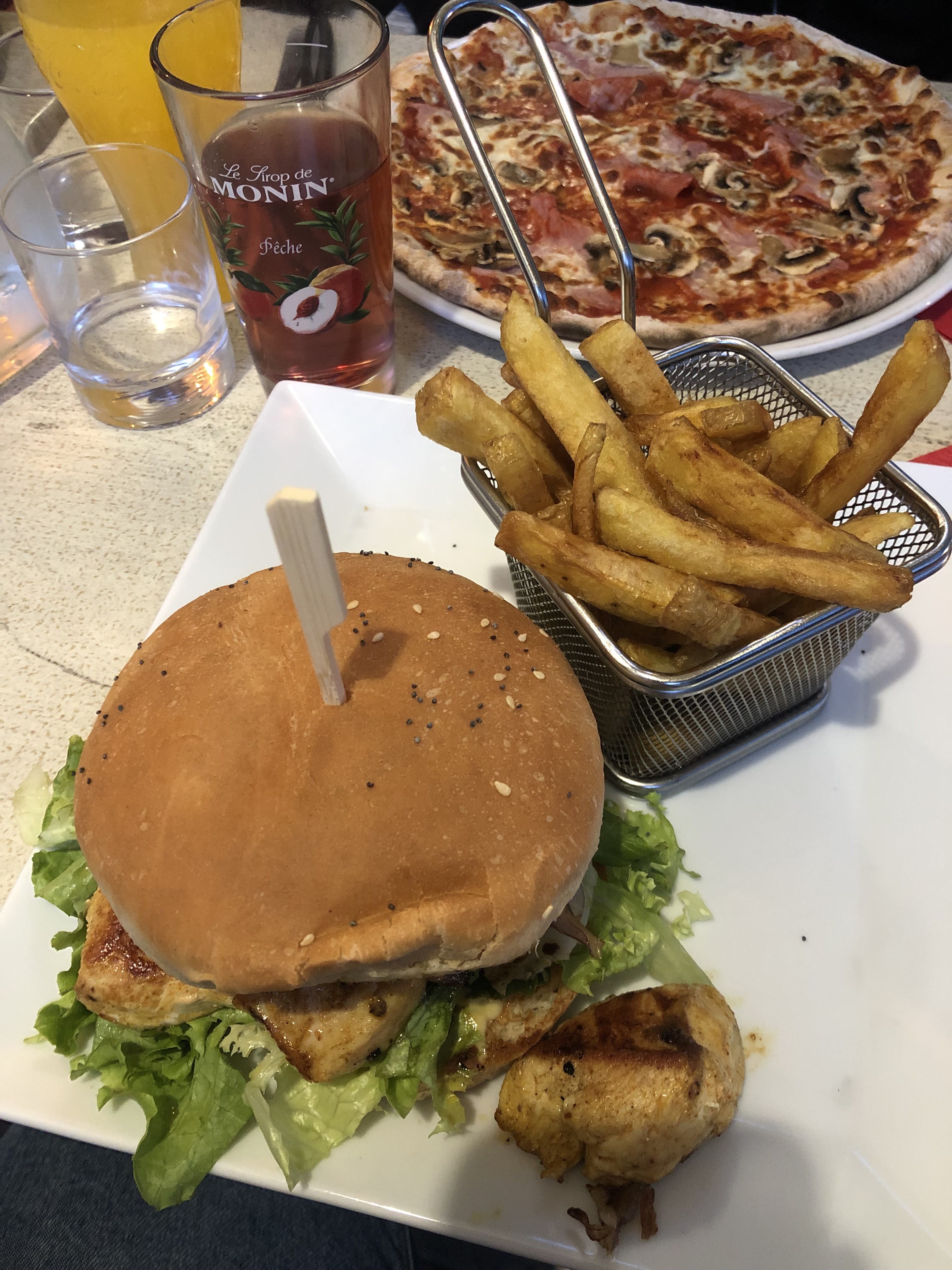 Plusieurs fois que nous avons était dans ce restaurant mais la un peu déçu . Quand on leur demande gentiment une autre paille pour notre petite fille de 2 ans et bien nous attendons encore la paille , mayonnaise en tube quand nous avons ouvert le bouchon la mayonnaise était passé depuis combien de temps ?? le tube était la sans être au frais ? Limite pour un restaurant . Pas de papier essui main dans les toilettes et au final aucune carte de dessert proposé obligé de choisir un parfum au pif pour les enfants !! Mon mari avez demandé un café et bien on l'attend toujours également . Très déçu de payer une somme assez élevé pour pas grand choses. Le point positif les pizzas et les burgers sont bons les frites laisse a désirer.