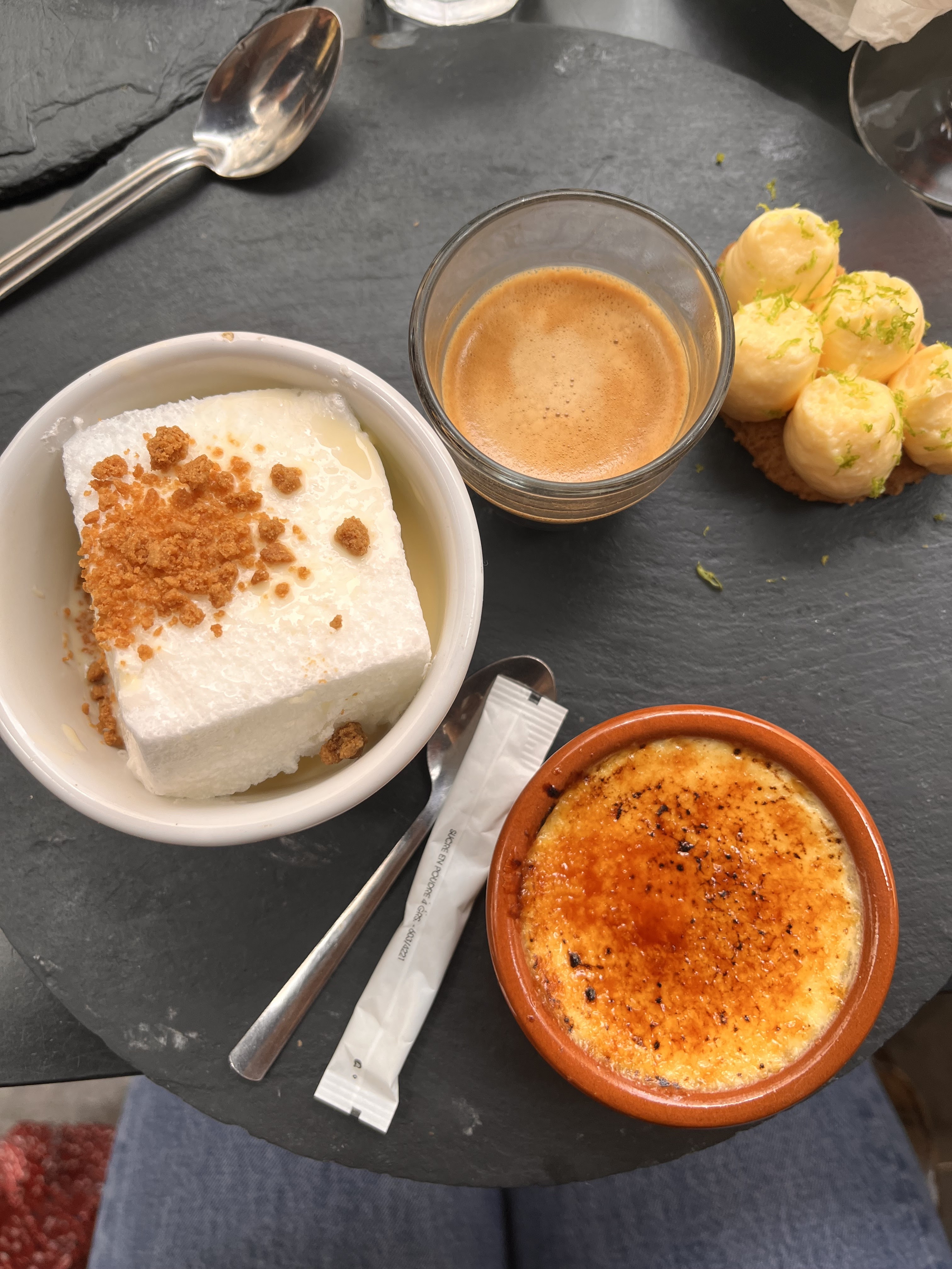 Restaurant local avec une délicieuse cuisine française. Nous sommes venus ici pour le déjeuner et avons eu le déjeuner spécial en choisissant une entrée et un plat principal. Entre nous, nous avons eu les champignons et l'œuf, et l'omelette au chorizo pour commencer. Pour le plat principal, j'ai eu le poulpe et les autres ont eu le porc. Tout était cuit à la perfection et était délicieux. Les portions étaient juste suffisantes - nous étions rassasiés et n'avions pas besoin de faire une sieste avant de continuer la journée. Le dessert a été mon point fort, en particulier la crème brûlée à la fleur d'oranger et la tarte citron-lime. Je reviendrai à coup sûr!