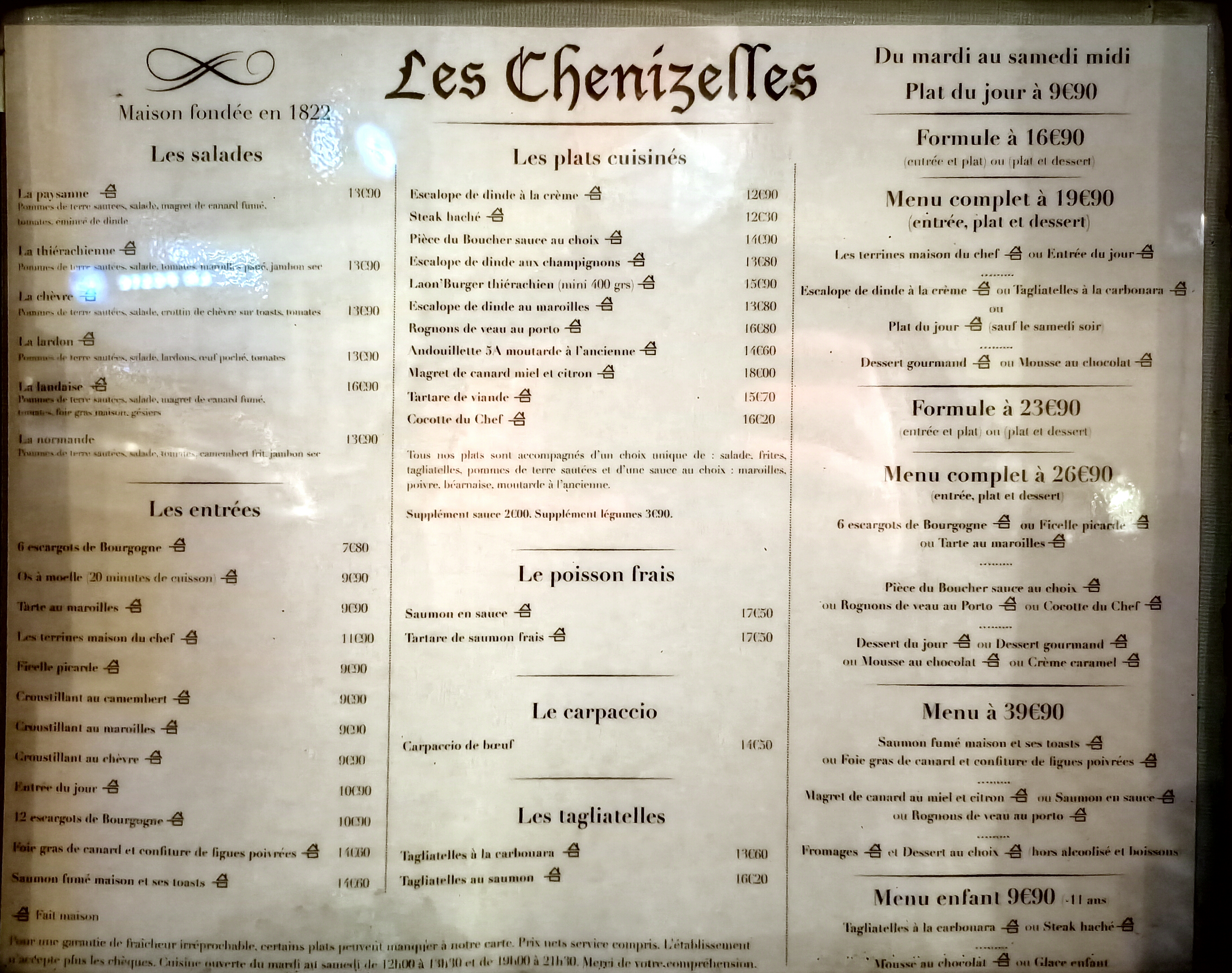 Les Chenizelles, une des plus anciennes brasserie de LAON, le cadre typique la carte du restaurant classique mais, bonne cuisine maison. À goûter pour ceux qui aiment les rognons de veau avec les pommes de terres sautées à l'ancienne extra ! La carte des desserts mériterait à être développée. Rapport qualité prix correct, il vaut mieux réserver le vendredi où samedi soir.