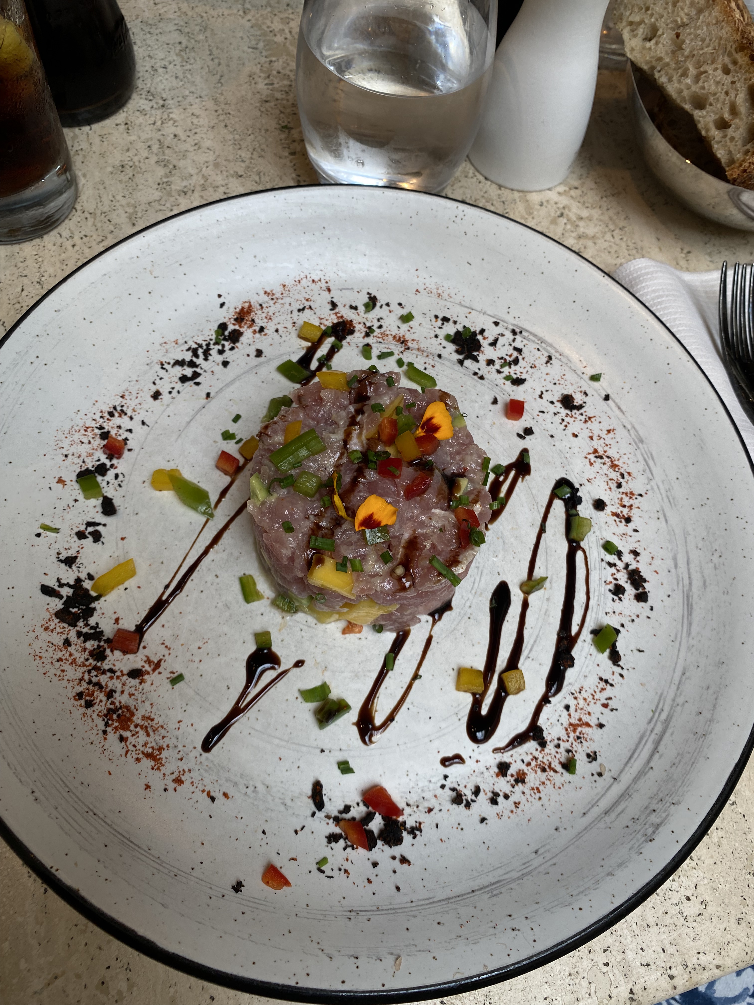 La nourriture et le service étaient justes. Pas génial. Pour les staters nous avons testé la brochette d'agneau et le jambon de 40 mois. Le jambon était bon mais l'agneau était décevant. C'était sec et trop cuit. Pour le plat principal, nous avons eu la poitrine de porc (beaucoup trop grasse) et le canard - sauf qu'ils n'étaient plus en canard. Ils ont suggéré de remplacer le poulet, ce que nous avons accepté, mais ils n’ont pas modifié le plat en fonction du changement. C'était étrange. La sauce fruitée était destinée au canard et non au poulet. Le poulet était moelleux mais fade. Nous avons attendu longtemps que notre serveur vienne nous voir après avoir été servis. Ainsi, lorsque mon plat avait besoin de sel, nous avons attendu environ 10 minutes pour attirer son attention. Les cocktails étaient délicieux.