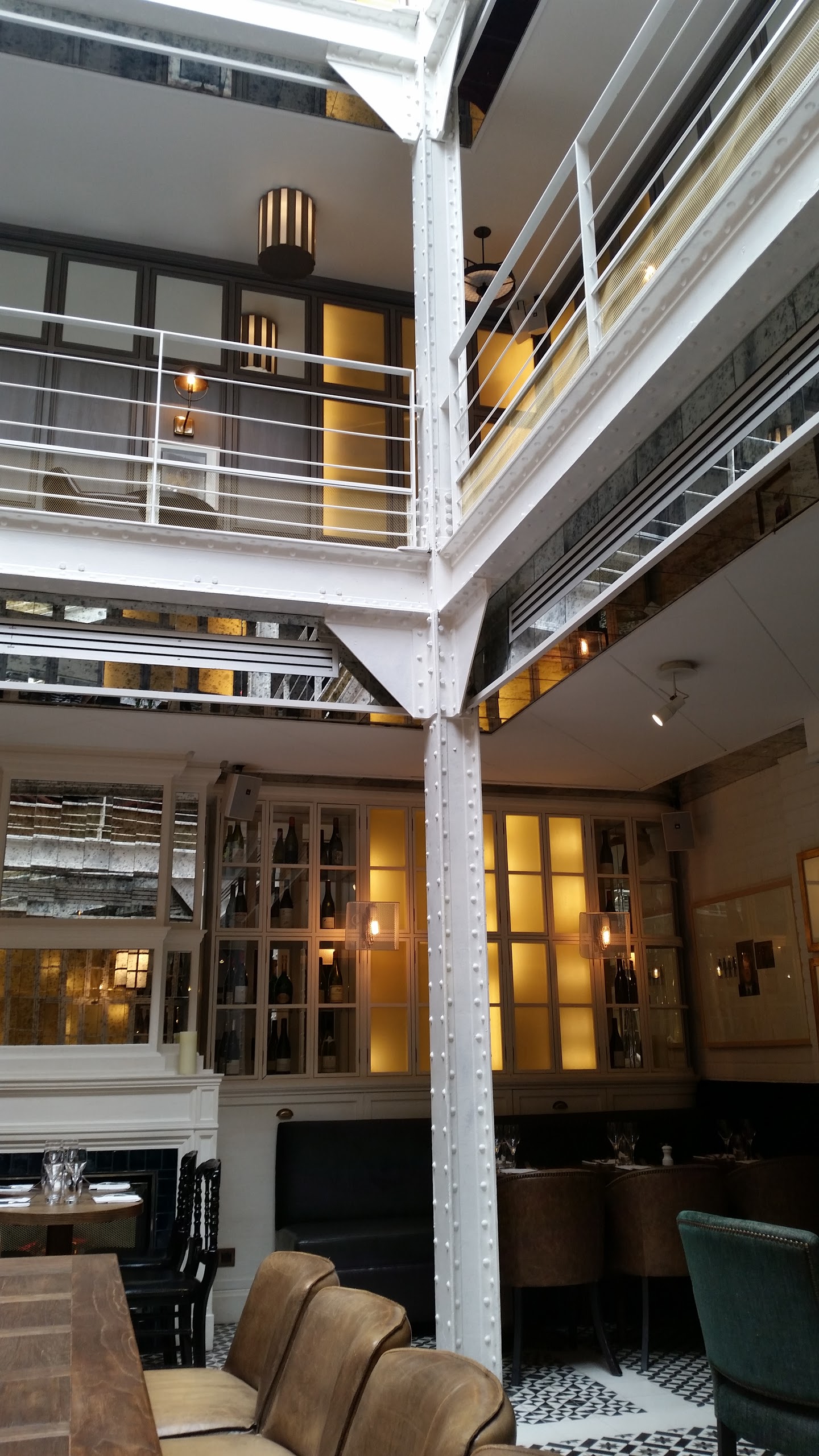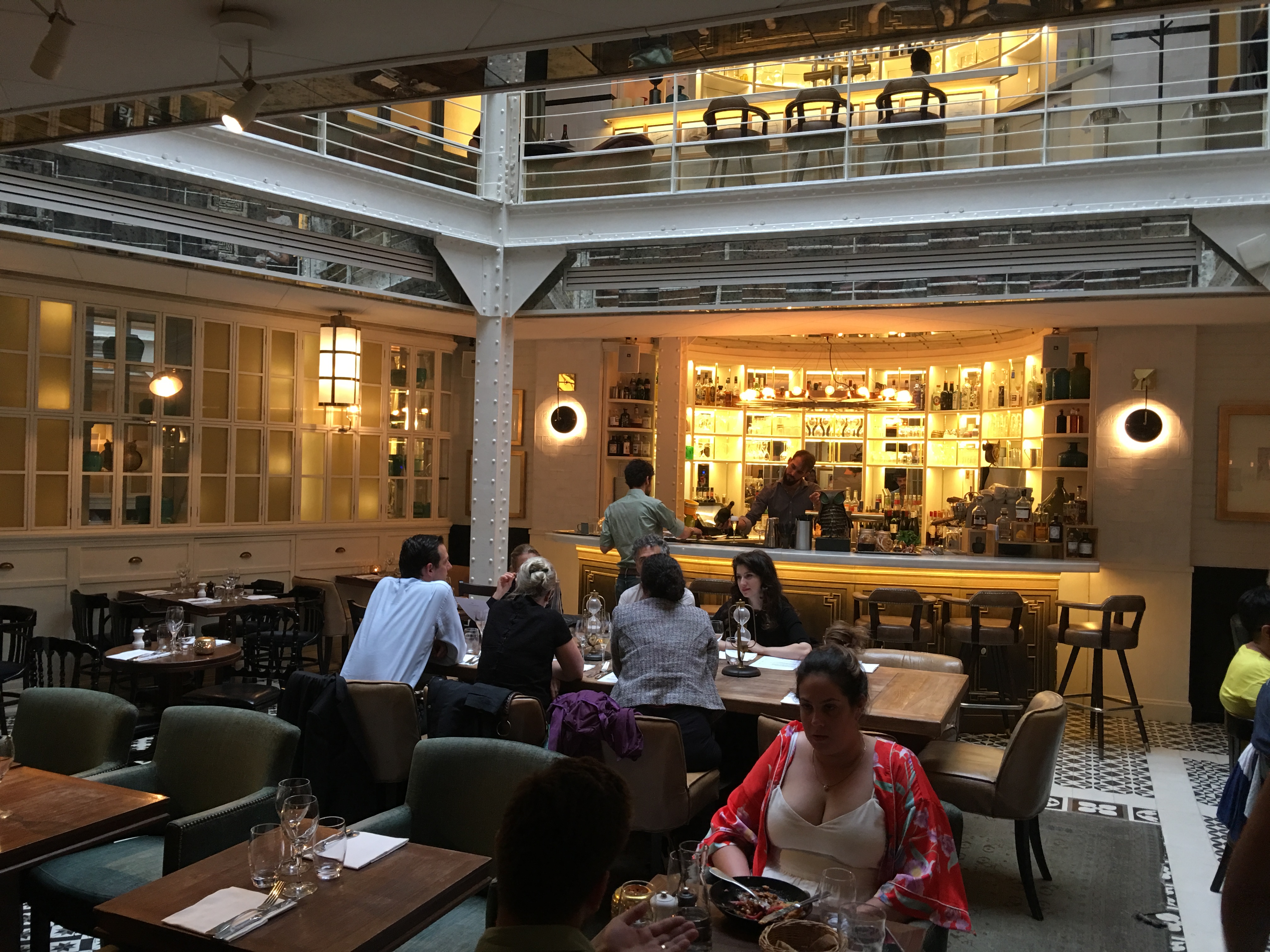 Petite terrasse sympathique avec de la verdure, bar effet wouah puis en continuant on découvre une grande salle sur trois étages avec une ambiance art déco sophistiqué. Les plats étaient très bien travaillé, toutefois servis plutôt tiède. Nous avons passé un moment agréable et y retournerons très certainement.