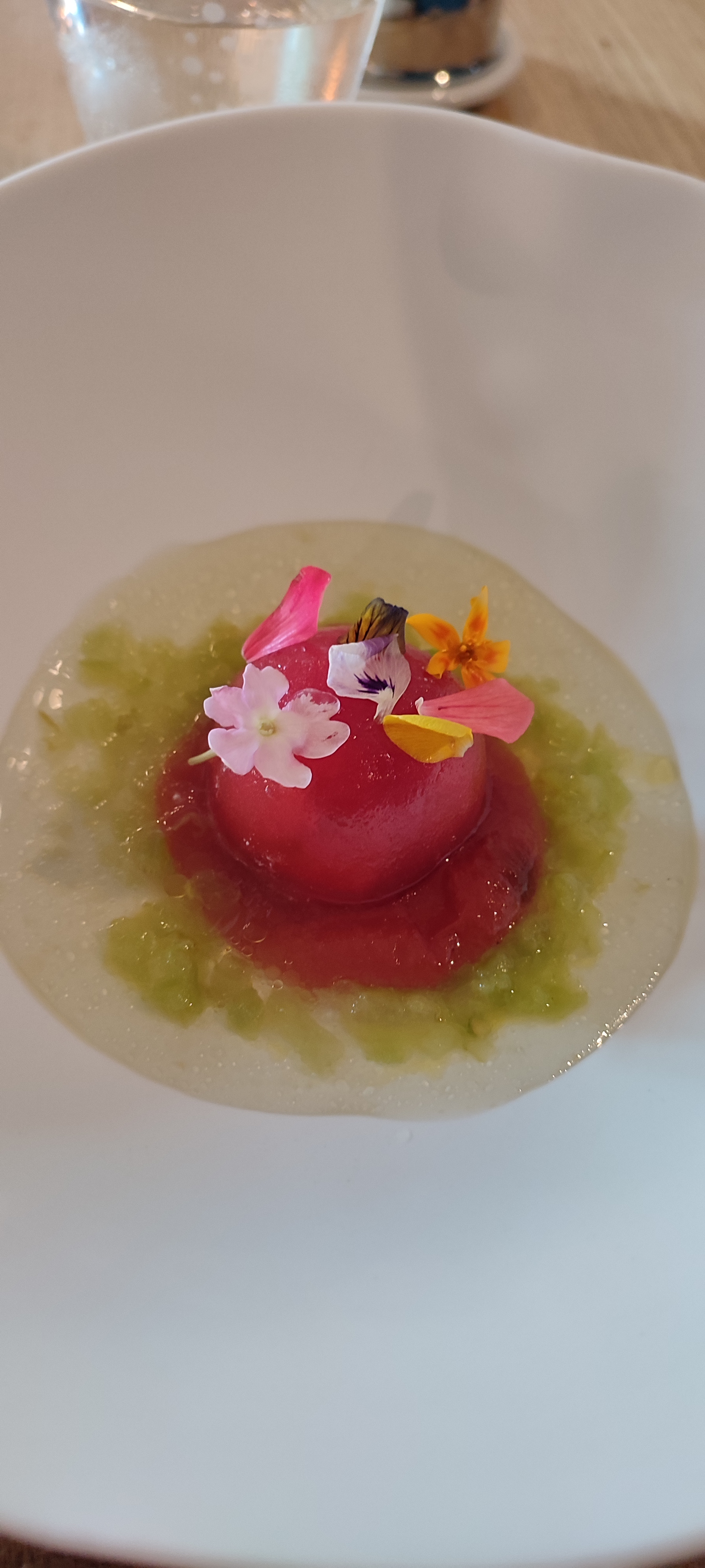 Première fois dans un étoilé. Kdo. Rien à dire, tous les plats étaient aussi beaux que bons. Assiettes bien dressées, fraîches, croquantes et goûtues. Avec accompagnement de vins. Et pour finir une café avec mignardises et cerise sur le gâteau un petit présent de bienvenue, cake de voyage. Le service était super et agréable. Merci au chef et à tout l'équipe. On reviendra.