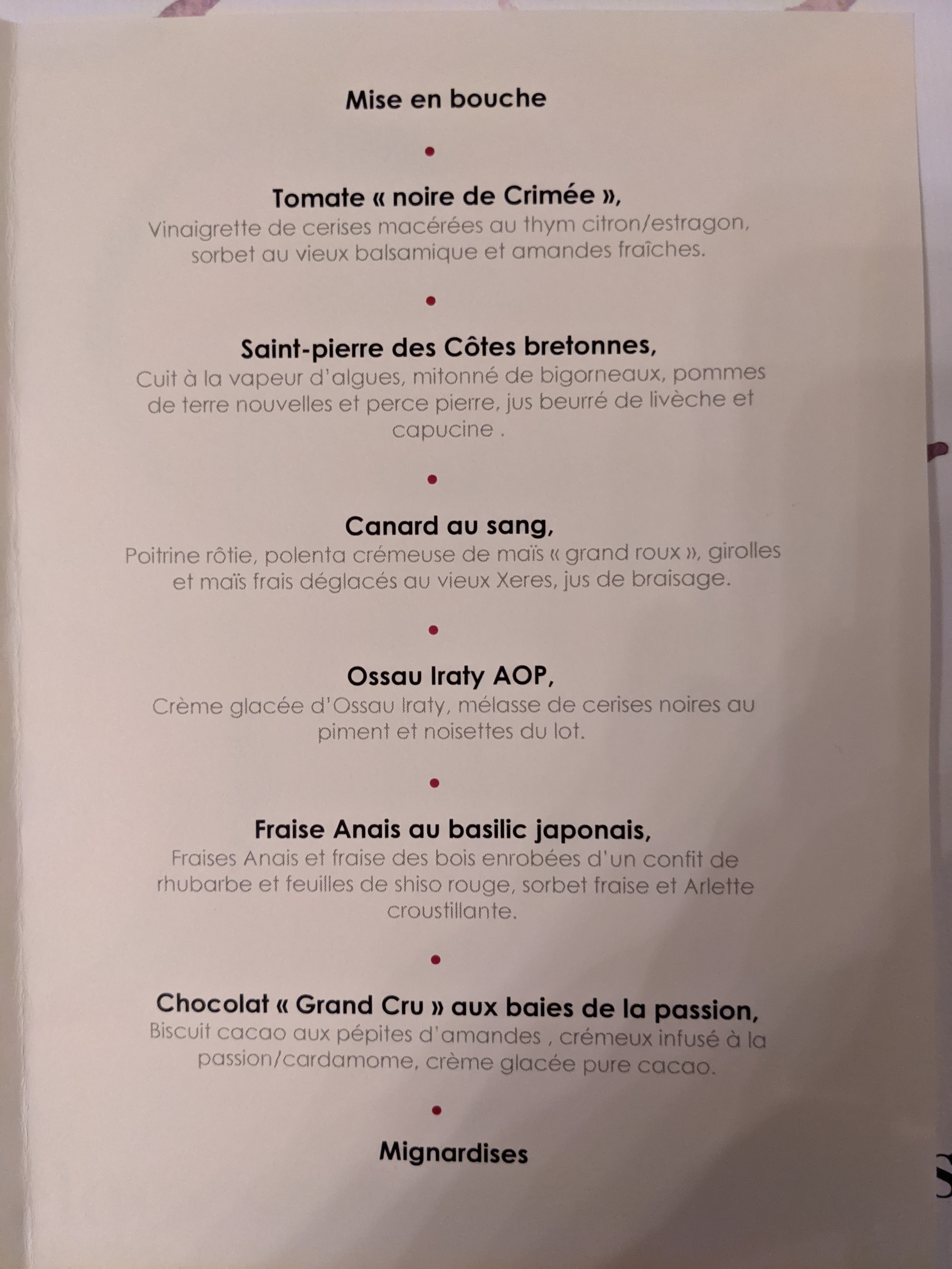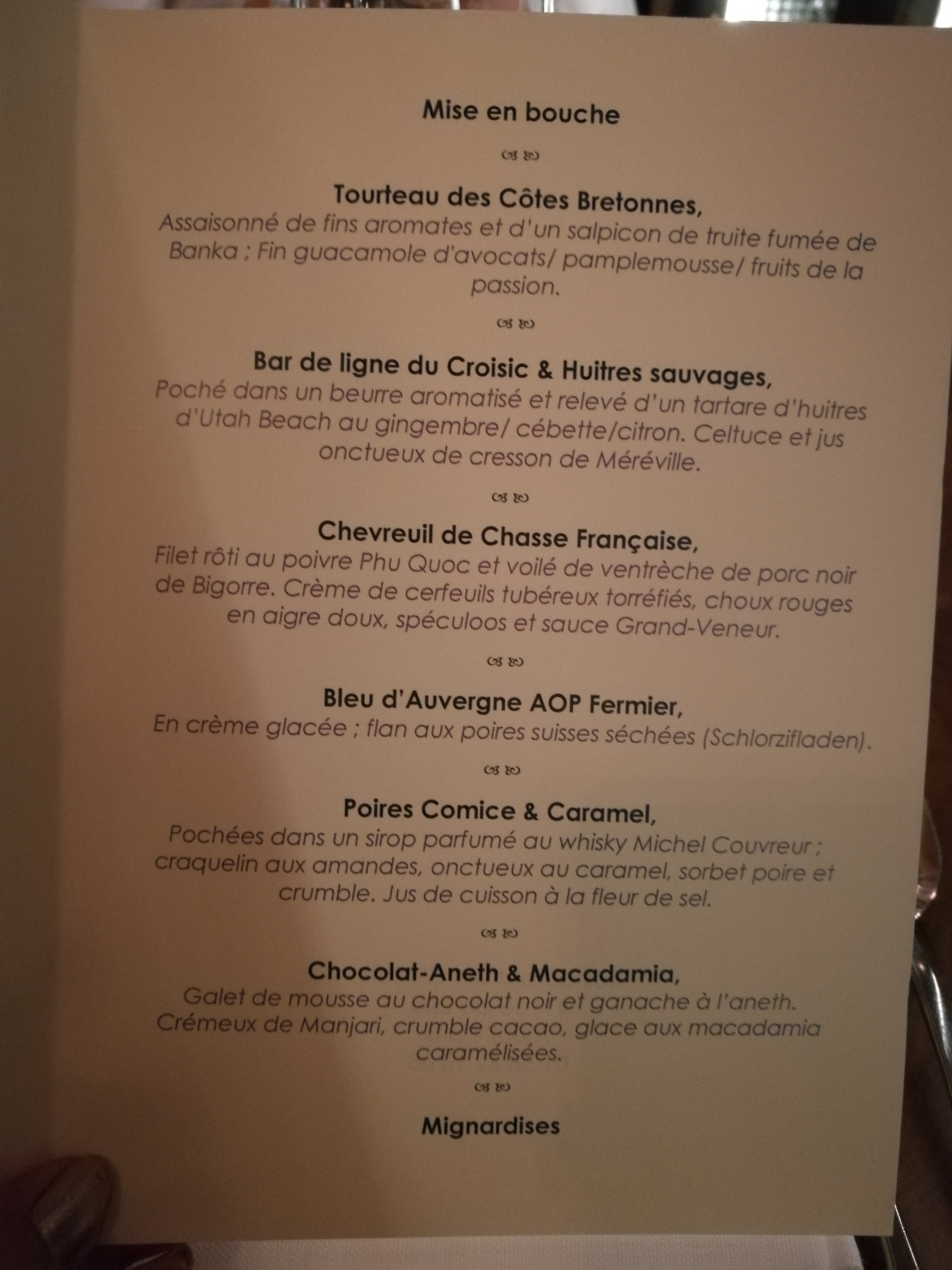 Des plats excellents (rouget, Grouse et glace au bleu d’auvergne) et des accords mets et vins biens vus, mais un service si médiocre, sans chaleur, souvent à contre-temps ... et pour tout dire, qui vous fait regretter les 240€/pers.