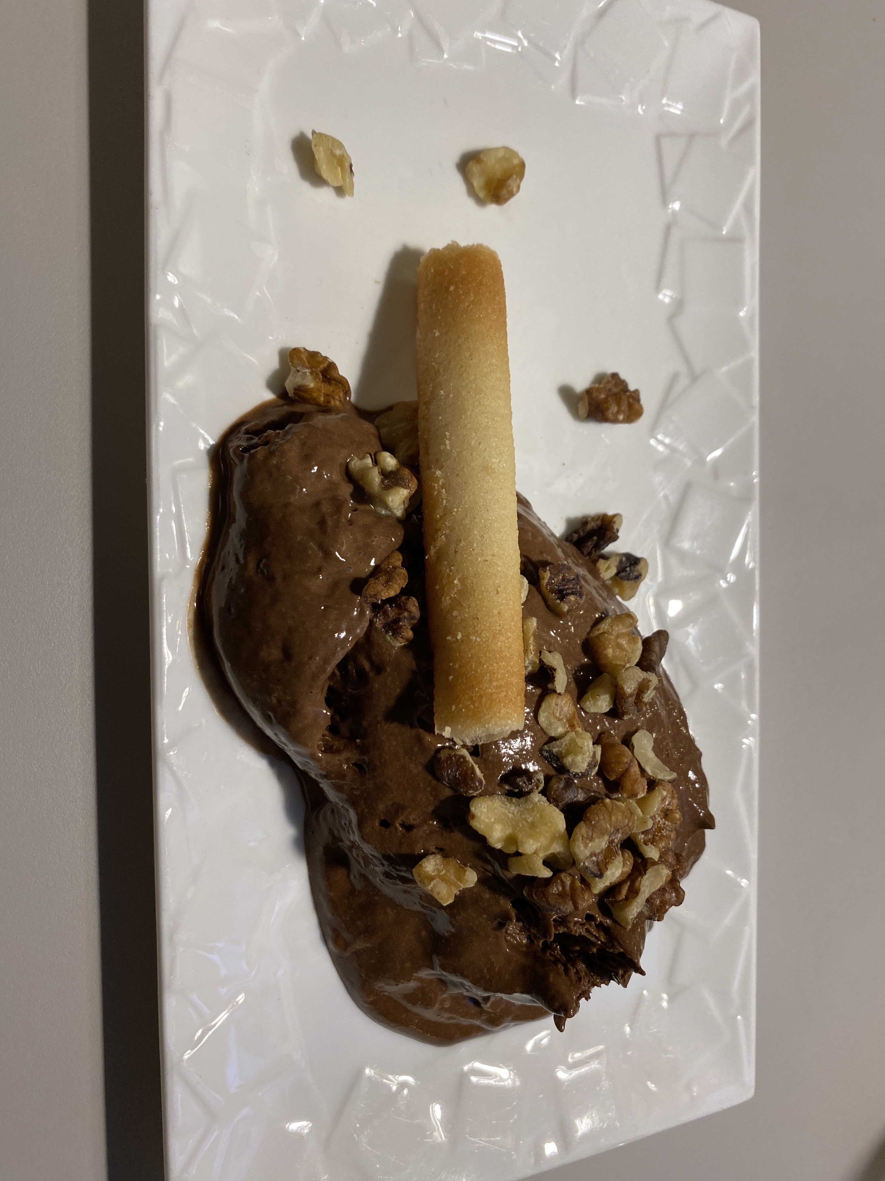 Heureusement, qu’une partie du personnel est très accueillant et souriant Car l’expérience aurait été désastreuse. Le tartare de bœuf ce résumait a de la viande hachée avec une sauce à la moutarde pas d’oignons, pas de câpres rien ni même d’œuf… L’attente entre les plats est extrêmement longue et a été observé sur plusieurs des personnes présentes dans le restaurant…. 30 min environ ! La mousse au chocolat, c’est une catastrophe : comme je l’ai indiqué au serveur, si je l’avais vu dans la rue, j’aurais évité de marcher dedans !! (Cf la photo)… attention le cuisinier confond, noisettes, caramélisées et copeaux de noix sur la mousse au chocolat. En résumé, on a juste envie que l’expérience se termine rapidement. Nous avons évité le vin car les tarifs sont inabordables et nous nous sommes rabattu sur les bières. Après discussion et argumentation, la mousse au chocolat nous a été offerte, et heureusement nous avons pu utiliser nos 25 € de The Fork.