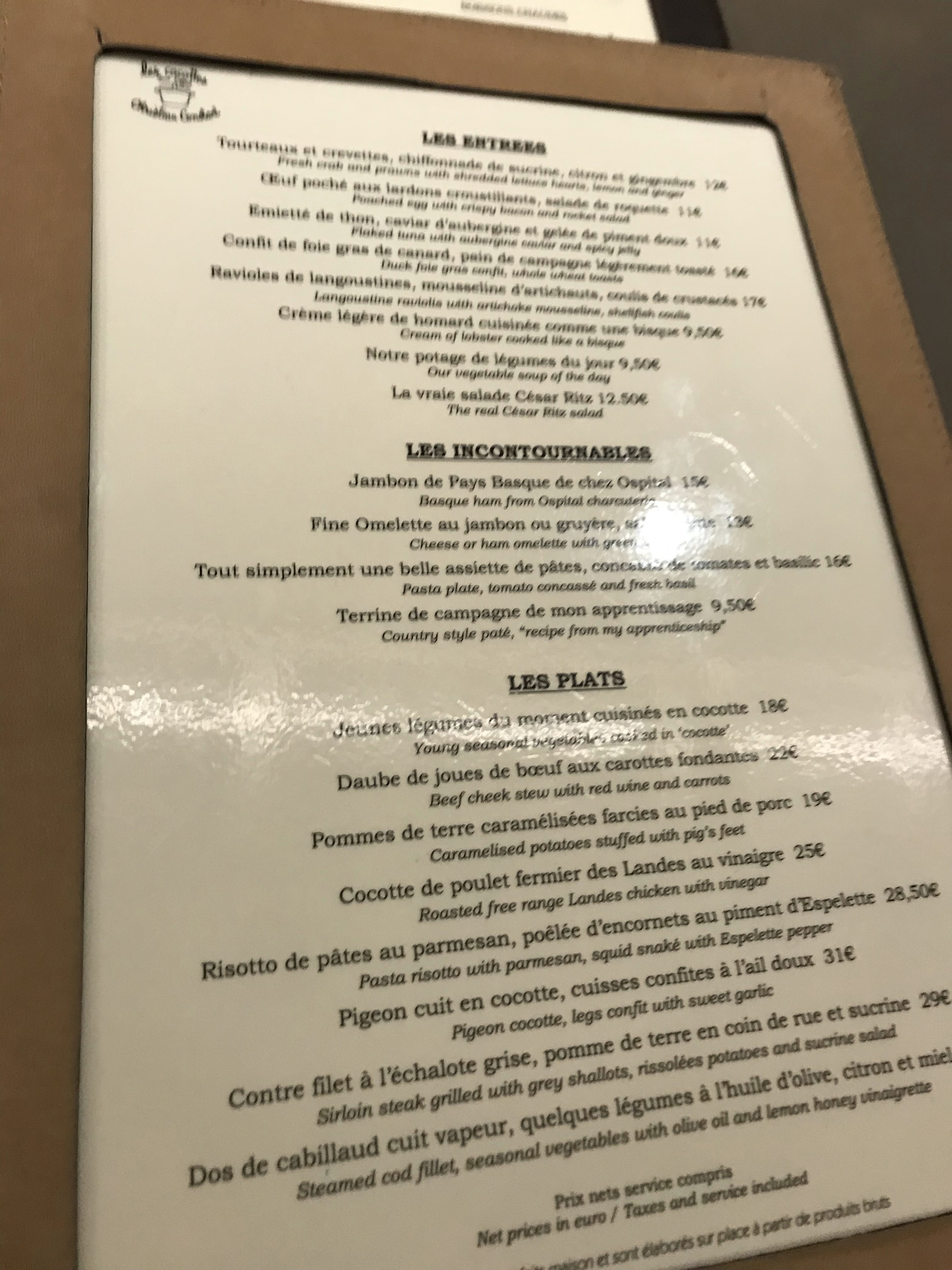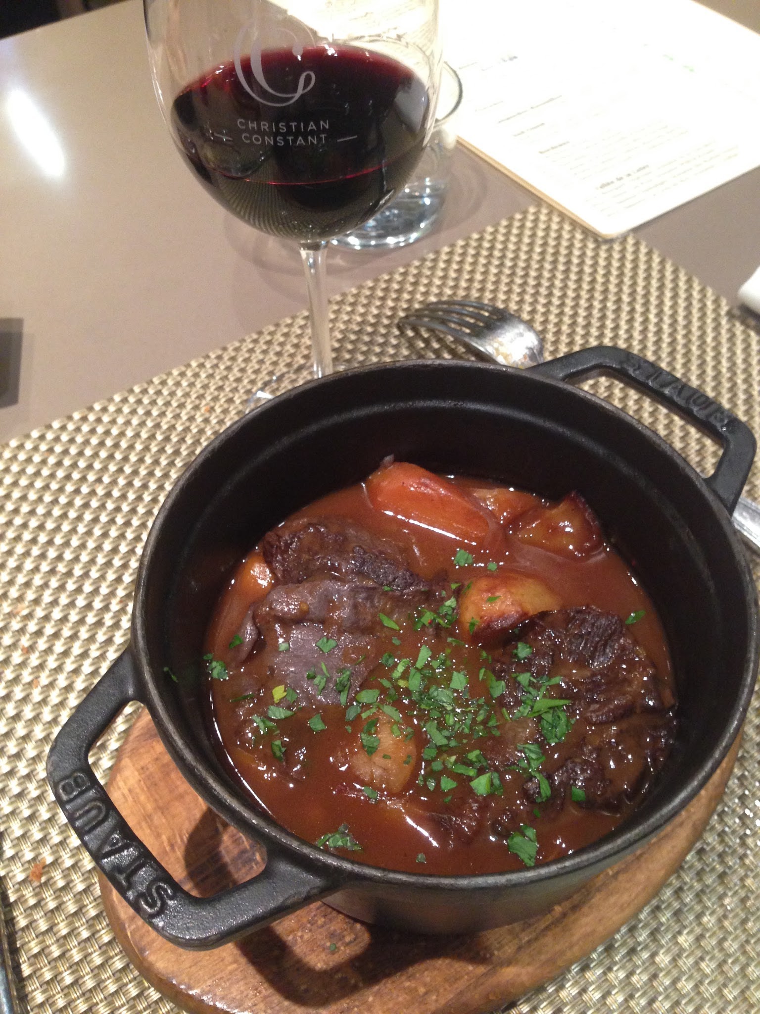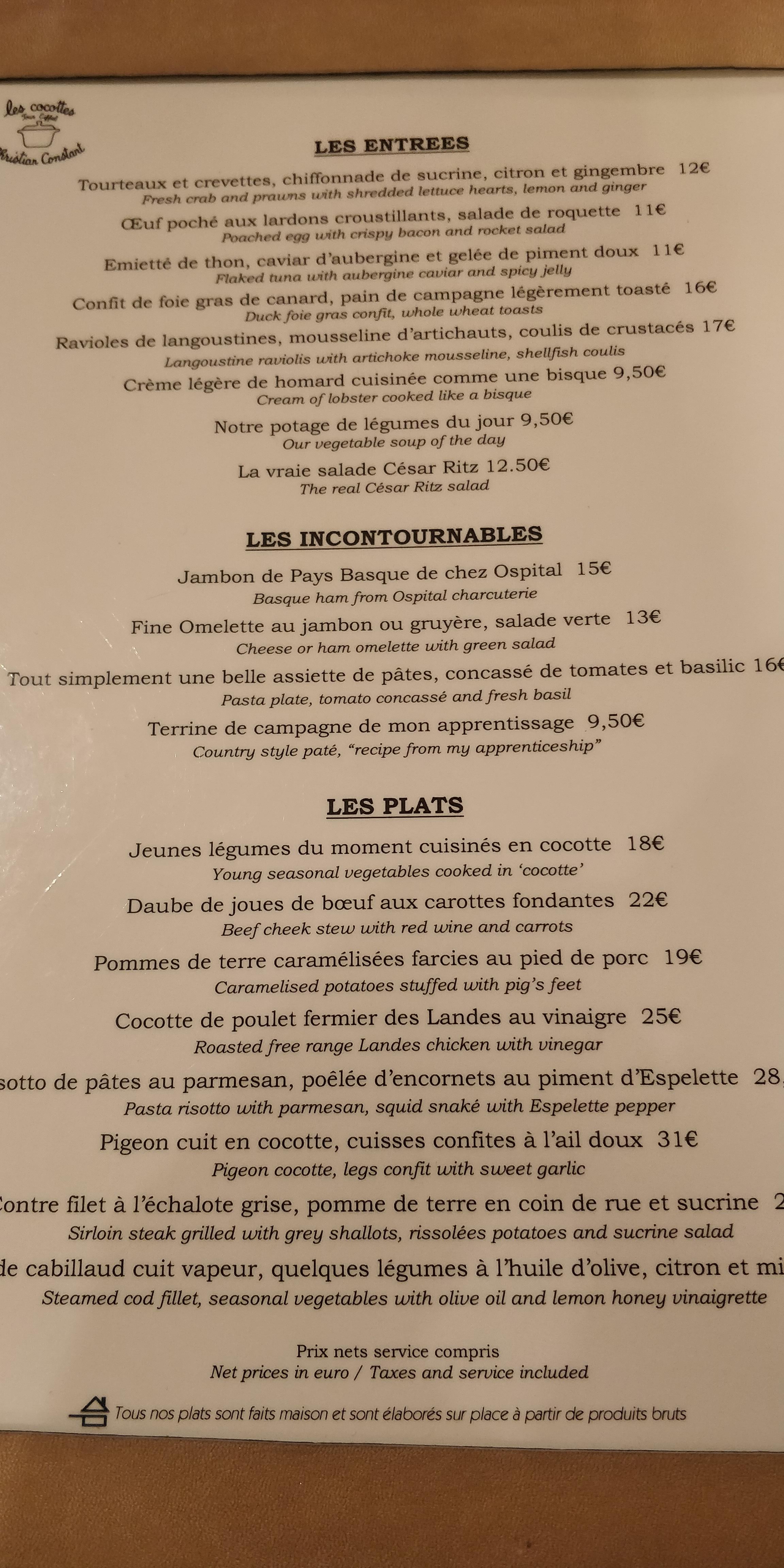 Après avoir bien apprécié notre repas en terrasse du café Constant à deux pas,et avant de réserver au Violon d'Ingres ,la version gastro, voici les Cocottes de Constant où comme son nom l'indique la majorité des plats sont servis en cocotte. Pas besoin de réserver il y a un bon turn over. Toutes les tables sont en hauteur dont une partie au bar avec vue sur la cave et les cuisines.ce soir là nous avons pu déguster un somptueux cassoulet accompagné de son verre de vin 25€ et de très bonnes Saint Jacques avec pousses d'épinards. En dessert le traditionnel baba au rhum Don Pepe ,un régal. Le personnel agréable prend le temps de vous expliquer la carte.