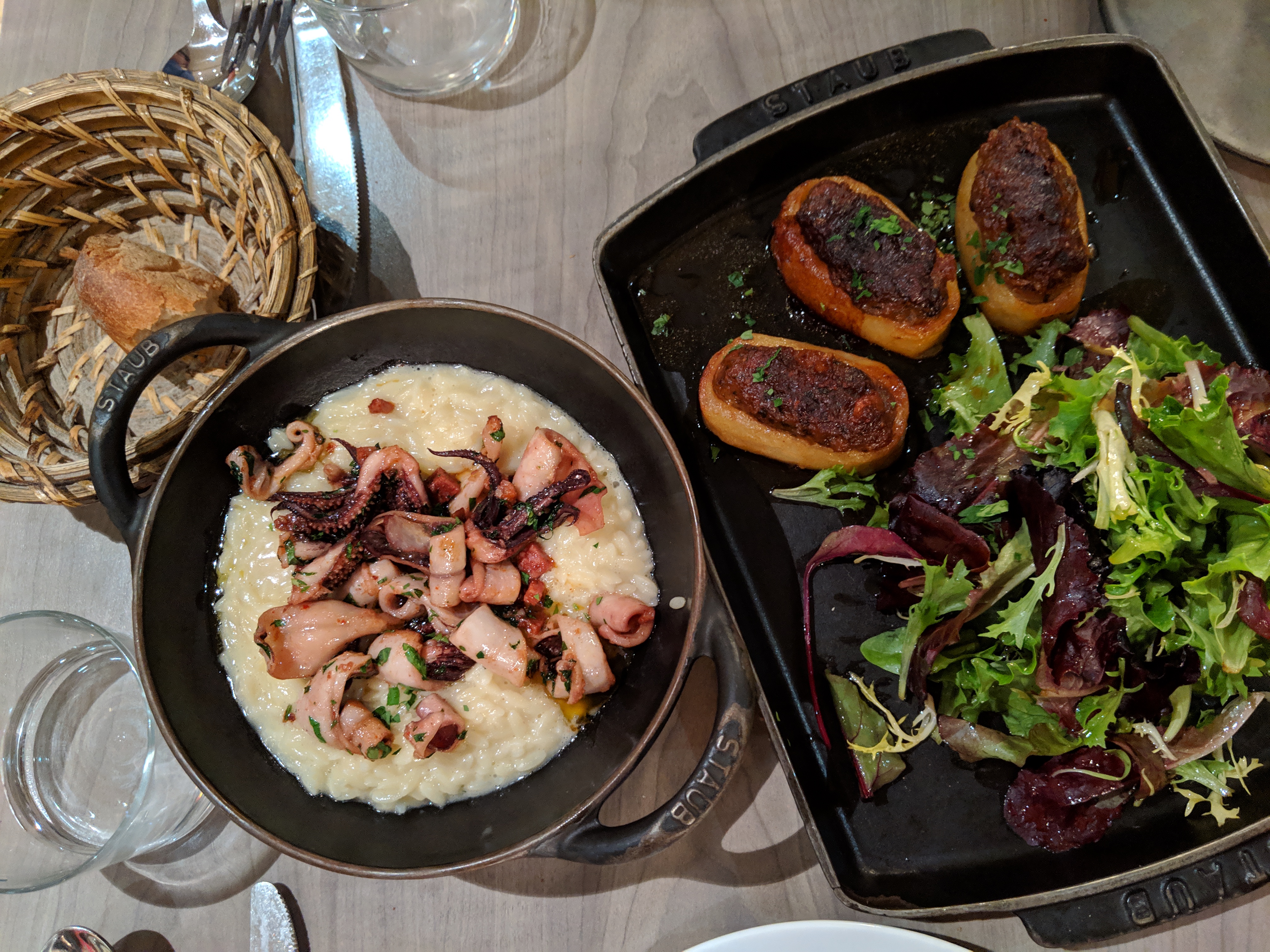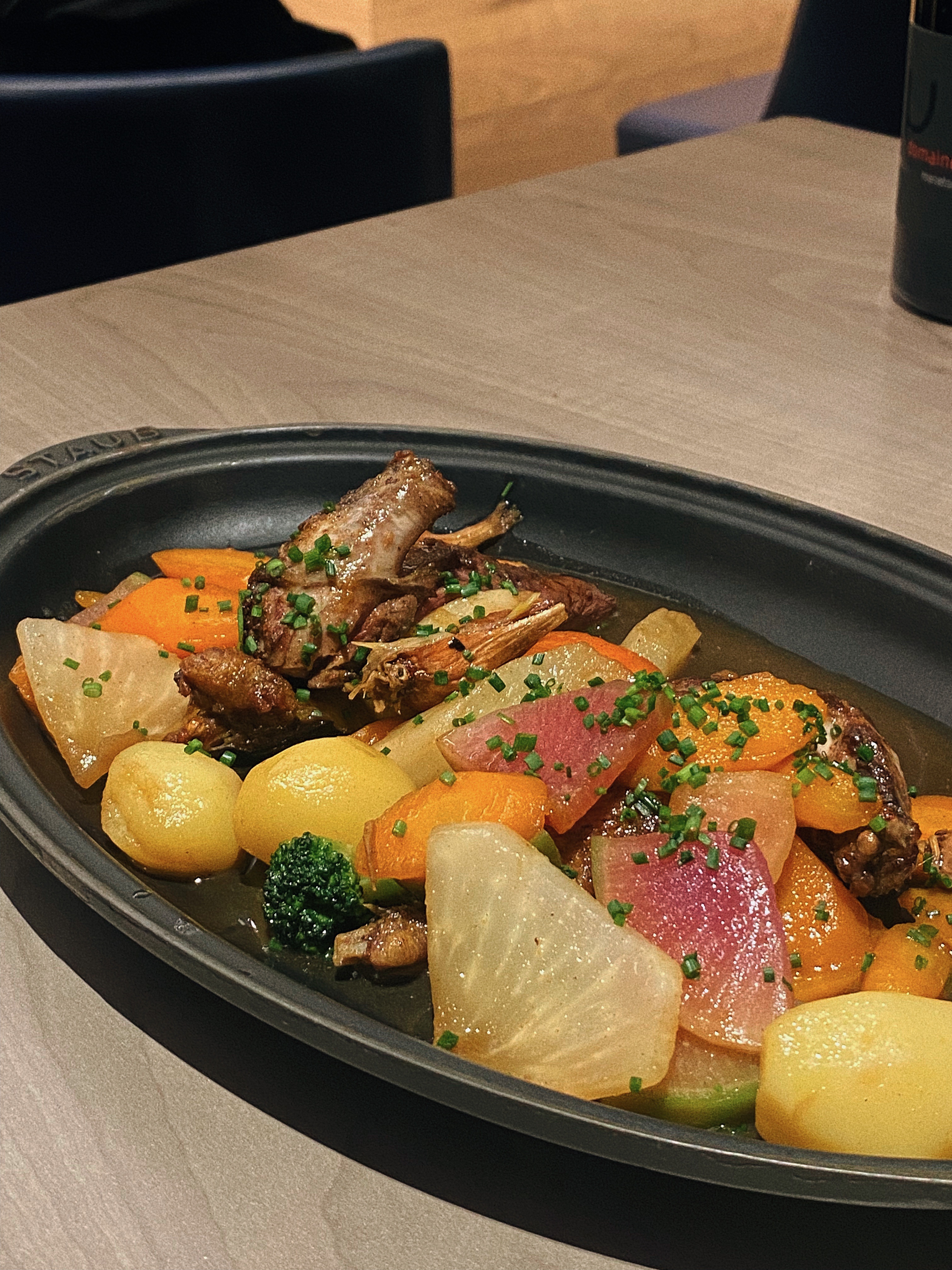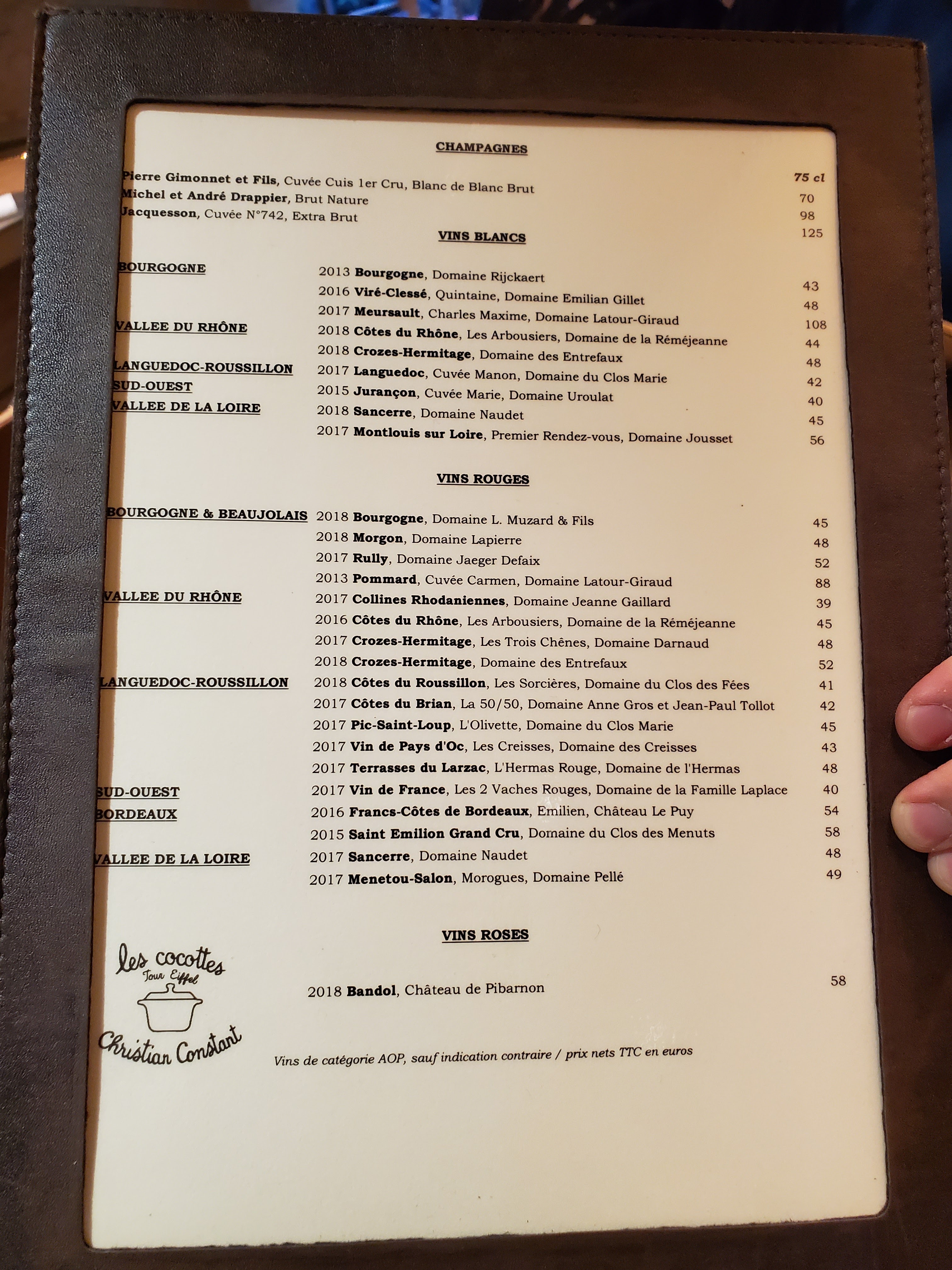 Après avoir bien apprécié notre repas en terrasse du café Constant à deux pas,et avant de réserver au Violon d'Ingres ,la version gastro, voici les Cocottes de Constant où comme son nom l'indique la majorité des plats sont servis en cocotte. Pas besoin de réserver il y a un bon turn over. Toutes les tables sont en hauteur dont une partie au bar avec vue sur la cave et les cuisines.ce soir là nous avons pu déguster un somptueux cassoulet accompagné de son verre de vin 25€ et de très bonnes Saint Jacques avec pousses d'épinards. En dessert le traditionnel baba au rhum Don Pepe ,un régal. Le personnel agréable prend le temps de vous expliquer la carte.
