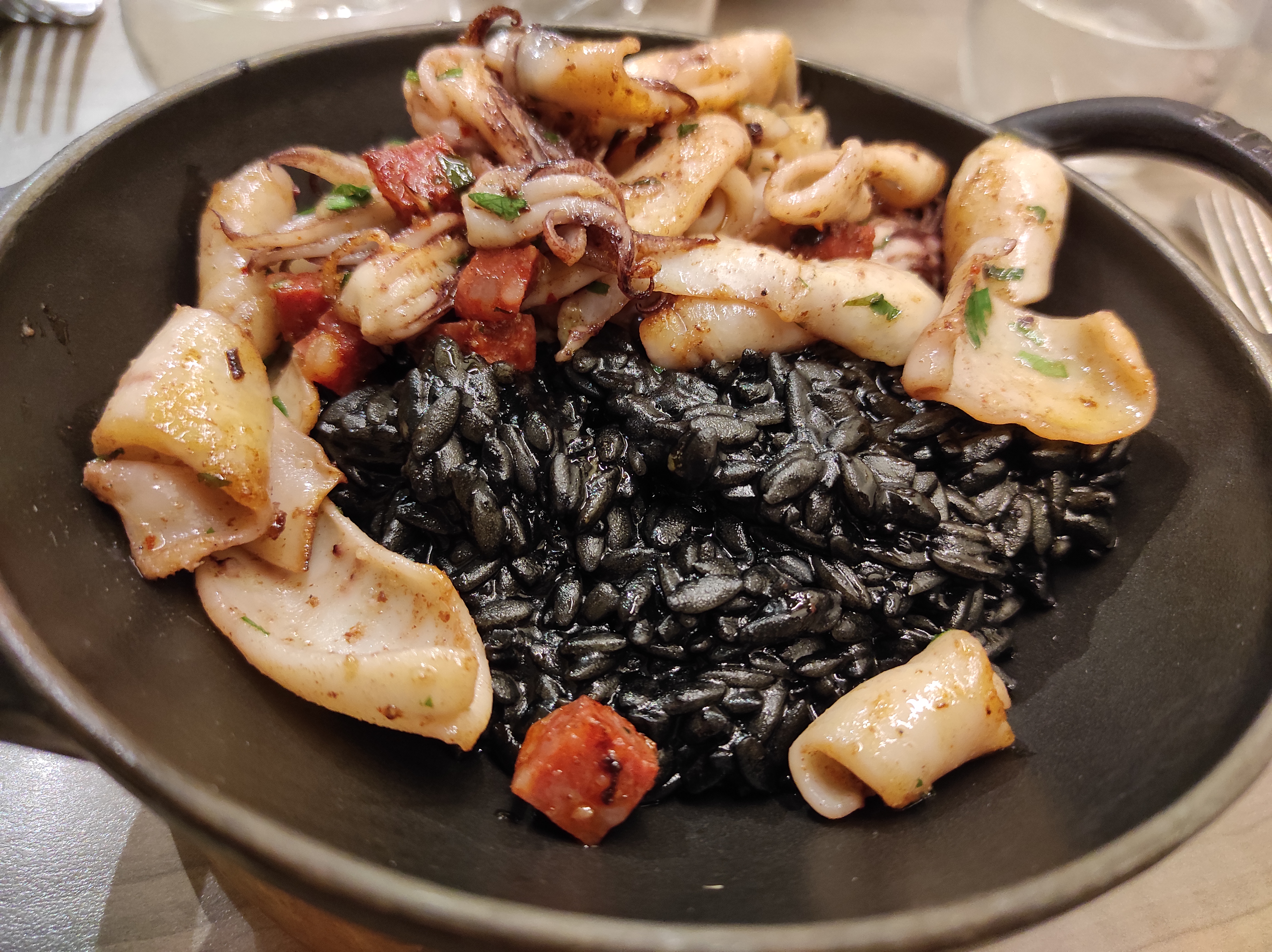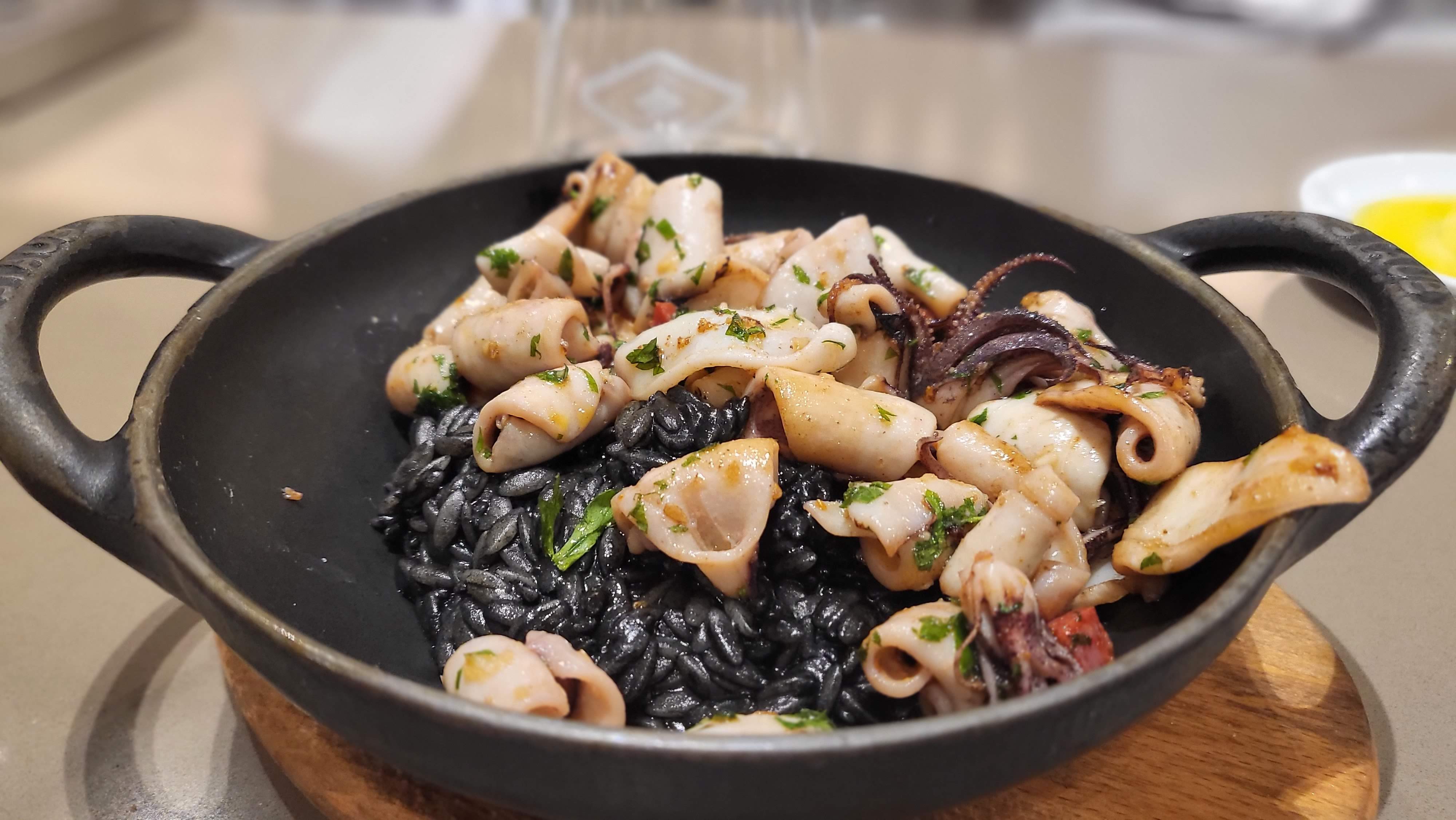 Essayez le riz à l'encre de seiche !!! Le meilleur que j'ai jamais eu. C’est aussi un très bon prix. Le serveur est un gentleman chic et a fait un travail fantastique. Il a même constamment essuyé tout liquide renversé sur notre table. Je reviendrai certainement.