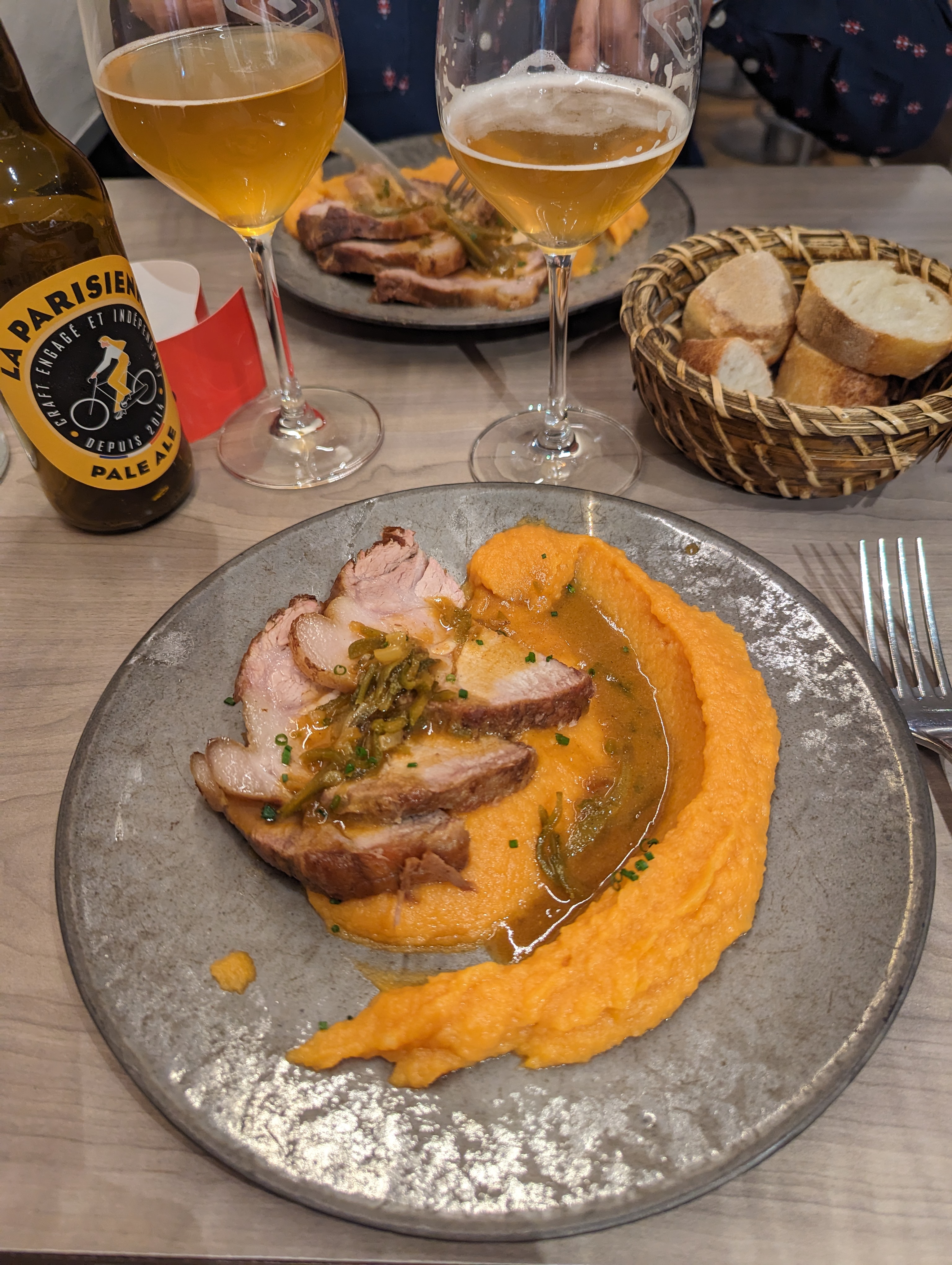 Nous avons eu un repas fantastique. Un restaurant parisien très typique, petit, tables très rapprochées. J'ai eu des saucisses et de la purée de pommes de terre, ce qui était incroyable. La corbeille à pain était toujours pleine. Il y avait beaucoup de monde et le barman était très gentil. Quelques minutes d'attente sans réservation et nous étions attablés.