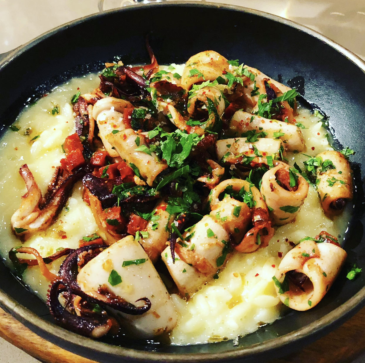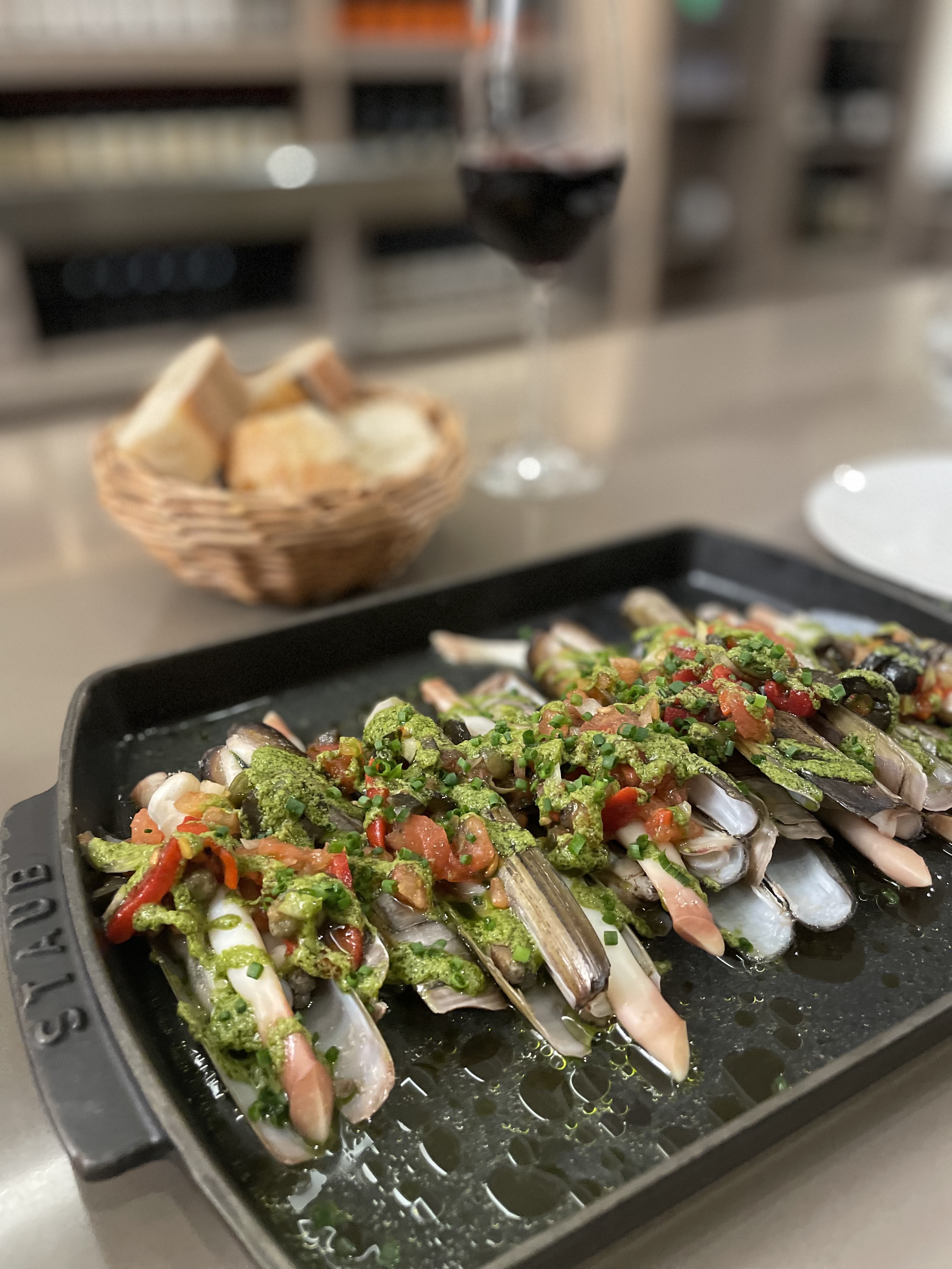 Je donnerai à cet endroit 3,5 étoiles. Le service était excellent et le risotto aux calamars était au rendez-vous. Cependant, le couteau était une grosse déception ! C'était très mal cuit au point qu'il avait un goût de poisson. J'ai essayé de le finir mais je n'y arrive pas, car j'avais l'impression que j'allais vomir. La sauce tomate et pesto ne se marie pas bien avec la palourde, elle enlève la douceur de la palourde. J'aimerais qu'ils le fassent simplement griller dans une sauce au beurre et à l'ail. 2 entrées et un plat plus un verre de brut coûtent 85 euros, un peu élevé pour la portion.