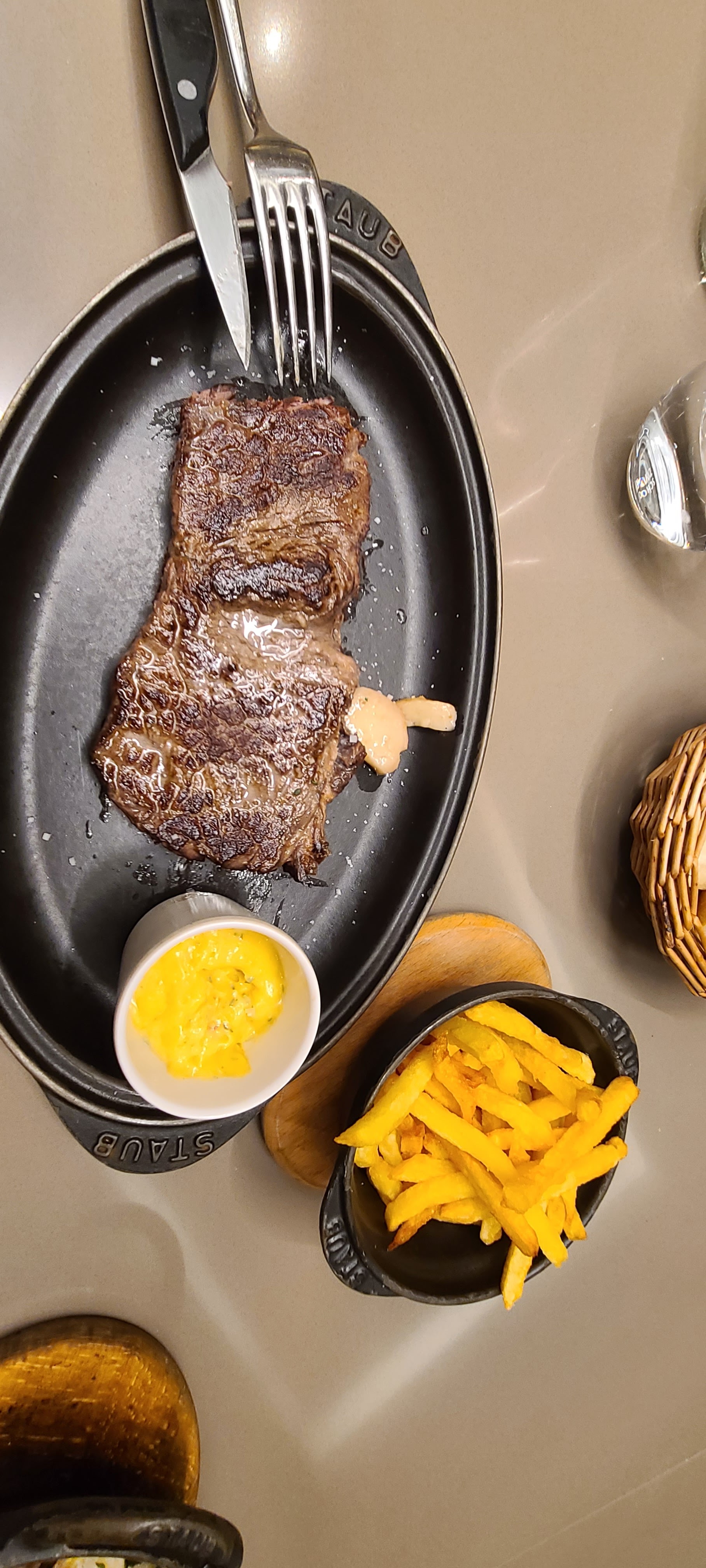 J'ai pris ma côte de steak à point, mais elle a plutôt le goût d'un élastique et comme vous pouvez le voir sur la photo, ils ne cuisent pas correctement le tendon de bœuf. Ce n'est certainement pas ce à quoi je m'attendais. Le Bordeaux 2016 est le seul meilleur de ce repas au 30/01/2023