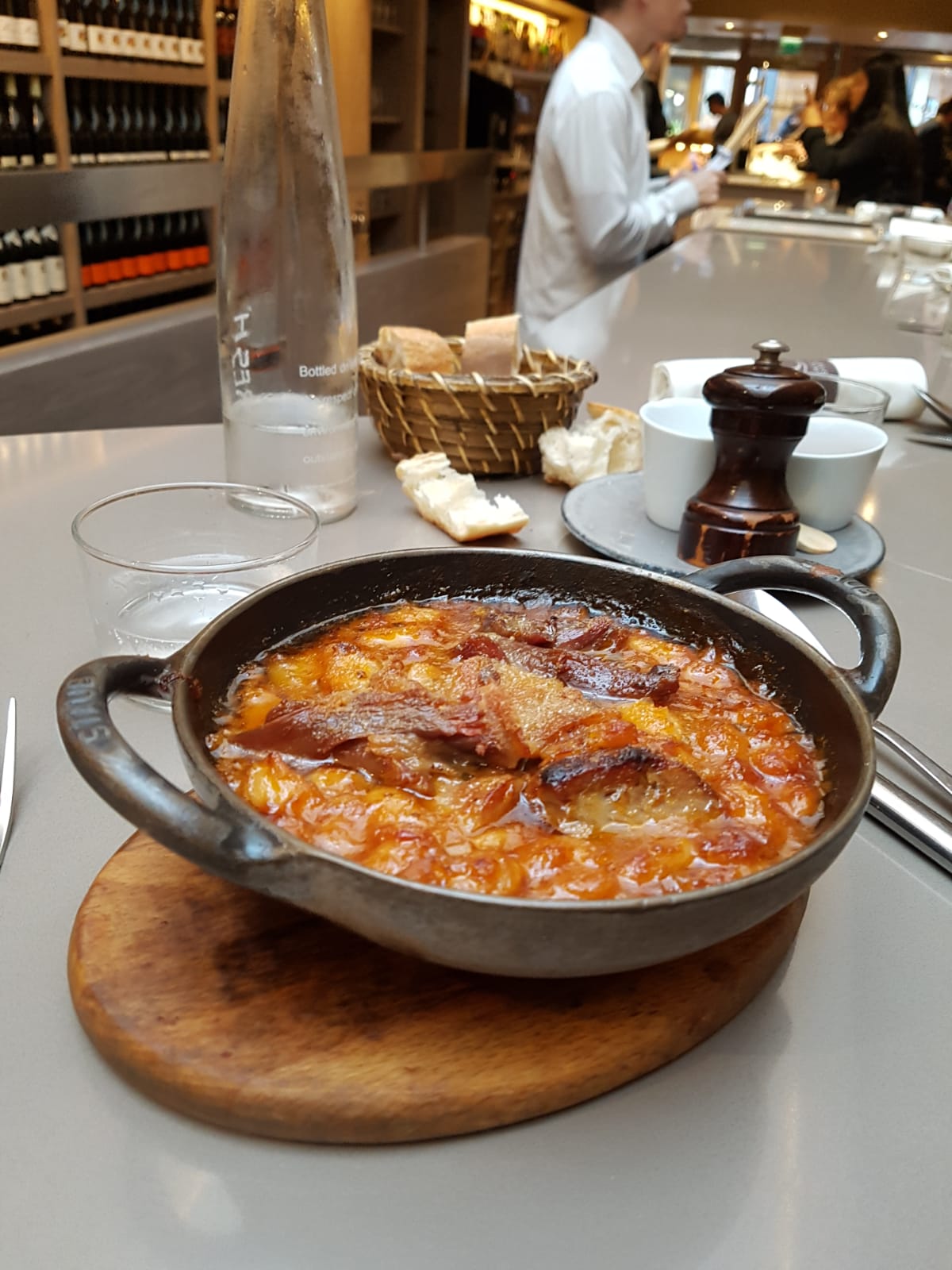 Assis près du bar et servi par Jonathan qui faisait des blagues et offrait des conseils sur ce qu'il fallait commander. Il m'a raconté des histoires selon lesquelles autrefois seuls les rois étaient servis des pigeons et étaient un plat préféré de Napoléon. Maintenant, je ne suis pas du genre à aimer la nourriture raffinée et je considère mes papilles gustatives comme plutôt amateurs, mais je dois féliciter le service exceptionnel de mon homme Jonathan. Il a réussi à me convaincre d'acheter ce pigeon qui, certes, n'était pas vraiment mon truc et que je ne commanderais plus. Mais soyez servi par lui une fois et vous souhaiterez un Jonathan partout