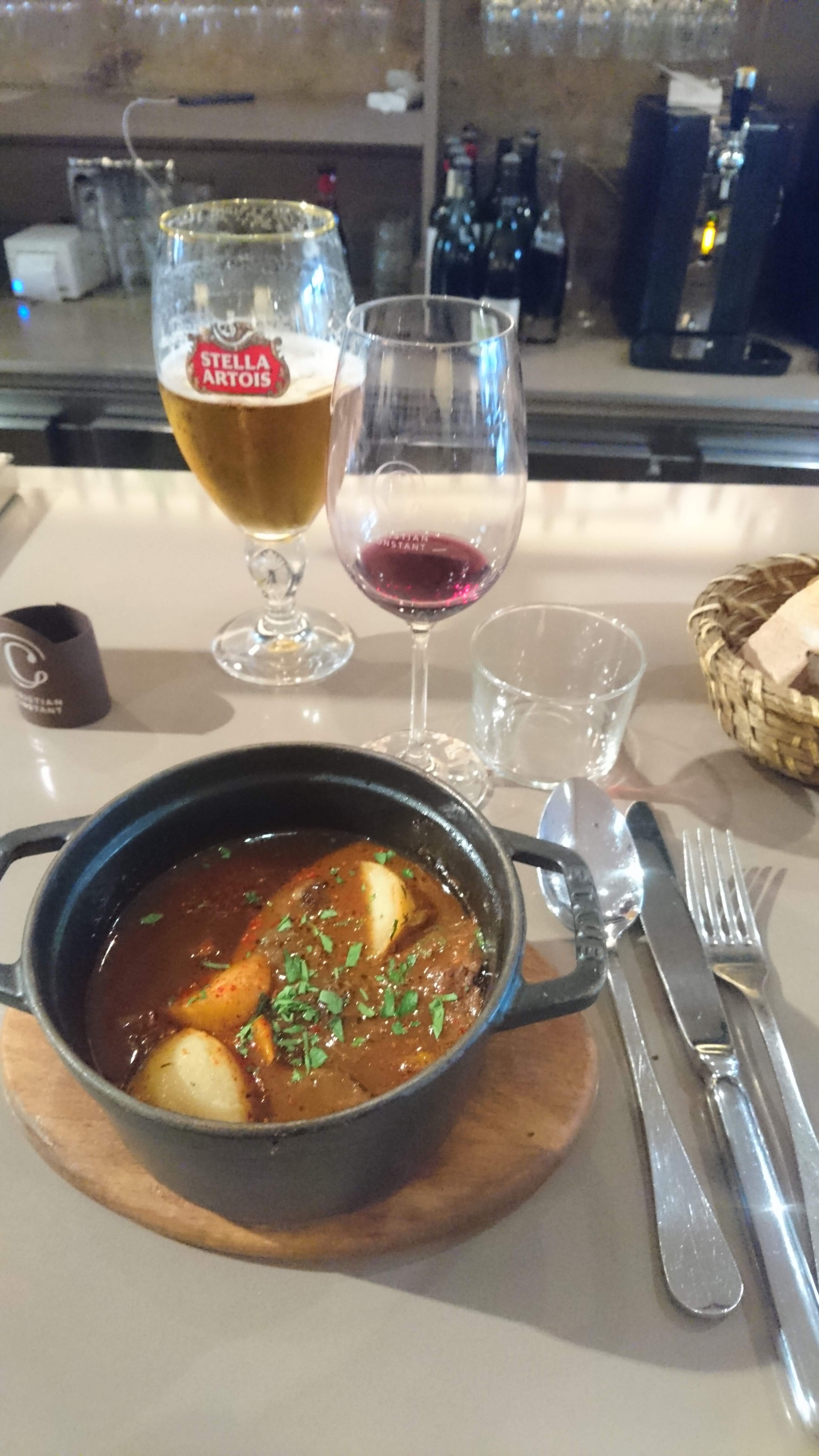 Dîner absolument délicieux. Plusieurs plats sont servis dans des petits pots (les cocottes). La nourriture était excellente et le service était merveilleux. Nous avons tous les deux mangé un bœuf bourguignon. Excellent!!! Nous avions tous les deux du vin aussi. Excellent service également.
