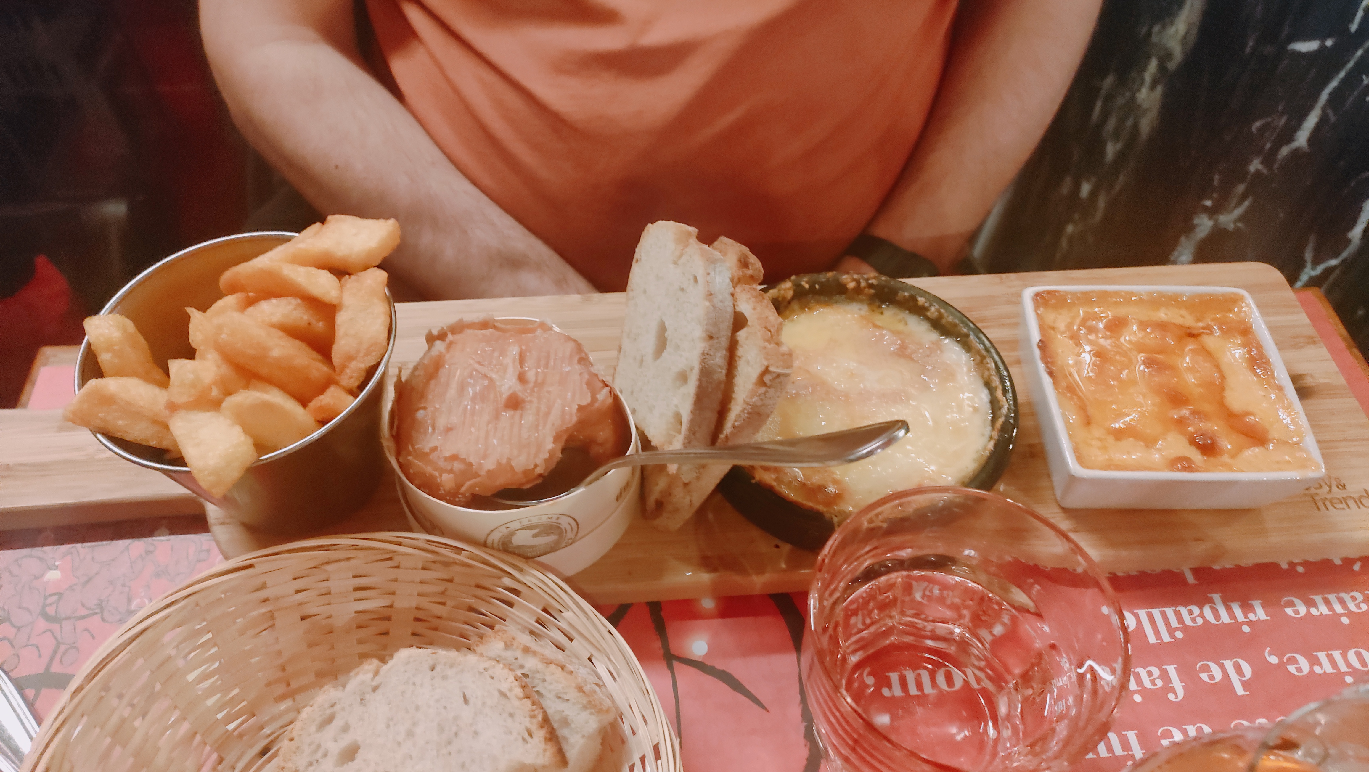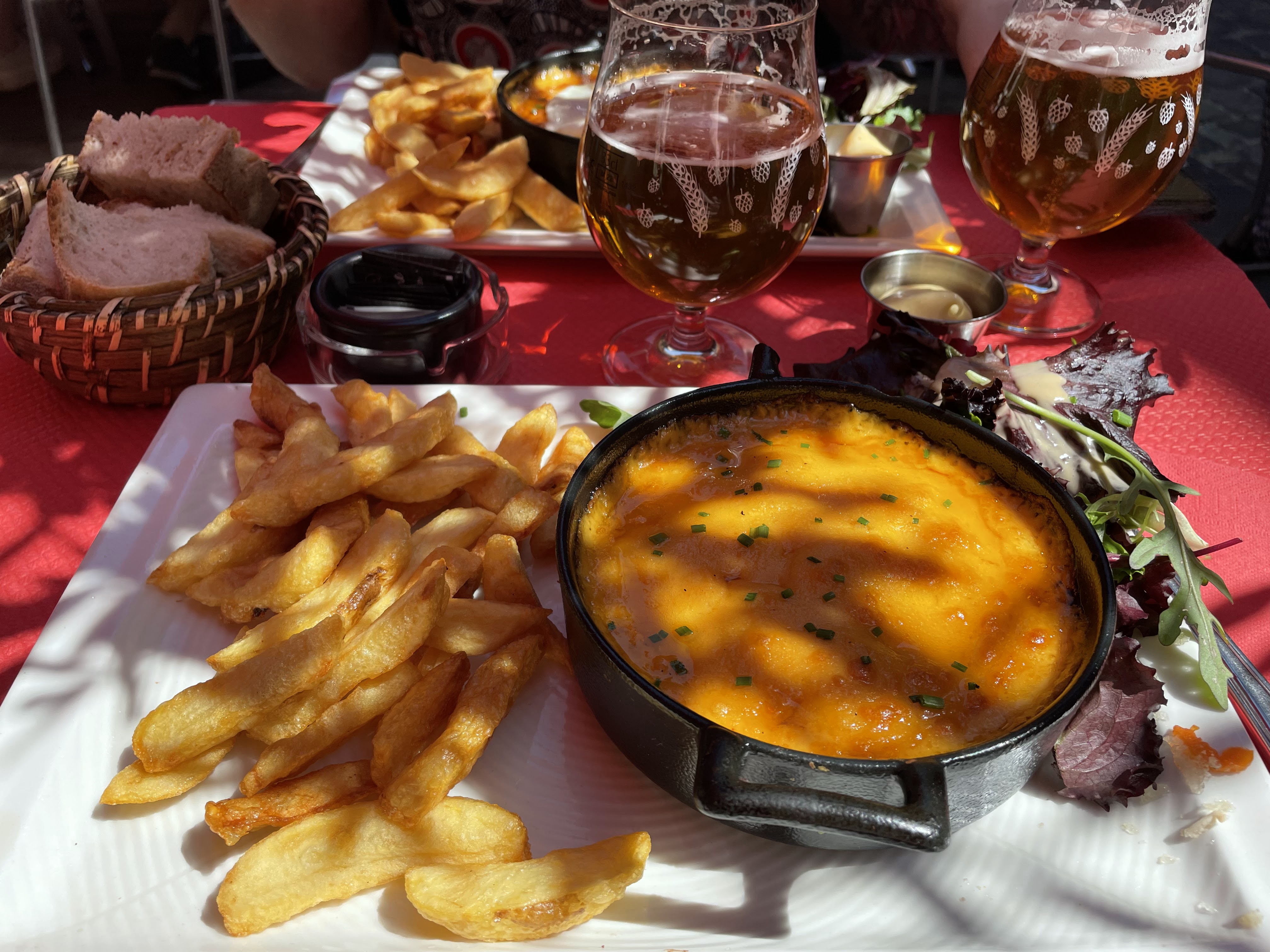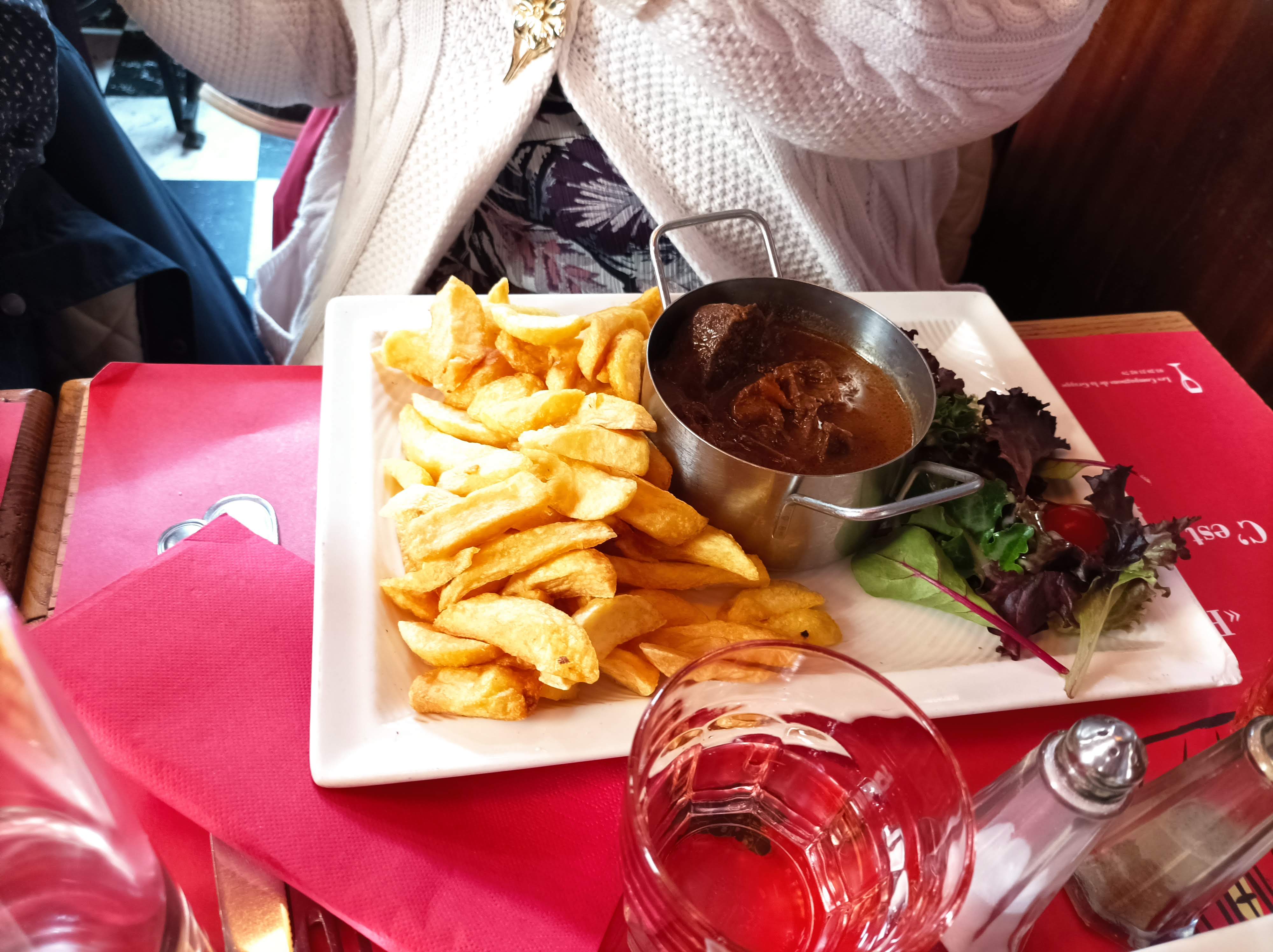 Un vin qui sert de vinaigrette pour la salade et mon seul bout de viande pour ma carbonade. Contrairement à mes camarades, je n'ai eu un welsh à base d'huile de friture, l'huile dégoulinant de l'assiette tout le long du repas. Un vomis ou une diarrhée pour toute la nuit ?