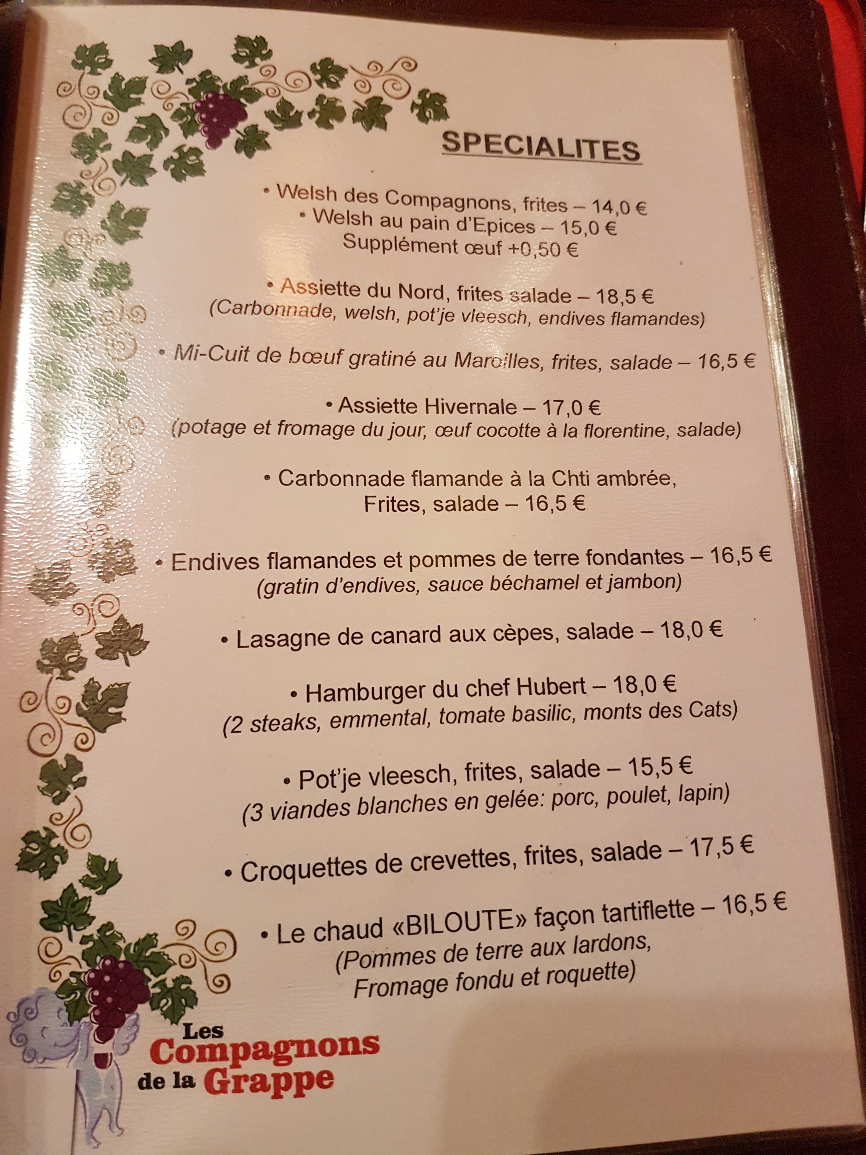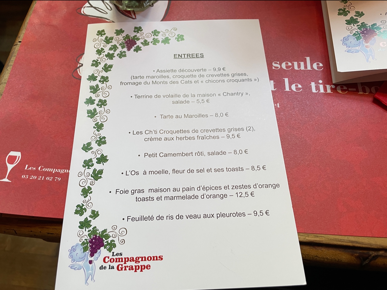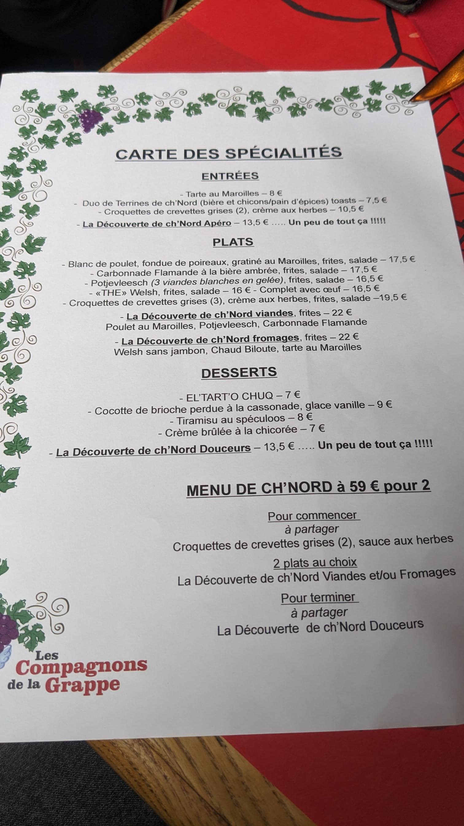 Foncer les yeux fermés! Si vous recherchez un petit coin calme et traditionnel pour passer une bonne soirée en dehors de la pression de la ville, vous serrez servit!! Le restaurant est complètement dépaysant, les serveurs sont à l’écoute et d’une politesse plus qu’appréciable. Côté cuisine; la restauration proposée est traditionnelle du nord et de très très bonne qualité. Les plats sont fait avec des produits frais et locaux. C’était un régale!! Vous êtes sur d’être complètement calé et ravit après votre passage aux Compagnons de la Grappe!! Bon appétit:)