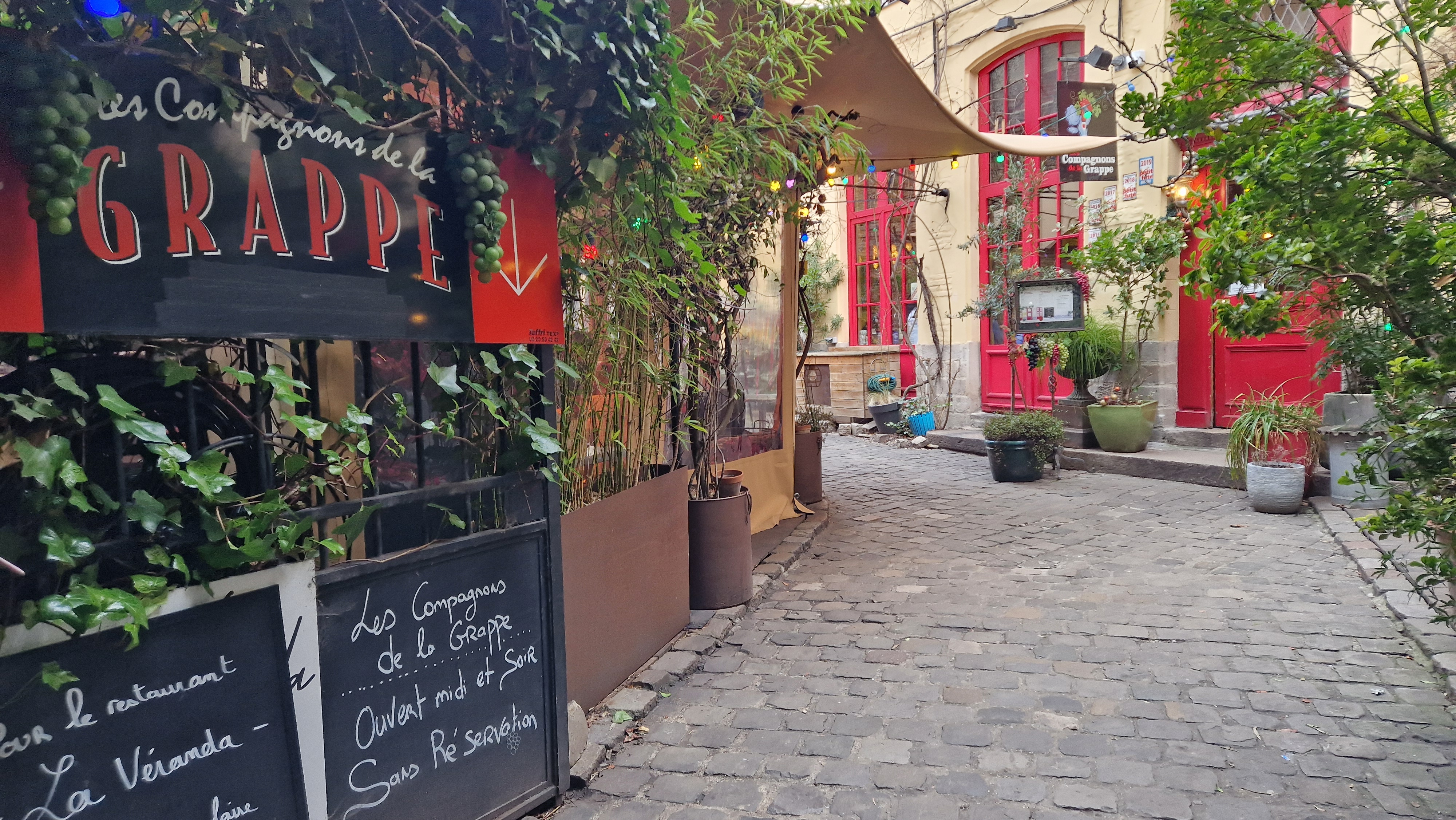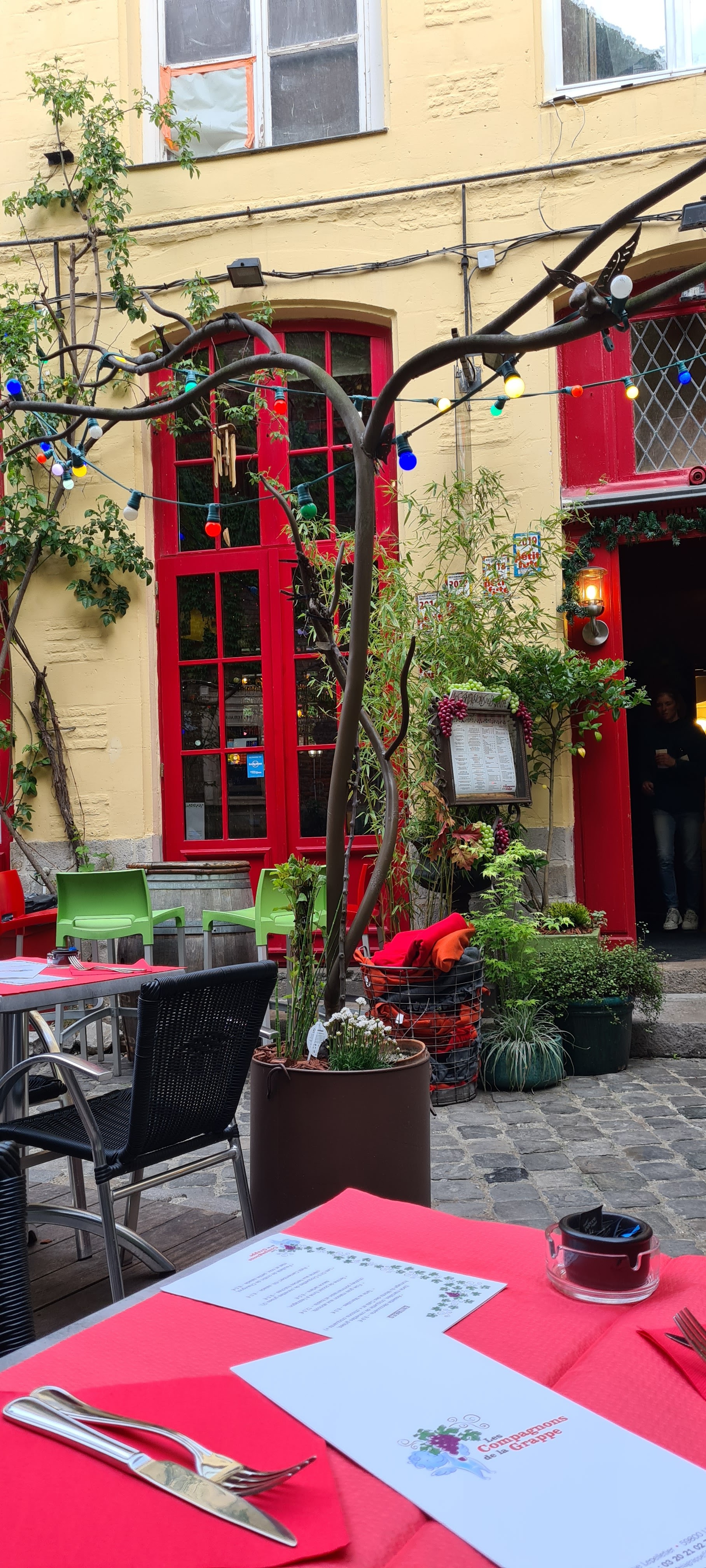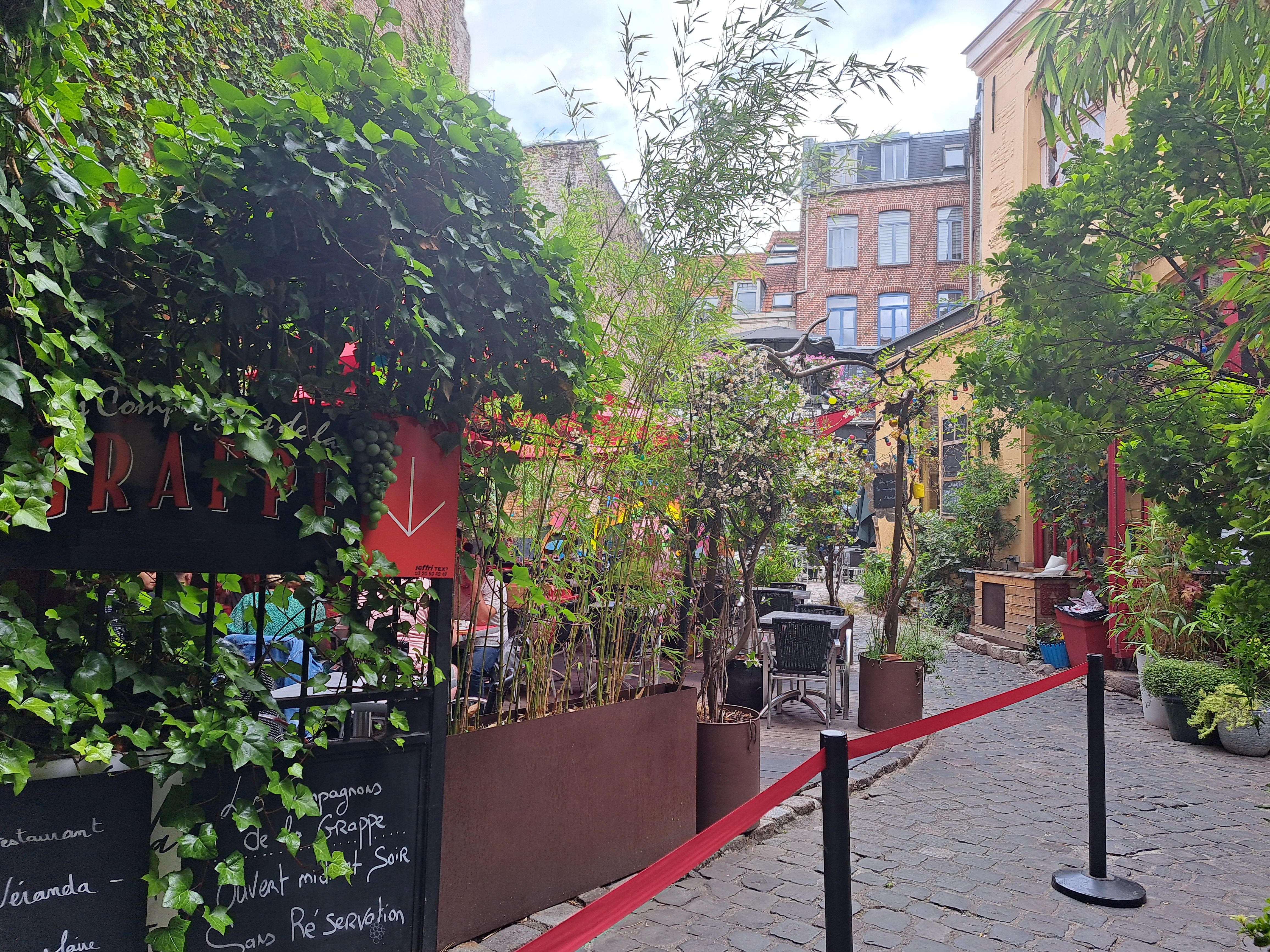 En plein centre-ville du VIEUX-LILLE ( au 26, rue Lepelletier à 59000 LILLE, tel = + 33 3 20 21 02 79, ouvert 7 jours sur 7), un porche vous amène à une ravissante petite cour verdoyante accueillant la terrasse du restaurant LES COMPAGNONS DE LA GRAPPE. L'intérieur de ce restaurant est tout aussi sympathique et chaleureux, aux différentes salles colorées et décorées de meubles, de bibelots divers sortis tout droits de chez l'antiquaire ou le brocanteur. Dans cette ambiance décontractée, est servi, par une équipe de serveurs aimant leur travail, une savoureuse cuisine locale. Un établissement autant prisé par les locaux que par une clientèle internationale ; il vaut mieux reserver à l'avance pour y avoir une table!... et la grande terrasse CHAUFFÉE : 1 Réel plaisir de profiter d'1 bon repas