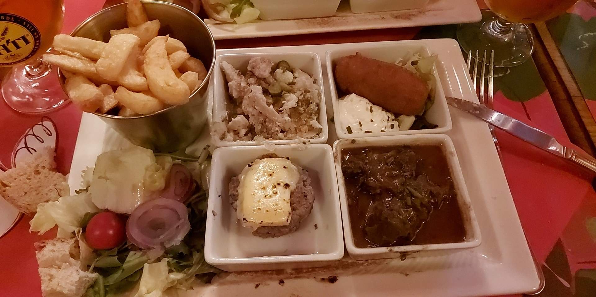 Honnêtement, j'avais de gros doutes. Un restaurant qui me paraissait un piège à touristes : spécialités locales, multi-référencé, en plein quartier touristique.... Et bien se fût une magnifique découverte bien loin de mes a priori. Le personnel est agréable ; la décoration éclectique et chaleureuse. Le menu découverte est une dinguerie : croquette aux crevettes en entrée (bon là, il y aurait pu y avoir plus de crevettes dedans mais c'est sans doute la recette chti). Deux planches avec : poulet au Maroilles, potjevleesch, carbonnade flamande, welsh, Chaud Biloute et tarte au Maroilles. Et pour finir le dessert découverte : El 'tart' o chuq, cocotte de brioche perdue à la cassonade et à la glace vanille, tiramisu au speculoos et crème brûlée à la chicorée. Un tour d'horizon de la cuisine Chti. Régressif, goûteux, roboratif. On reviendra, c'est juré !