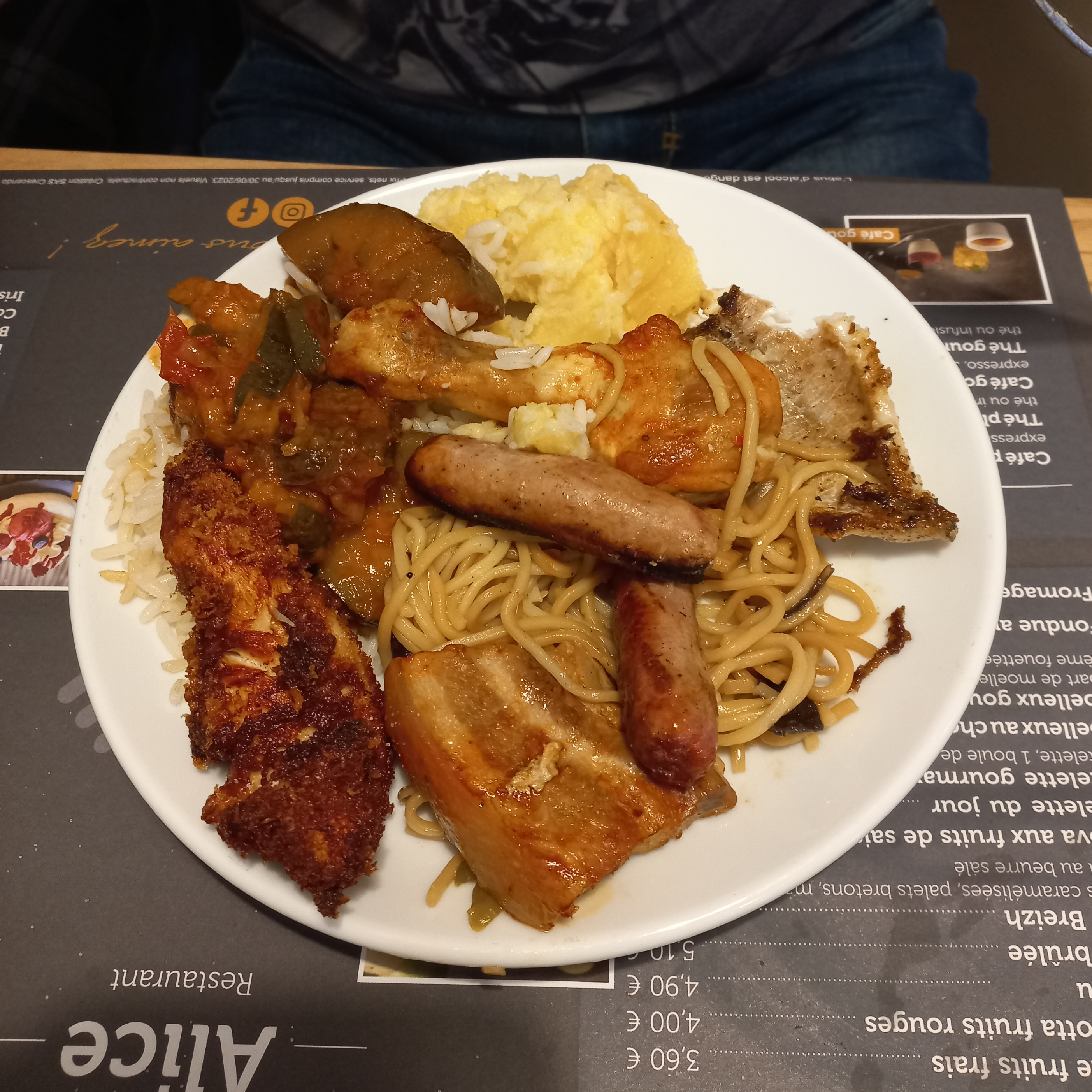 Un peux déçu je ne pensse pas revenir, pas beaucoup de choix en plas , je me suis servie au selfs pris une ou 2 entrée , ensuite pris un peux de plats chaud mais il n'y avais vraiment pas grand chose et pareille il ni avais plus rien dans les casserole il n'avait pas recharger ... et en proposition non plus pas grand choix a part le burger... ou il mets la viande et 2 morceaux de pain ... dommage il n'impose pas de plat directement a l'arrivée comme lenciens restaurant , il yavais des desserts a la carte mais asser chére , verre a vins salle ... et le serveur asser rapide on attandais des invités qui n'était pas encore arrivé qui demaner déjà se que on voulais boire nous lui avons donc dit que nous attandion tout le monde . Donc asser presser dommage. En tout j'en ai eu pour 60euro pour des plats ou je me suis servie au self , les desserts , boisson , pour 2adulte et un enfants . Je suis sortie javais encore faims...