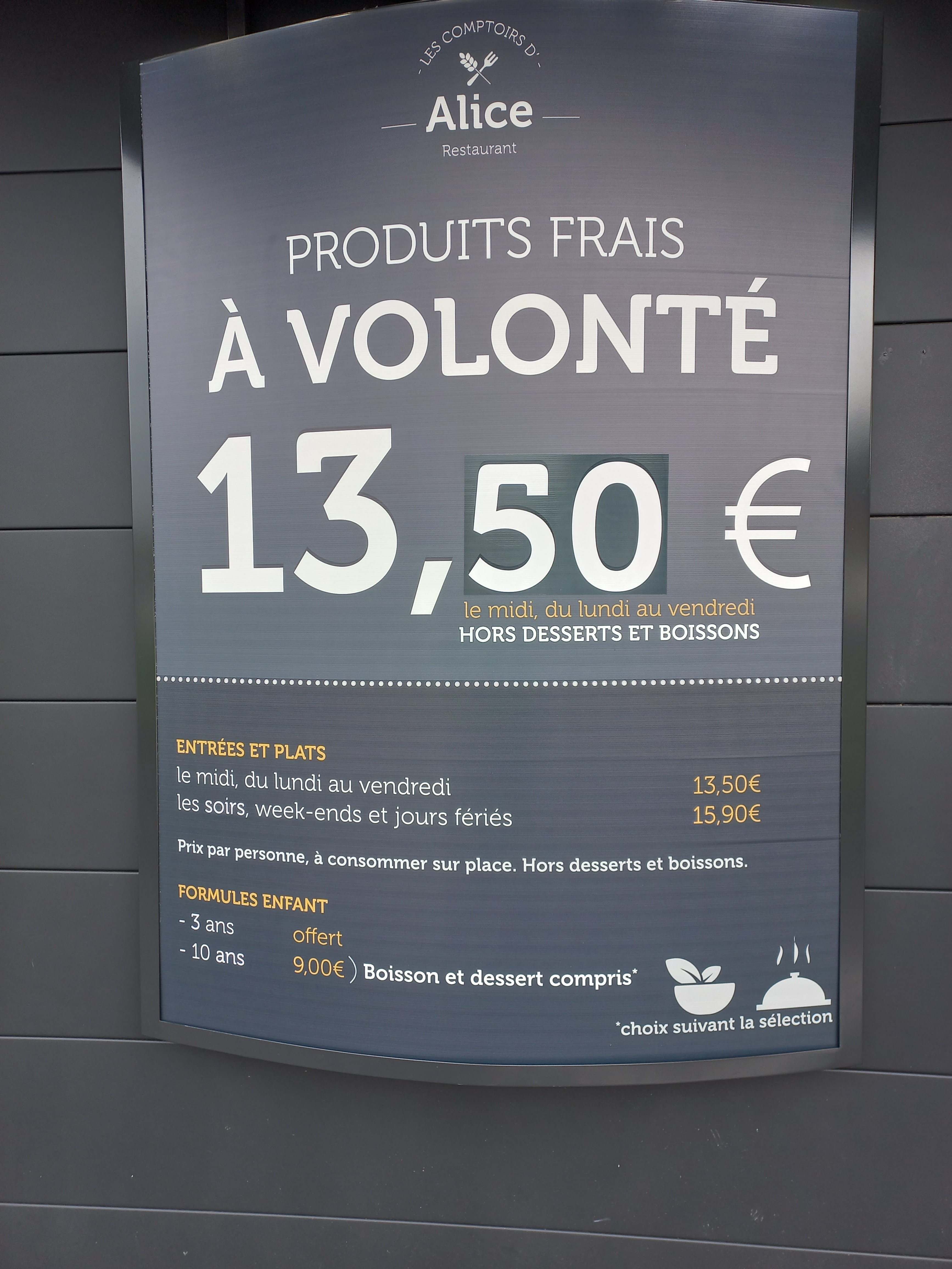 Une très belle découverte, pour un second passage, après la déconvenue de l'ancienne formule Casino. Désormais, avec le Comptoir d'Alice, vous entrez, vous mangez à volonté les entrées et les plats chaud, vous ajoutez les desserts et les boissons et vous vous régalez. Le choix des entrées et des plats chauds est important et varié. La viande est excellente (Burger, bavette, bourguignon) et les poissons de qualité (Lieu noir, Calamars). Le personnel est au petits soins et très serviable. Pour 5 personnes, et sans nous priver, nous en avons eu pour 98,60€ boissons et desserts compris (Photo Vacherin à 5,60€) Tout le monde était ravis et repus. De plus, nous retournons manger demain pour notre plus grand plaisir. Merci pour cette pépite.