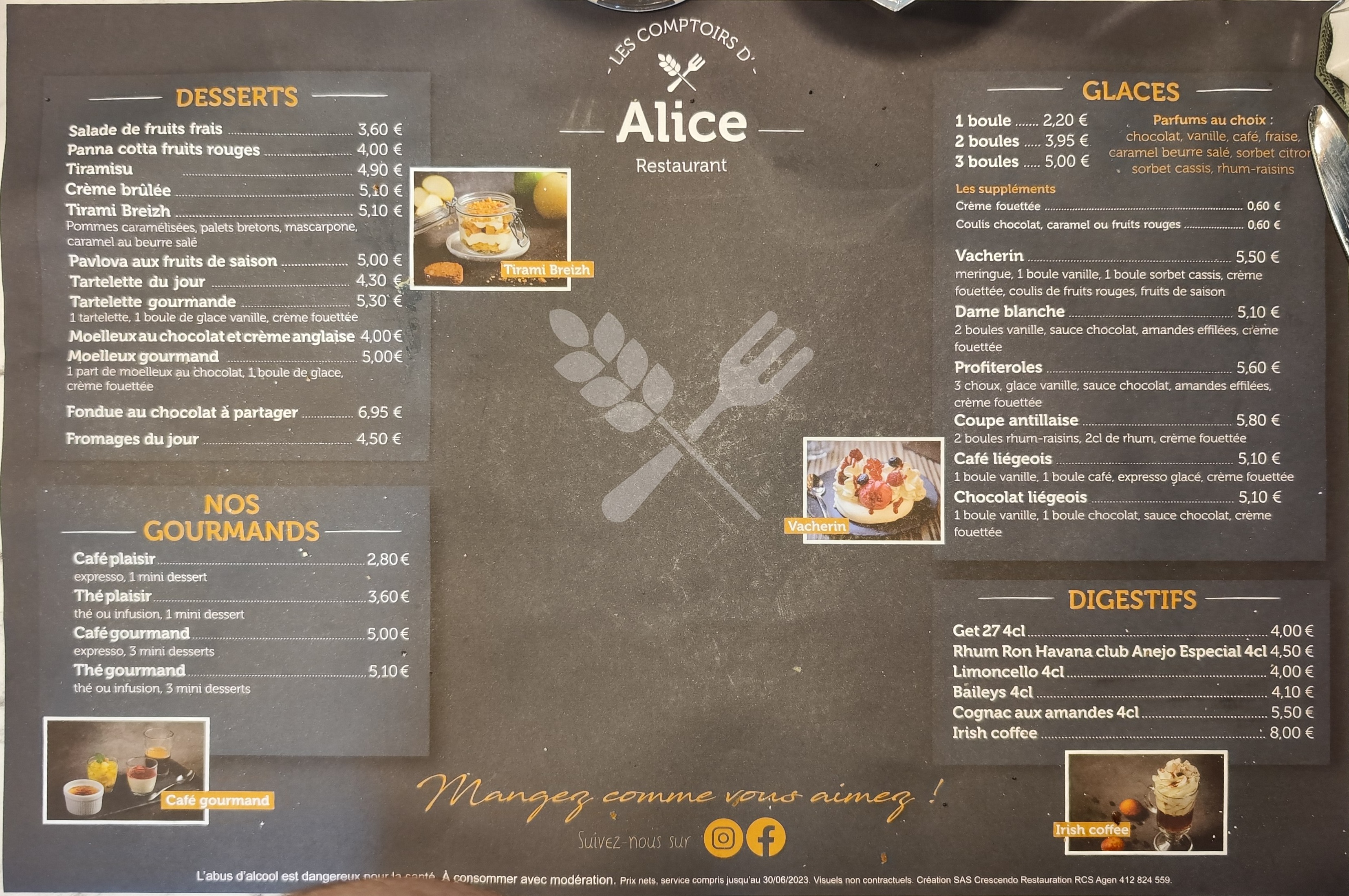 Nous ne regrettons absolument pas d’avoir passé notre samedi soir chez les comptoirs d’Alice. Une première pour nous et super ! Un concept au top de tout pour tous les goûts et trop cool vraiment La serveuse Françoise un vrai rayon de soleil qui porte le bonheur et la joie de vivre sur elle et c’est hyper agréable Une mentalité d’équipe super qui fait raisonner la convivialité et l’agréable Une très bonne soirée merci à vous