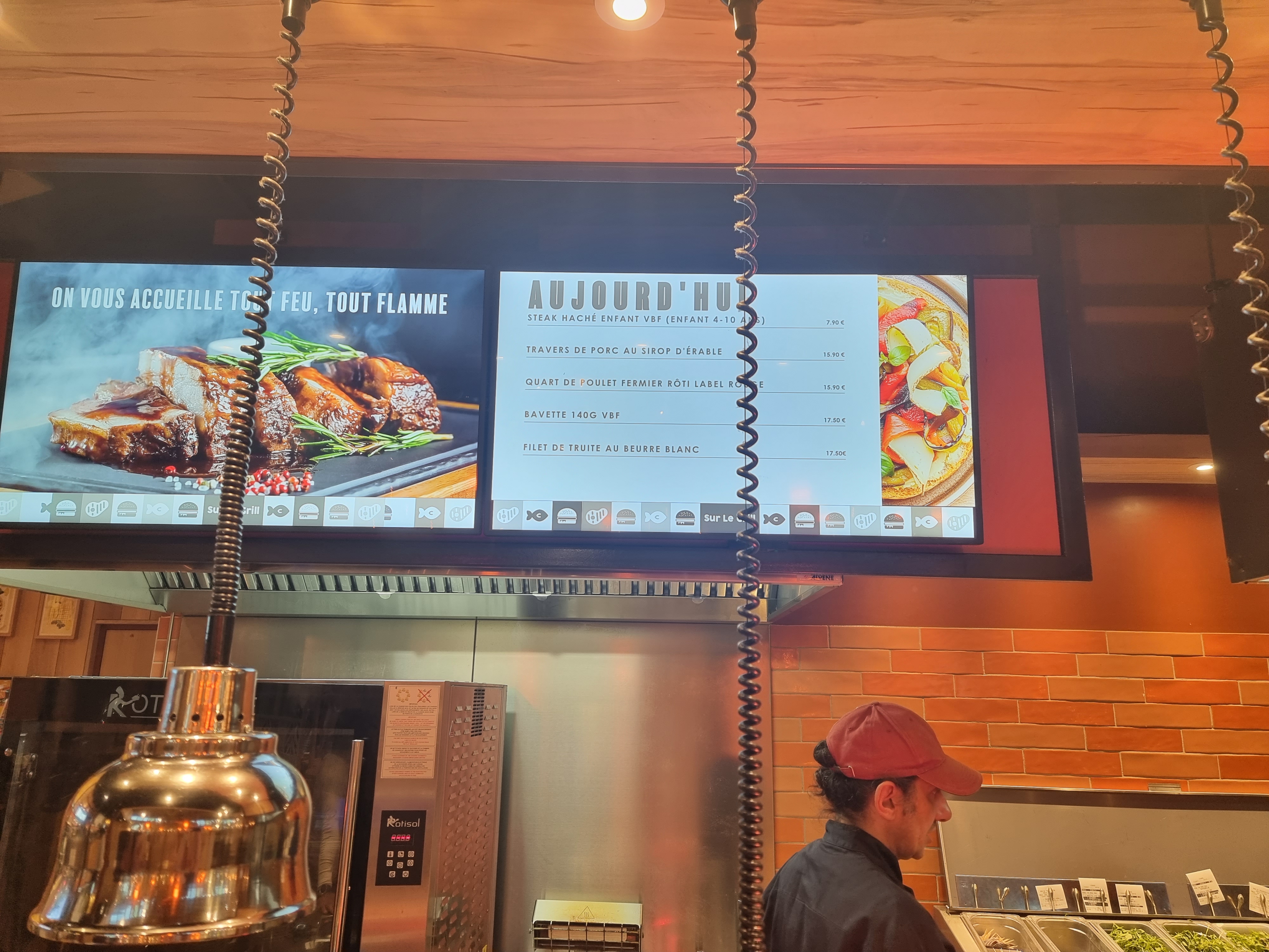 Nous avons discuté avec la responsable la veille de manger dans ce restaurant. Elle nous a dit qu'ils ne travaillent qu'avec des produits frais des environs et du coup qu'ils établissaient les plats au jour le jour. A l'entrée du restaurant, il n'y a pas de prix, il faut se déplacer dans la salle comme une cafétéria pour choisir chaque plat. Nous avons pris un steak haché pour notre enfant de 9 ans, demandé saignant, il était cuit à travers, pas évident à cuire puisque l'épaisseur de celui-ci ne devait pas dépasser 7 mm, même chez Mc Do il est plus épais, frites surgelées, et autres accompagnements pour nos plats qui ne font pas cuisinés maison. Franchement, très déçu ! Le rapport qualité/prix n'y est pas.