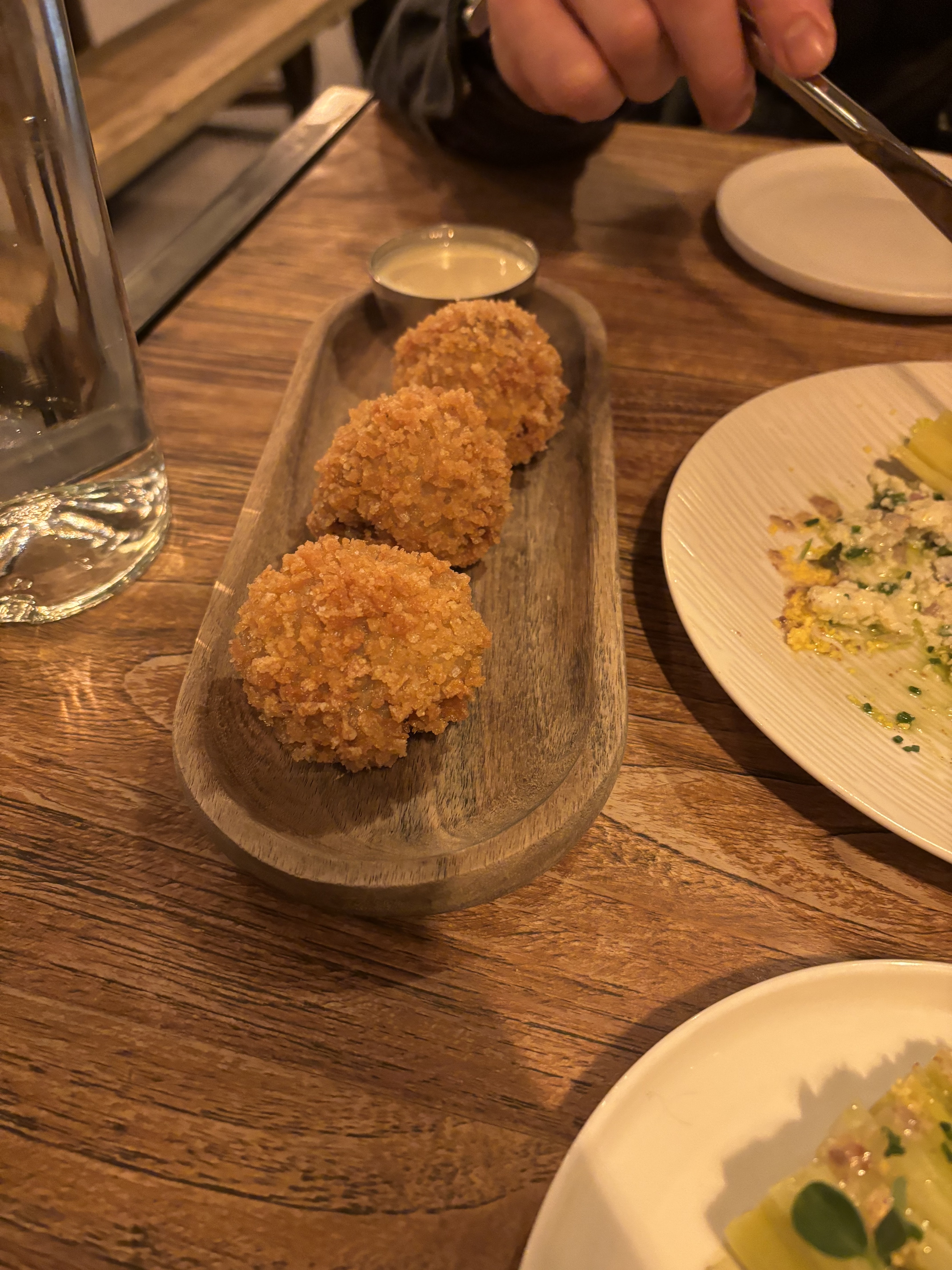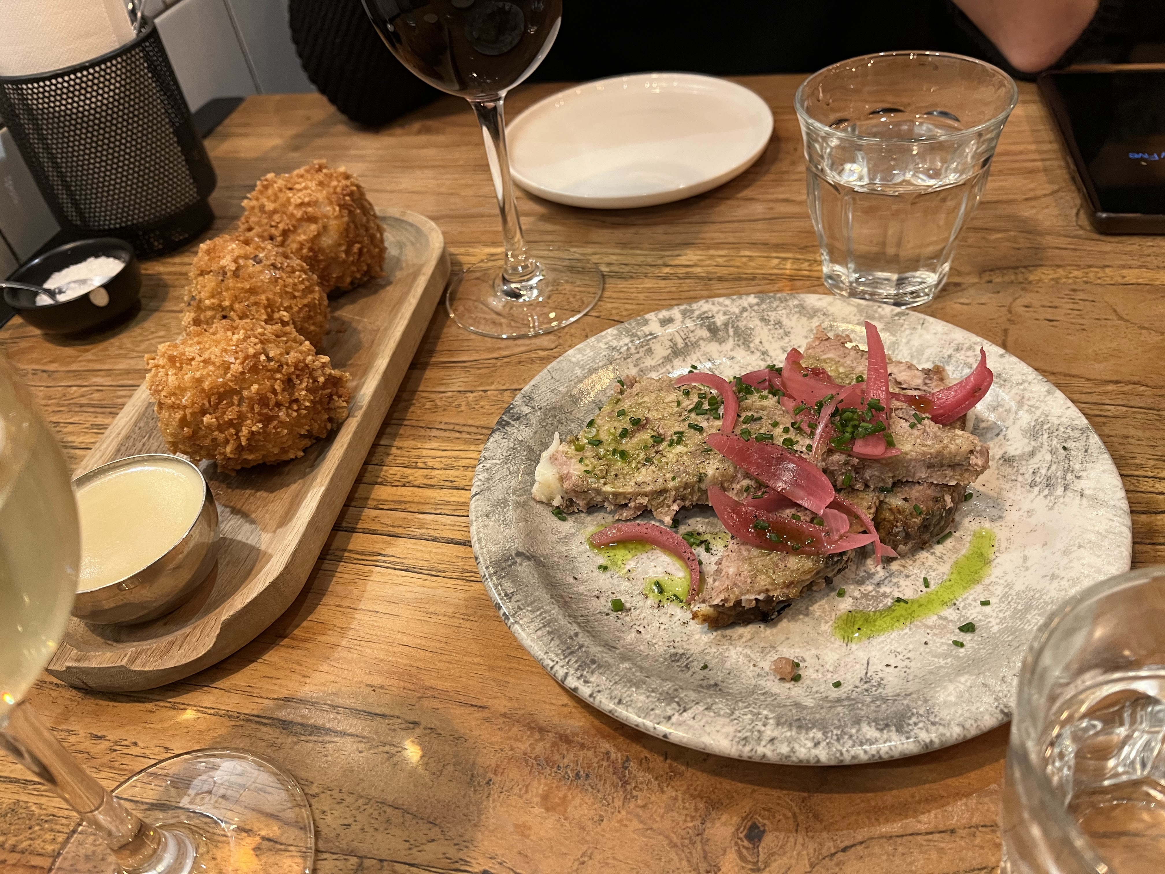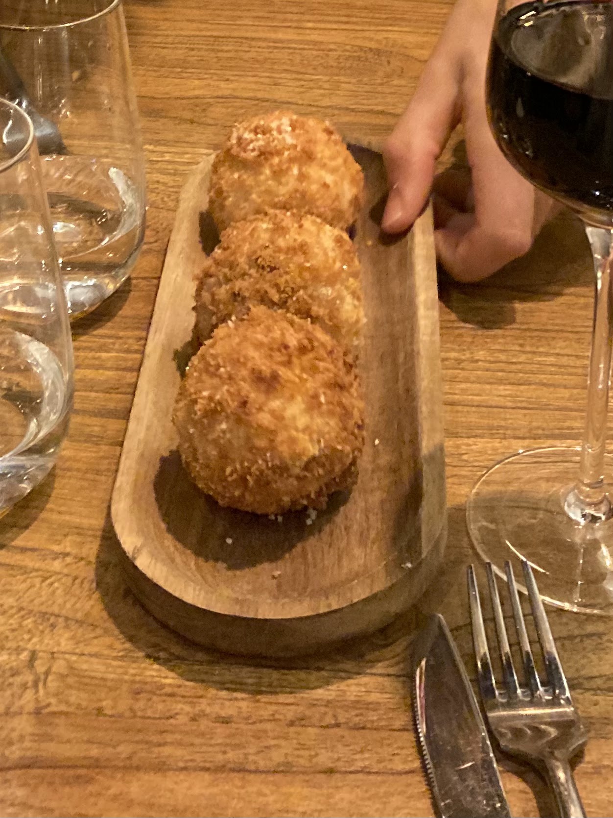 Sympathique et convivial. Dans l’assiette tout va bien : les portions sont bien ajustées, les plats sont savoureux. Mention spéciale à l’assaisonnement du cabillaud et à la terrine maison. Les arrancini aux champignons sont une top idée mais mériteraient peut-être un petit twist supplémentaire (ail, citron ?). Petit bémol sur le service du vin : stockés en salle, les rouges légers manquent un peu de fraîcheur (vite corrigé). Enfin le service est efficace et décontracté. Tous les ingrédients pour un très bon dîner entre amis.