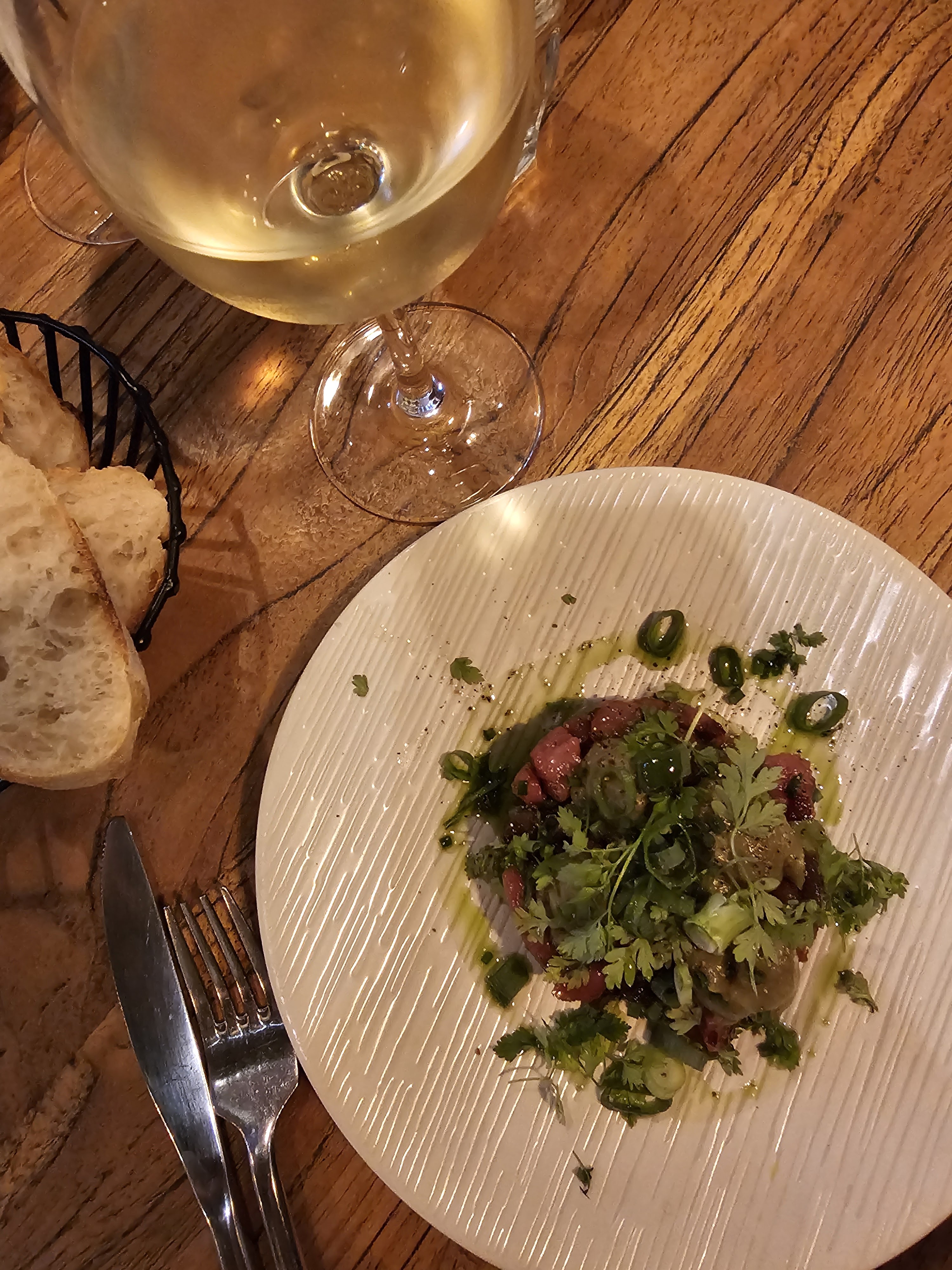 J’ai passé une excellent moment! L’ambiance est chaleureuse, on s’y sent comme chez soi. L’idée de prendre plusieurs petits plats à partager (ou pas!) m’a séduite. Et la cuisine est à tomber ! J’ai eu la chance de déguster un ceviche, des Saint-Jacques, des couteaux et un riz au lait (délicieux, parole de pâtissière!). Installée au bar j’ai pu observer et suivre le dressage des plats, ce que je vous conseille si vous venez seul(e) ou à deux. La note était de 49€ pour 3 plats, 1 dessert et 1 boisson, ce que j’ai trouvé raisonnable et adéquat. Encore merci pour ce repas. À bientôt!