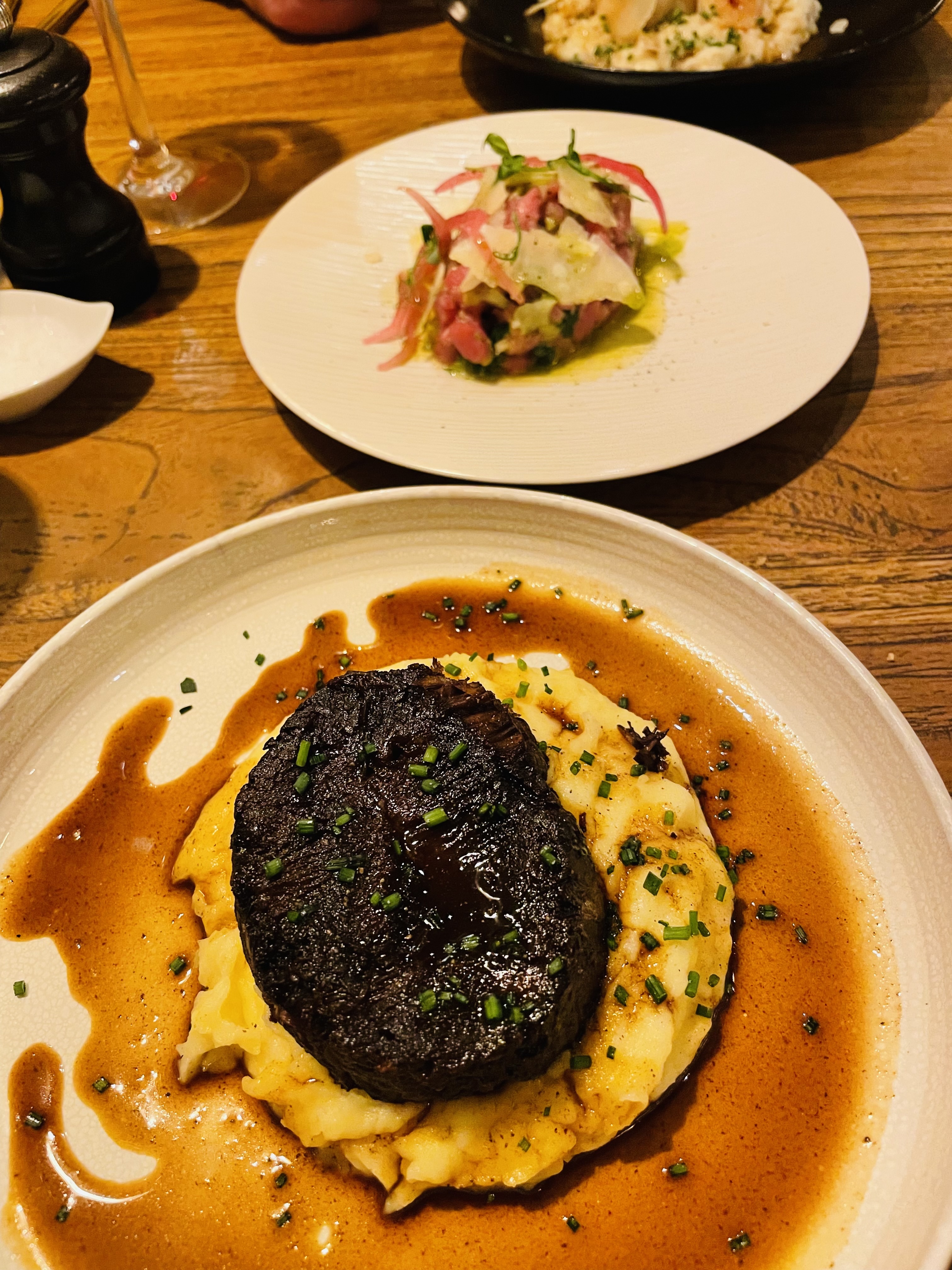 Table pour 4 réservée le 1er décembre au soir. Nous avons eu la chance de goûter à quasiment tous les plats de la carte à partager. Finesse des plats et équilibres des saveurs sont au rendez-vous. Une réussite ! Les plats de la carte dégustés : arancini, couteaux, magret, picanha de boeuf, Saint-Jacques, fromages Les desserts : mousse, poire