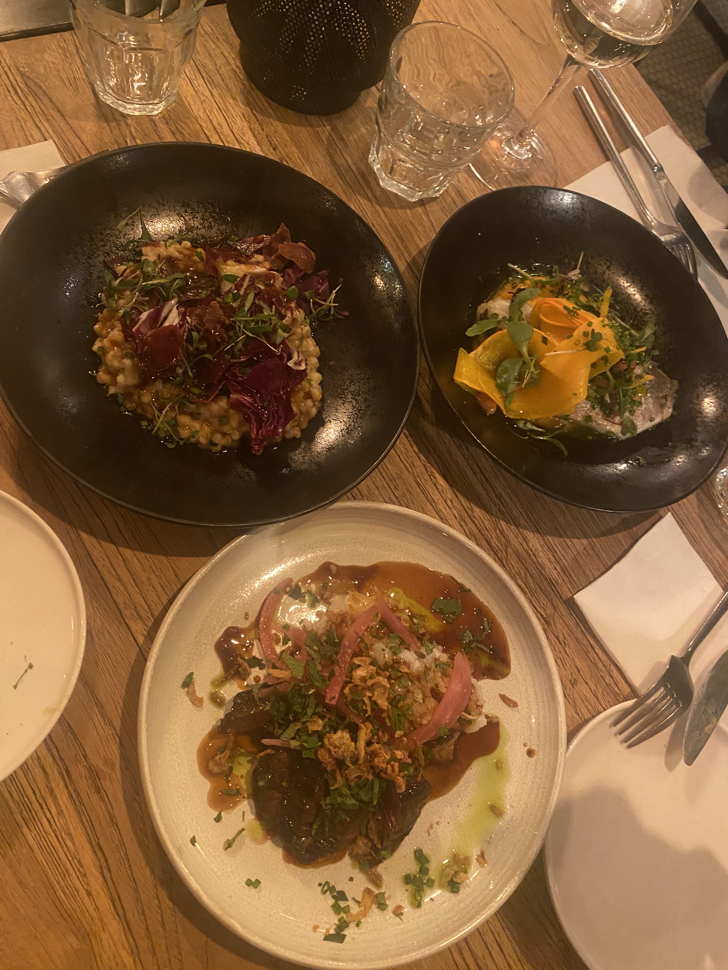 Beau restaurant avec de délicieuses petites assiettes. Nous avons partagé plusieurs de leurs plats, chacun étant un succès à part entière. Le vin était excellent et notre serveur nous a aidés à choisir ceux qui se mariaient bien avec notre sélection. Elle nous a même aidé à choisir dans quel ordre nos plats devraient sortir pour permettre une meilleure expérience.
