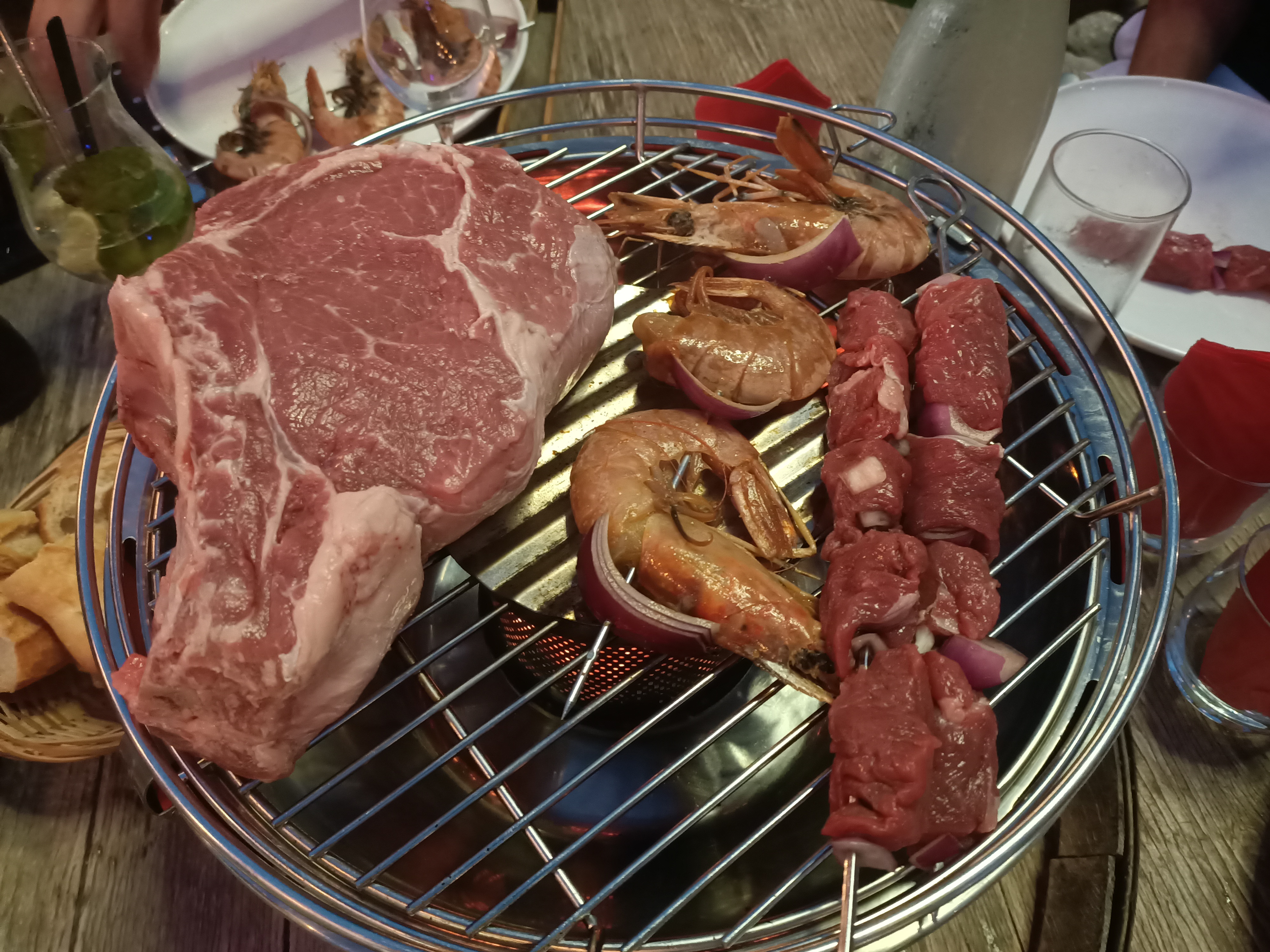 Nous nous somme régalé avec une belle côte de boeuf de 900gr, très tendres. Très convivial avec ces barbecue de table au charbon, a faire griller sa petite viande. Les propriétaires de ce restaurants ont pris le temp de discuté avec chaque table, au top Convivialité, bon produit, a l'esprit du sud face a la plage😉