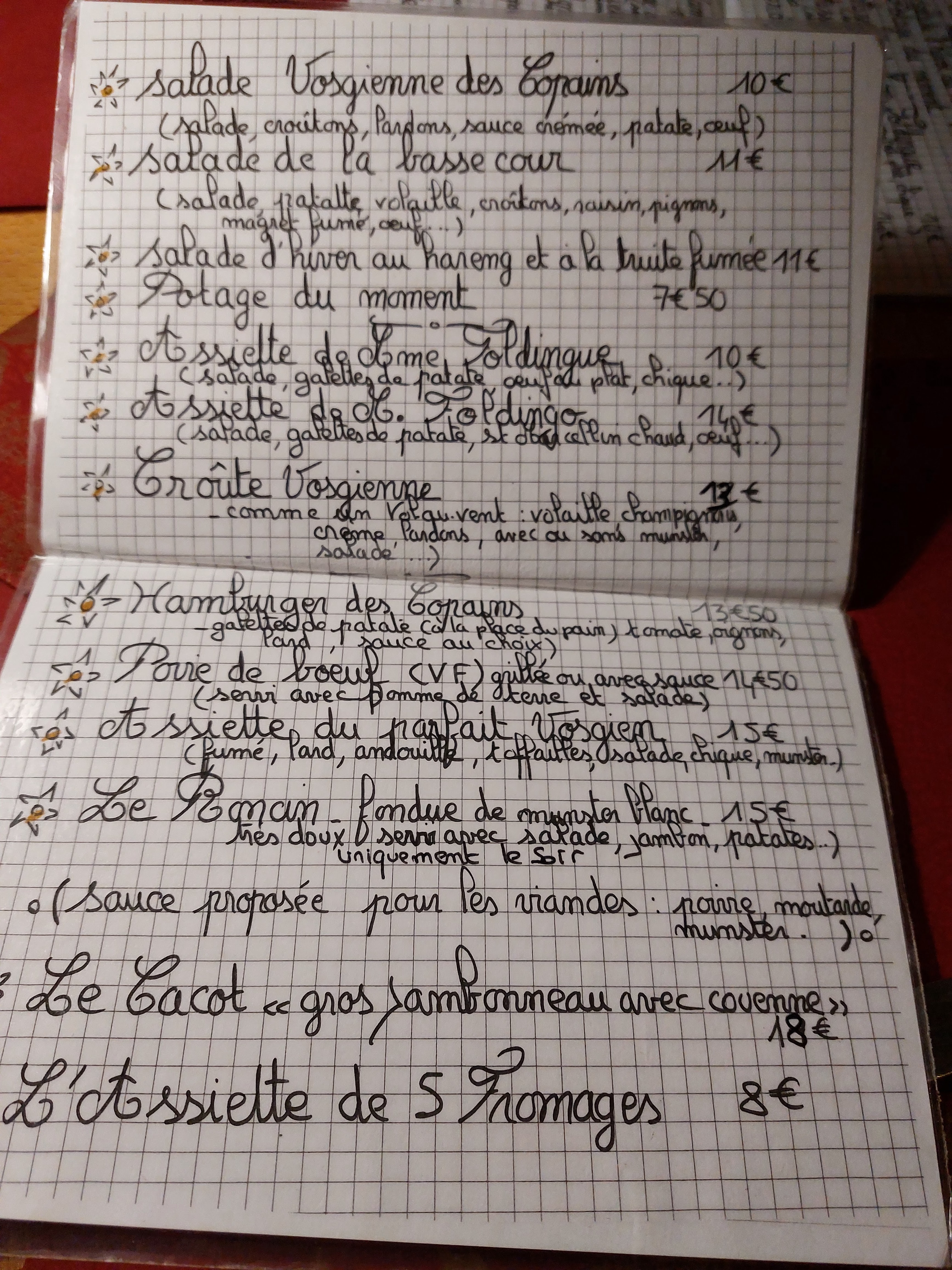 Toujours aussi bon à des tarifs abordables . Une petite carte mais que de bons produits .. hamburger avec des râpés de pommes de terre de belles salades vosgienne ou à la truite fumée . Et un intérieur super convivial avec des jeux à disposition . Allez y les yeux fermés
