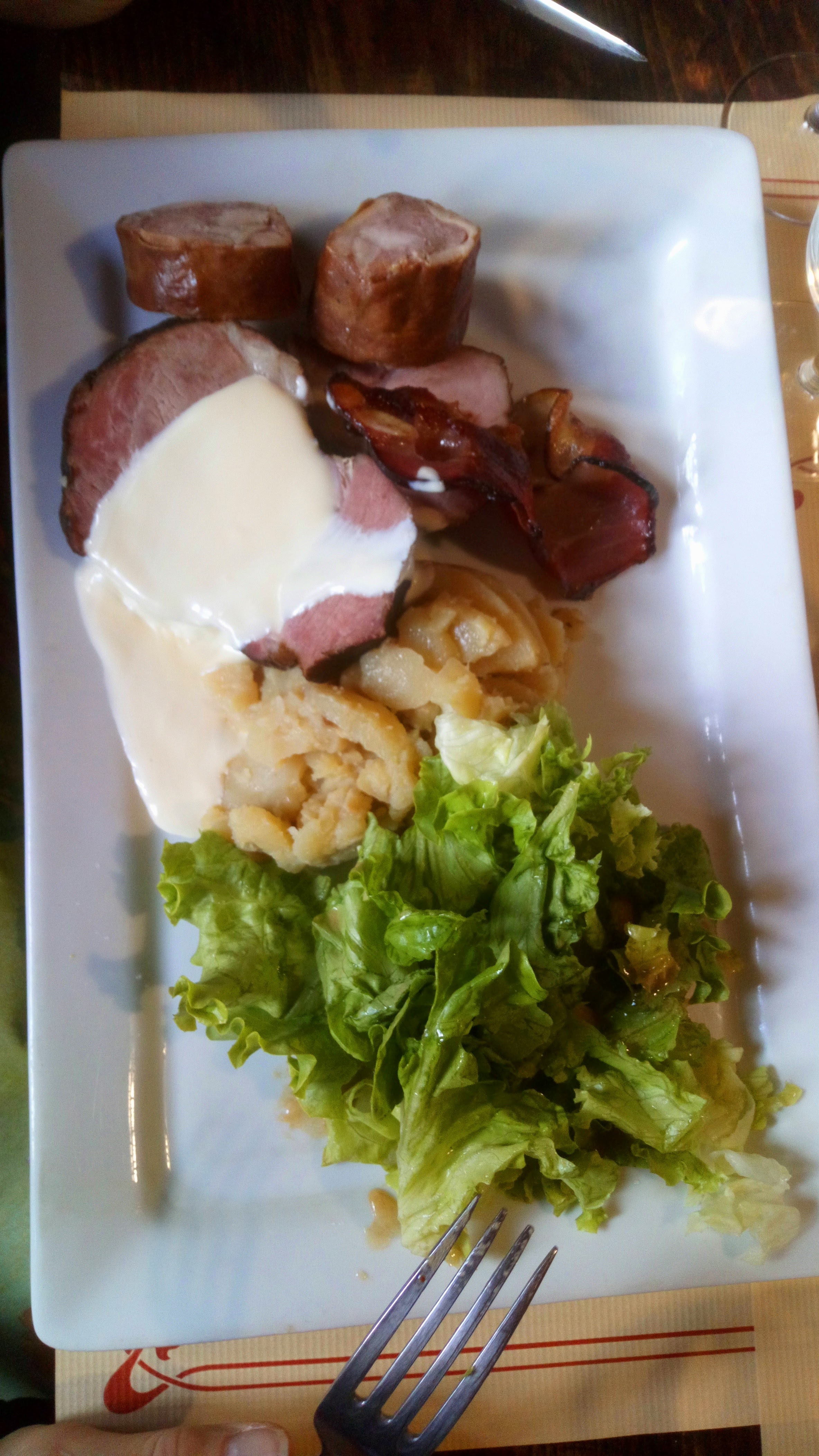 Beaucoup moins bien que notre première visite !!! Tofaille (à peine une cuillère à soupe dans l'assiette) réchauffée avec un goût trop prononcé en vin blanc , tout petit jambonneau et en dessert car très peu de choix , une crêpe... très déçu !!!