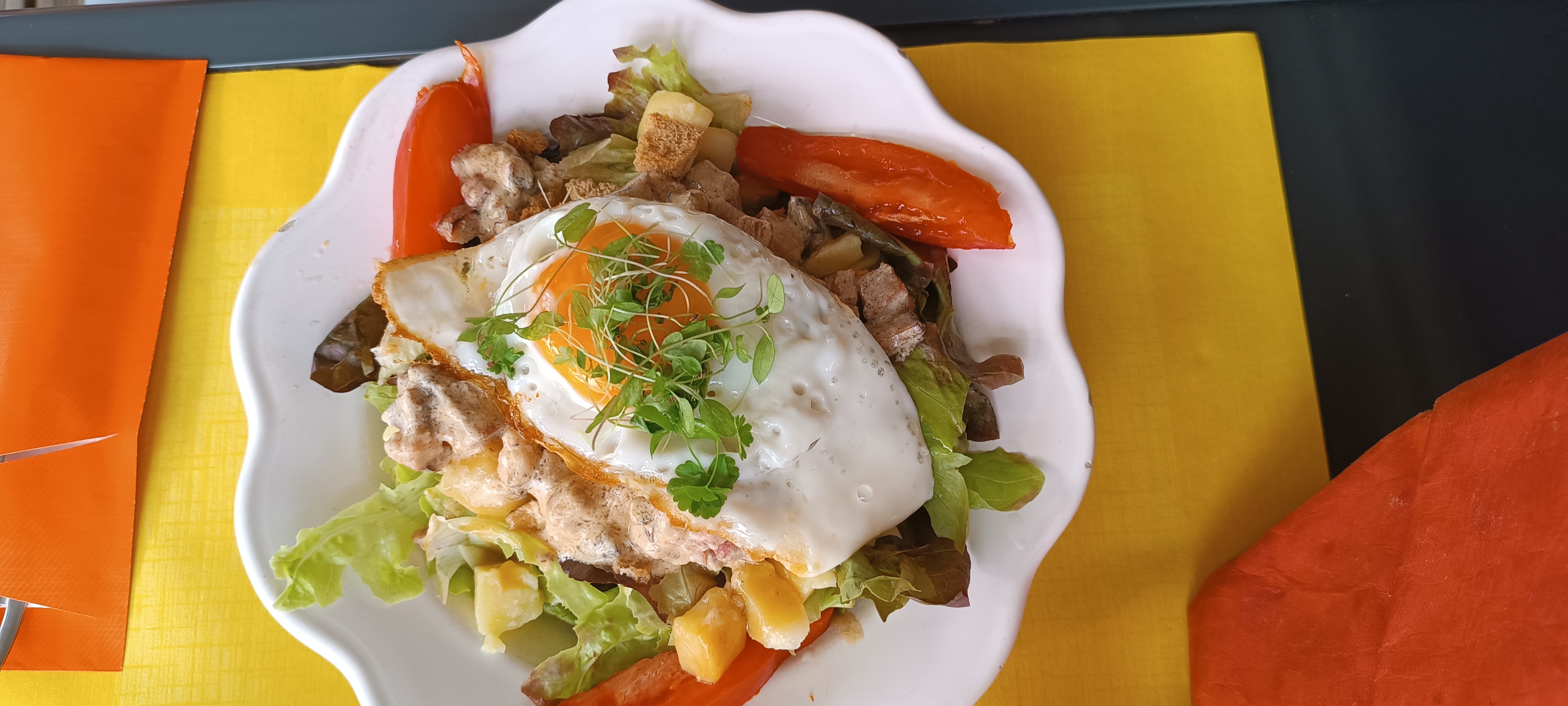 Dejeuner ce midi 2 personnes 1 salade vosgienne copieuse 1 menu du jour a 14€ qui vaut plus que son prix service impeccable et sympathique tres satisfaits