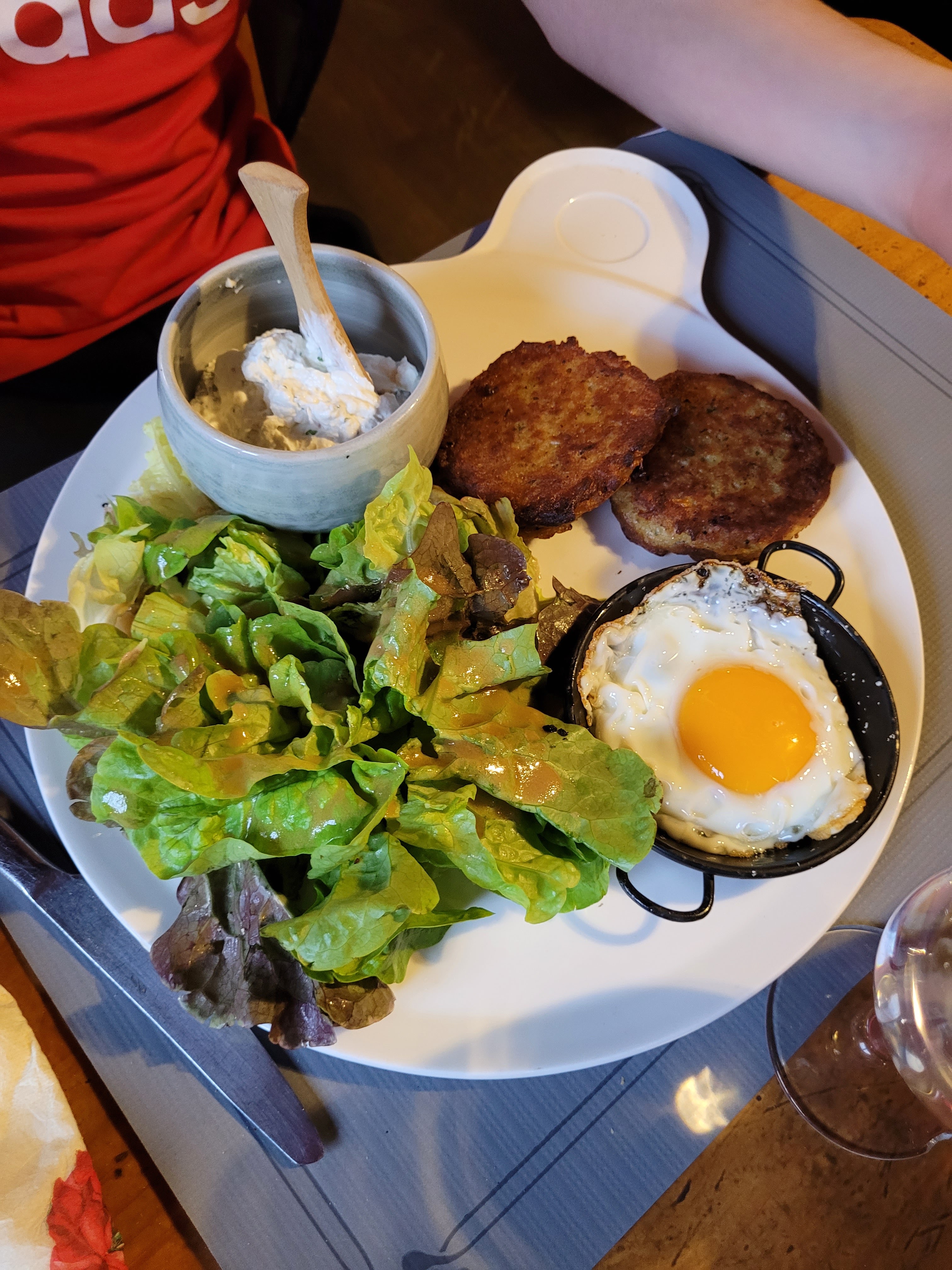 Comment dire passez votre chemin, un service déplorable où il faut demander les verres et l’eau, demander à ce que l’on nous débarrasse l’apéro, les serveuses une qui baisse les yeux pour eviter qu’on lui demande quelque chose et l’autre pas aimable du tout, en ce qui concerne la cuisine payer 14€50 pour une salade verte avec de la vinaigrette faite avec du Maggi (véridique on nous à fait voir la bouteille), 2 galettes de pdt immangeable sans assaisonnement et du plâtre et un œuf au plat, heureusement que le fromage etait bon. C'est honteux à éviter.