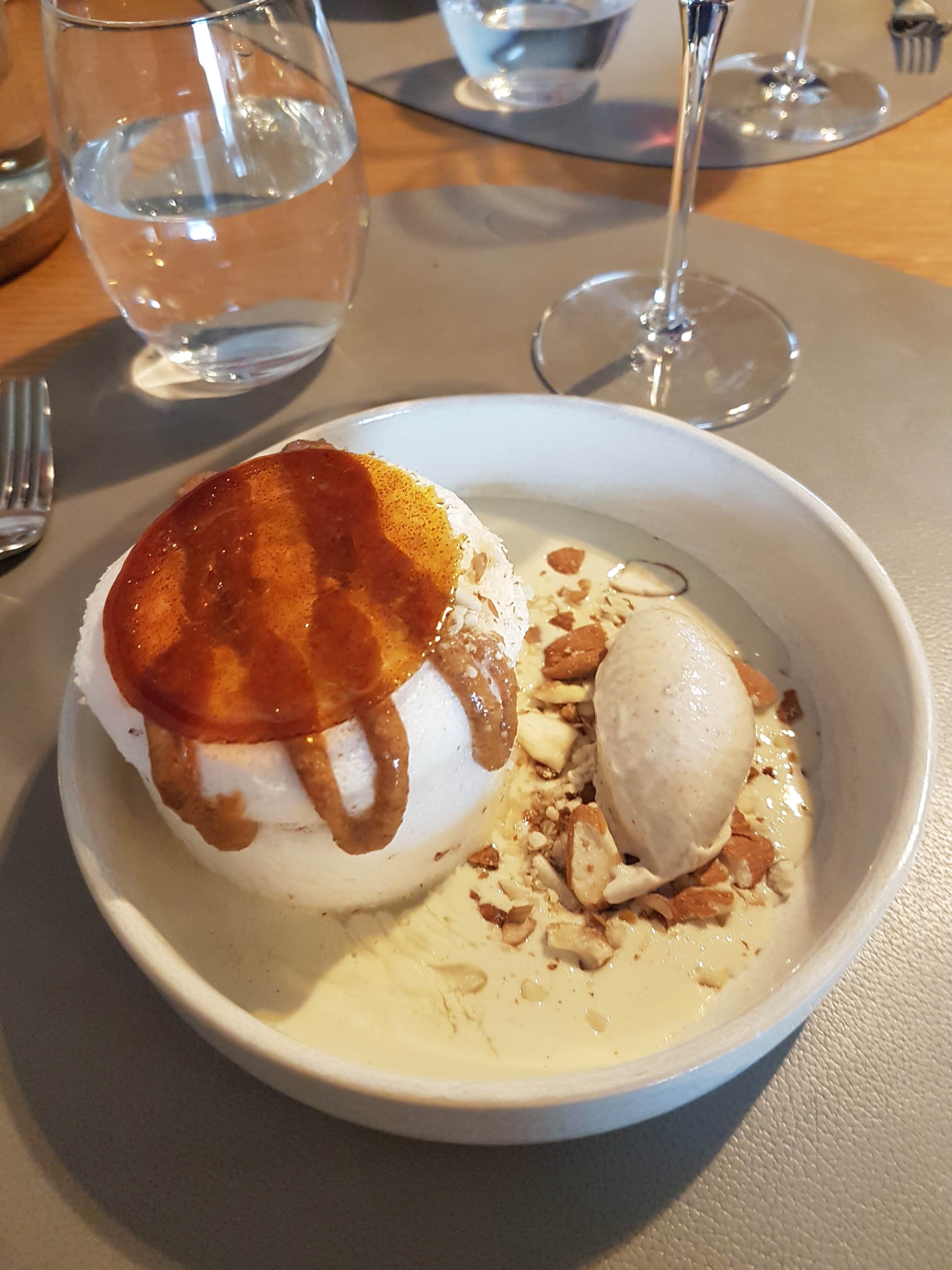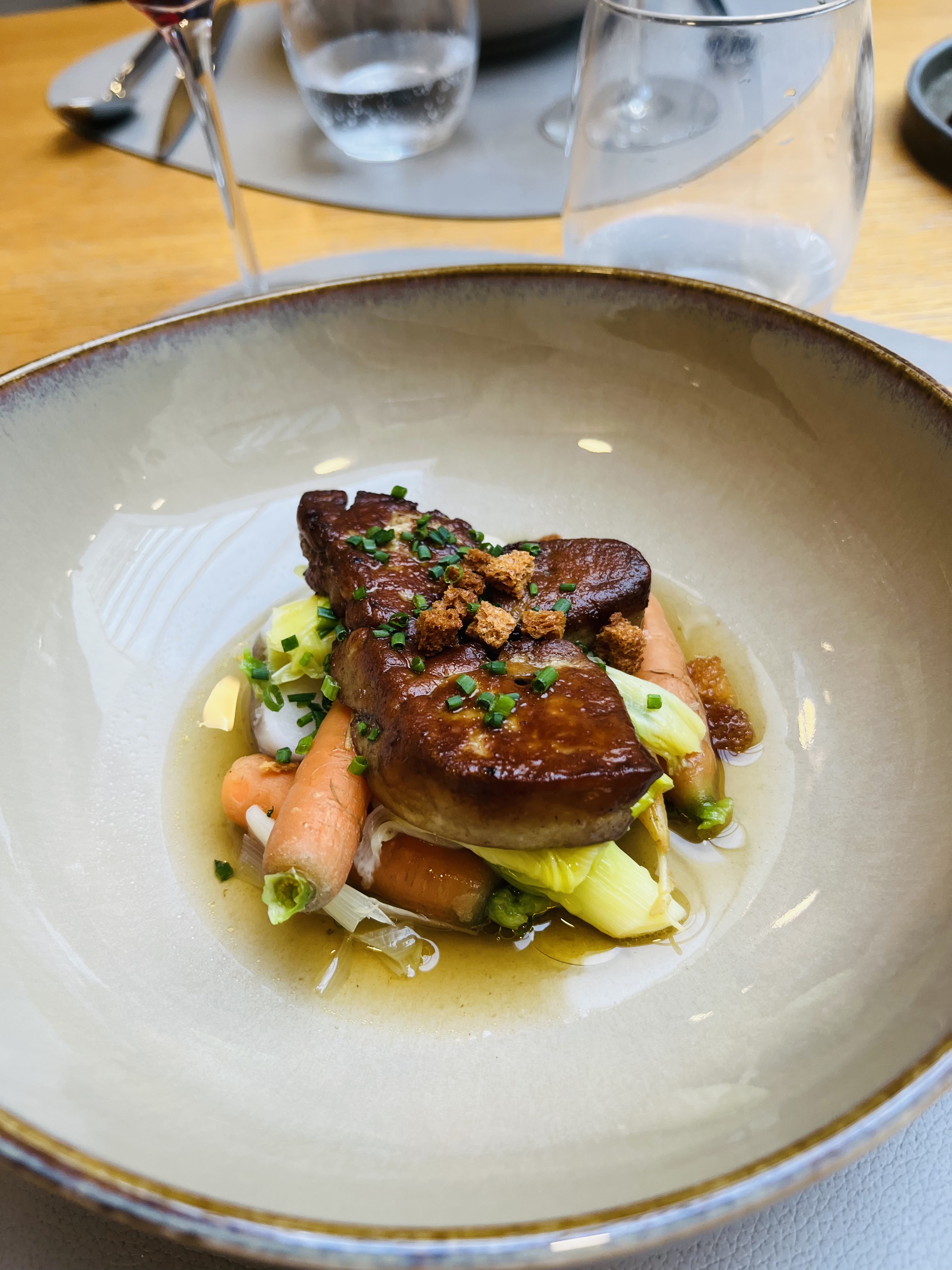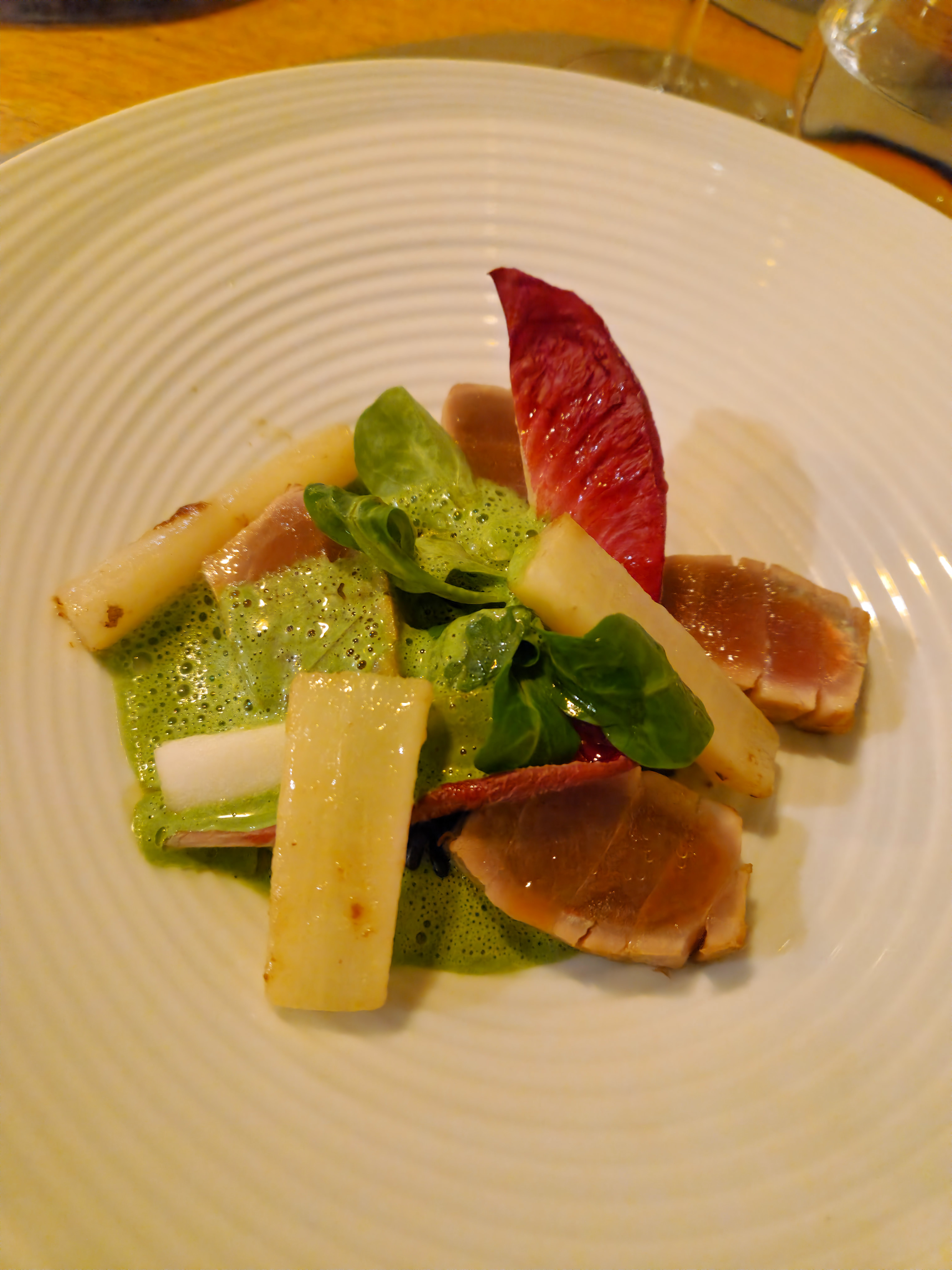 Ce restaurant était une nouveauté pour nous. Nous y avons très bien mangé, le menu hiver numéro 5 ( 4 assiettes et dessert pour nous) étant alléchant. La mousseline de Sandre était très bonne. Le dessert Orange sanguine_ frais et goûteux_ idéal pour finir le repas. Les asperges auraient méritées un peu plus de mise en valeur ne serait_ce que visuellement . Il manquait également un petit quelque chose ( épices? acidité ?)au plat à base de porc (un peu ferme...) et de purée onctueuse de choux fleur. Sinon, salle sympathique et service professionnel quoique un peu automatique. Très bien mais peut mieux faire pour être excellent.