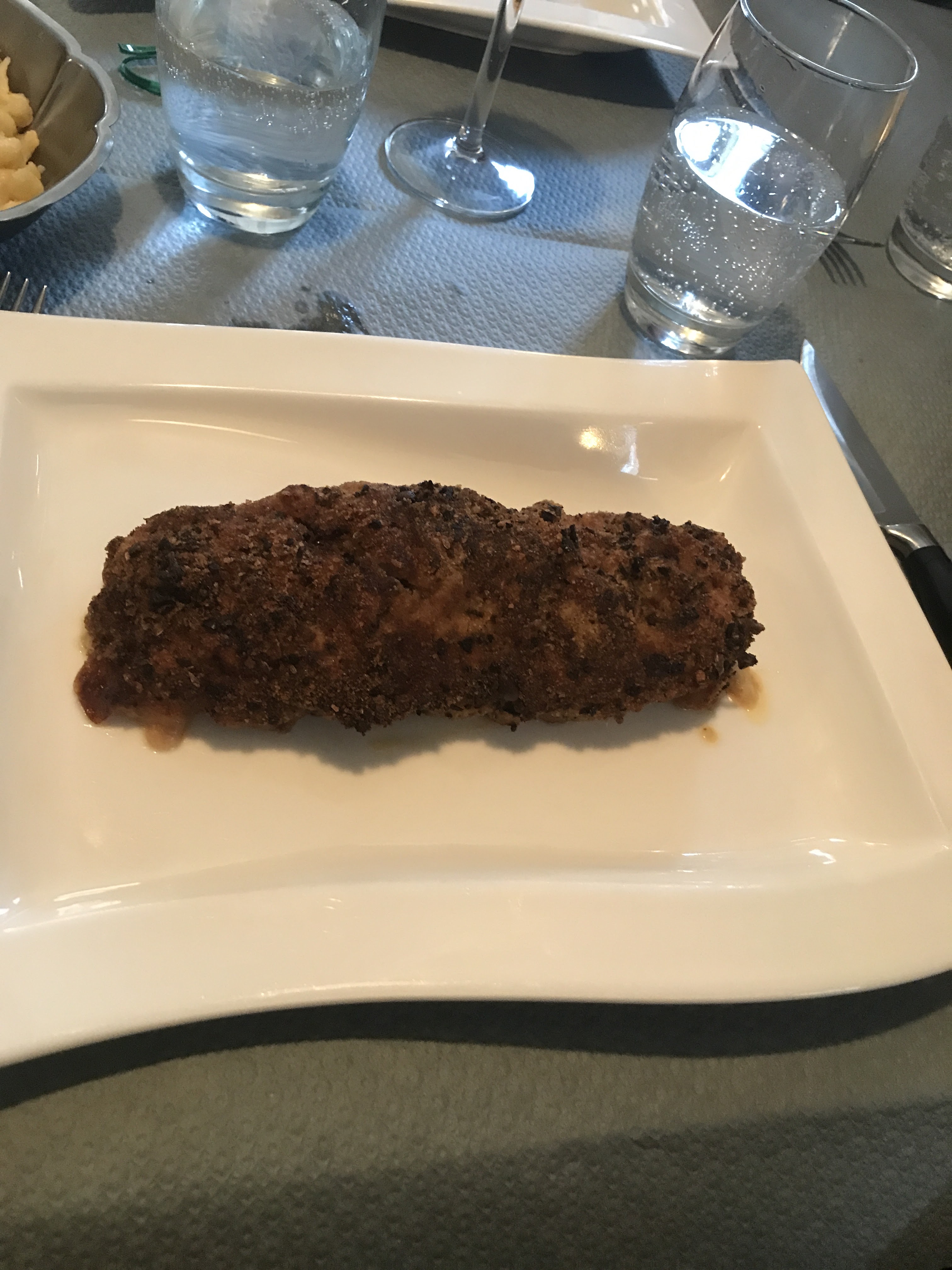 Belle table autour du cordon bleu de veau et de volaille à toutes les sauces, des recettes dont seuls Sabine et Christian ont le secret ; beaucoup de recherche pour l’appellation des différentes déclinaisons ; par exemple le cordon bleu au reblochon s’appelle le Dévotion en photo, car il s’appelait autrefois le fromage de dévotion en référence aux paysans savoyards qui en offraient aux Chartreux qui venaient chaque année bénir leurs champs et leurs habitations ; pour la part, j’ai pris un cordon bleu de veau au munster avec sauce munster, une valeur sûre, un délice, cuisson parfaite, viande rosée juste ce qu’il faut