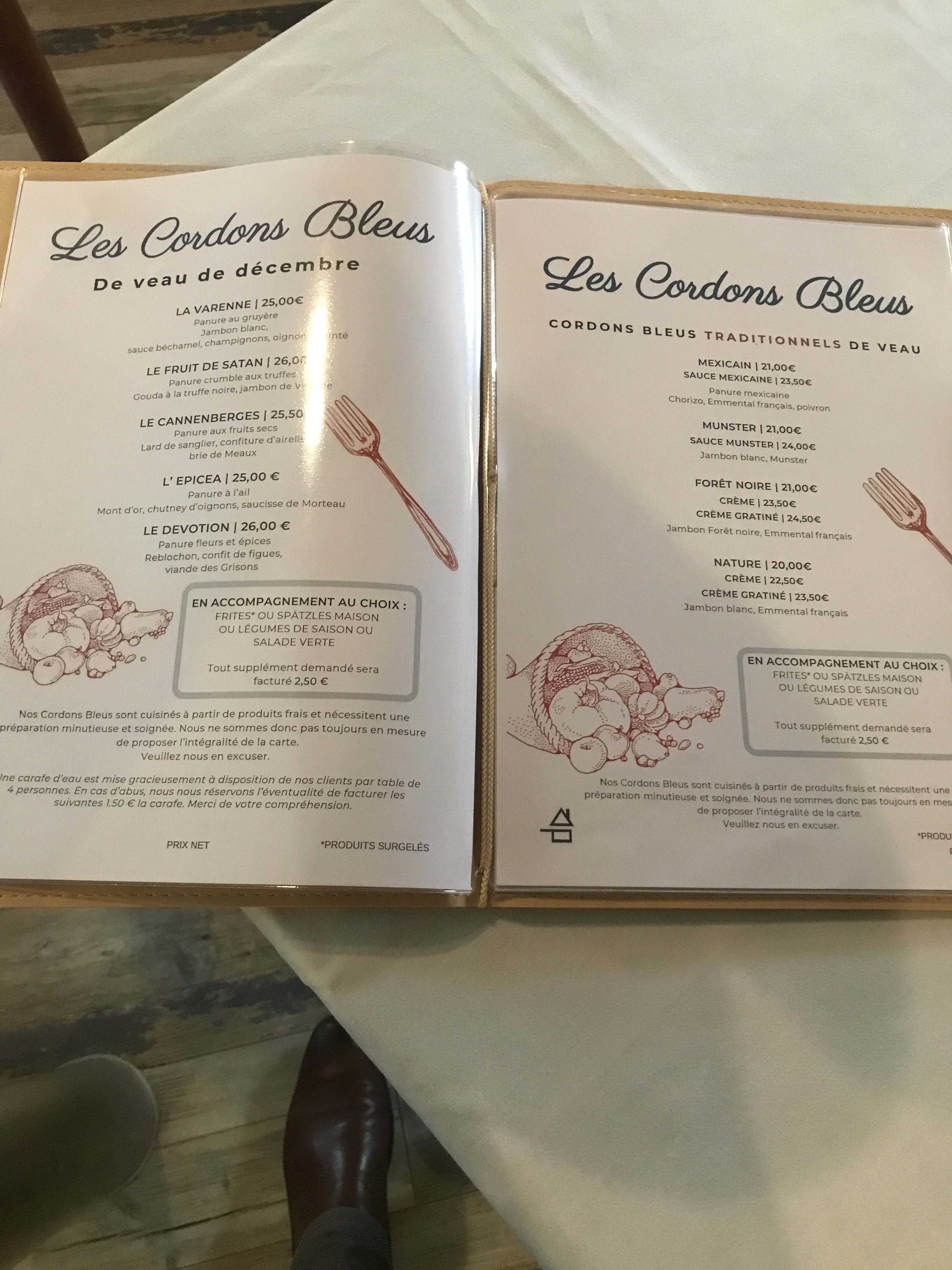 Ayant un enfant en bas âge nous avons commandé les Cordons Bleus à emporter. Un choix incroyable de cordons bleusNous avons prix le cordon bleu munster sauce minter un cordon bleu vacherin de joux le tout servi avec des spatzles. Les 2 étaient délicieux. Le 2eme étant plus copieux. Nous avons eu du mal à terminer. Nous y retournerons😉