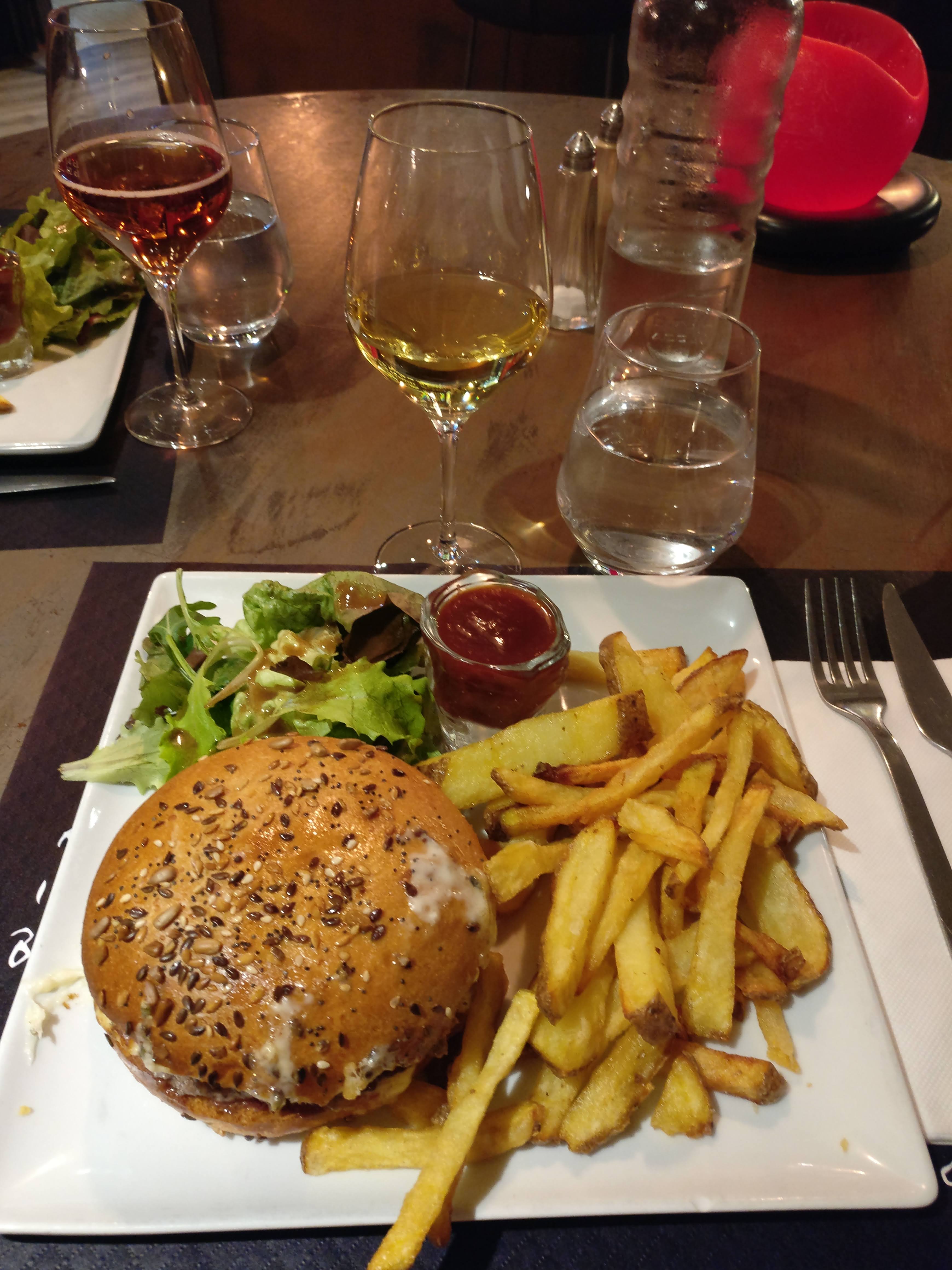 Très agréable, bravo. Accueil sympathique, suivi d'un conseil (repas + vins) professionnel. Service rapide avec le sourire. Tout est fait maison (même le ketchup). Nous ressentons un fort esprit d'équipe. Hamburger 5/5 Choi du vin 5/5 Frites 5/5 Désert 5/5 Café 2,5/5 (tiède...)
