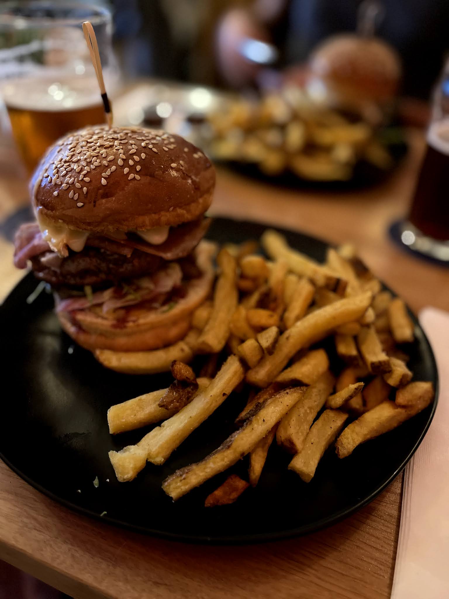 Burger au bleu delicieux avec une viande de qualité. Des frites maison magnifiques!