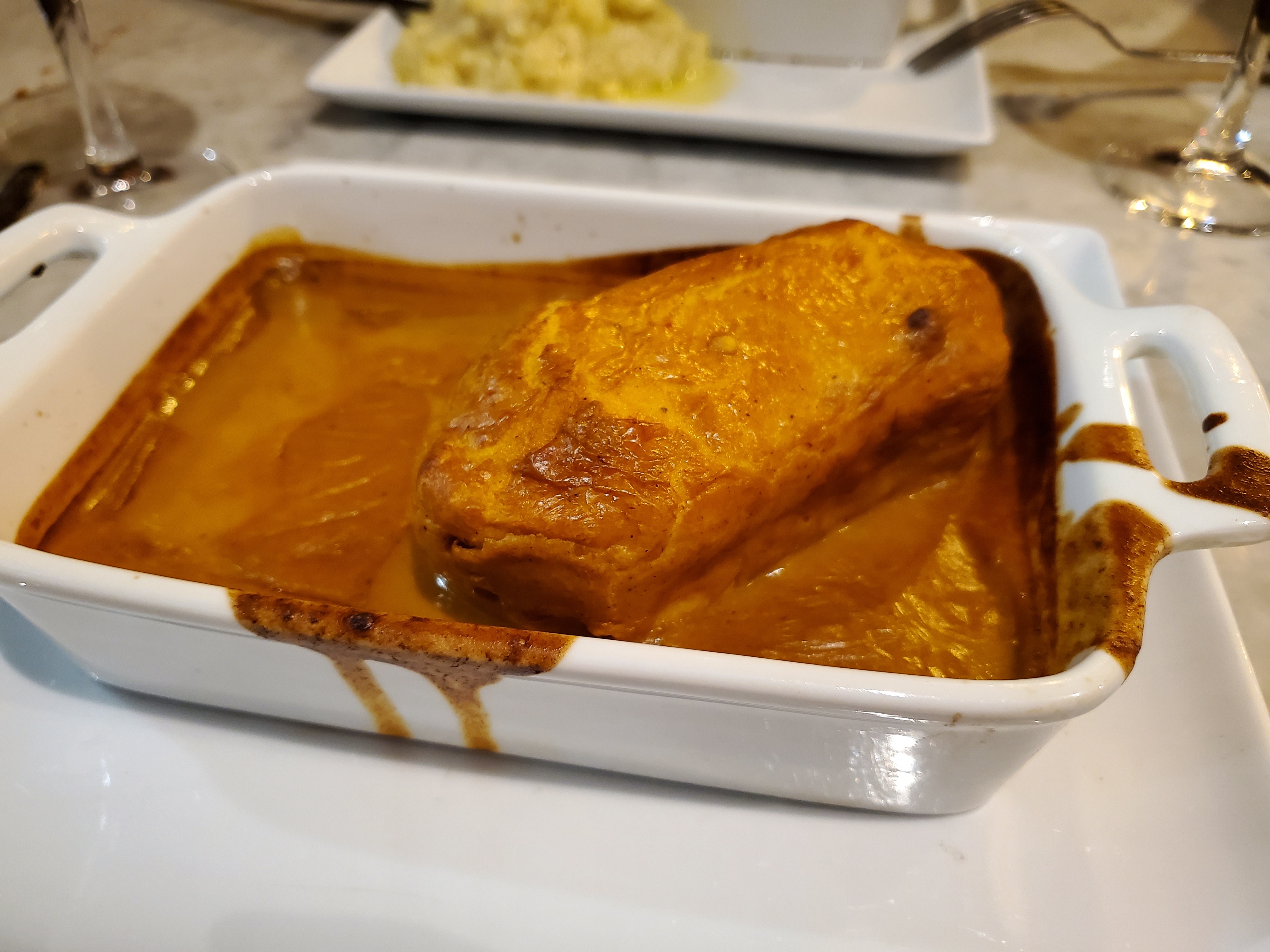 Pâté en croute succulent. Gnocchi un poil salé mais très bon Veau purée super bon. Tarte sucré très bon.