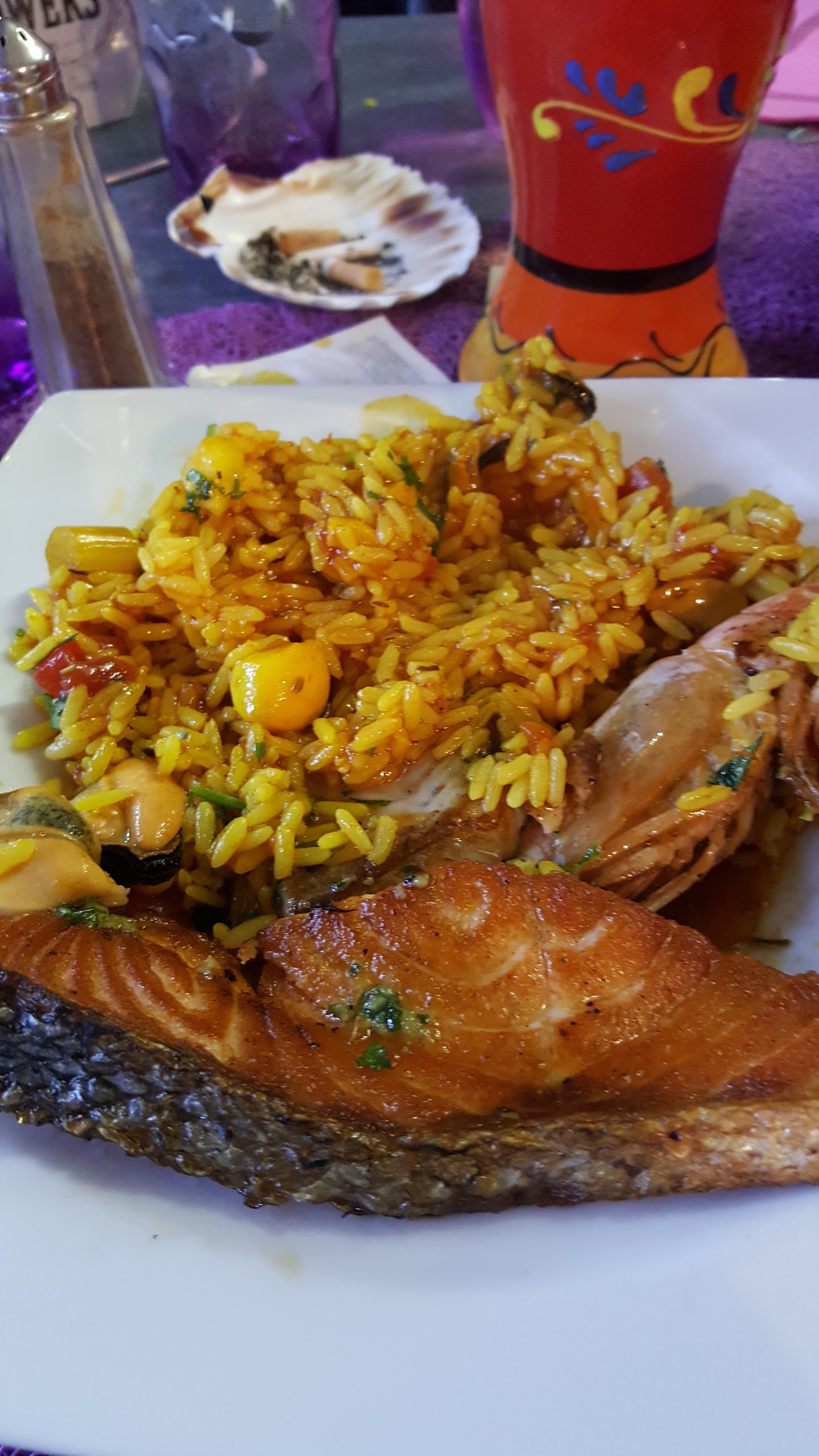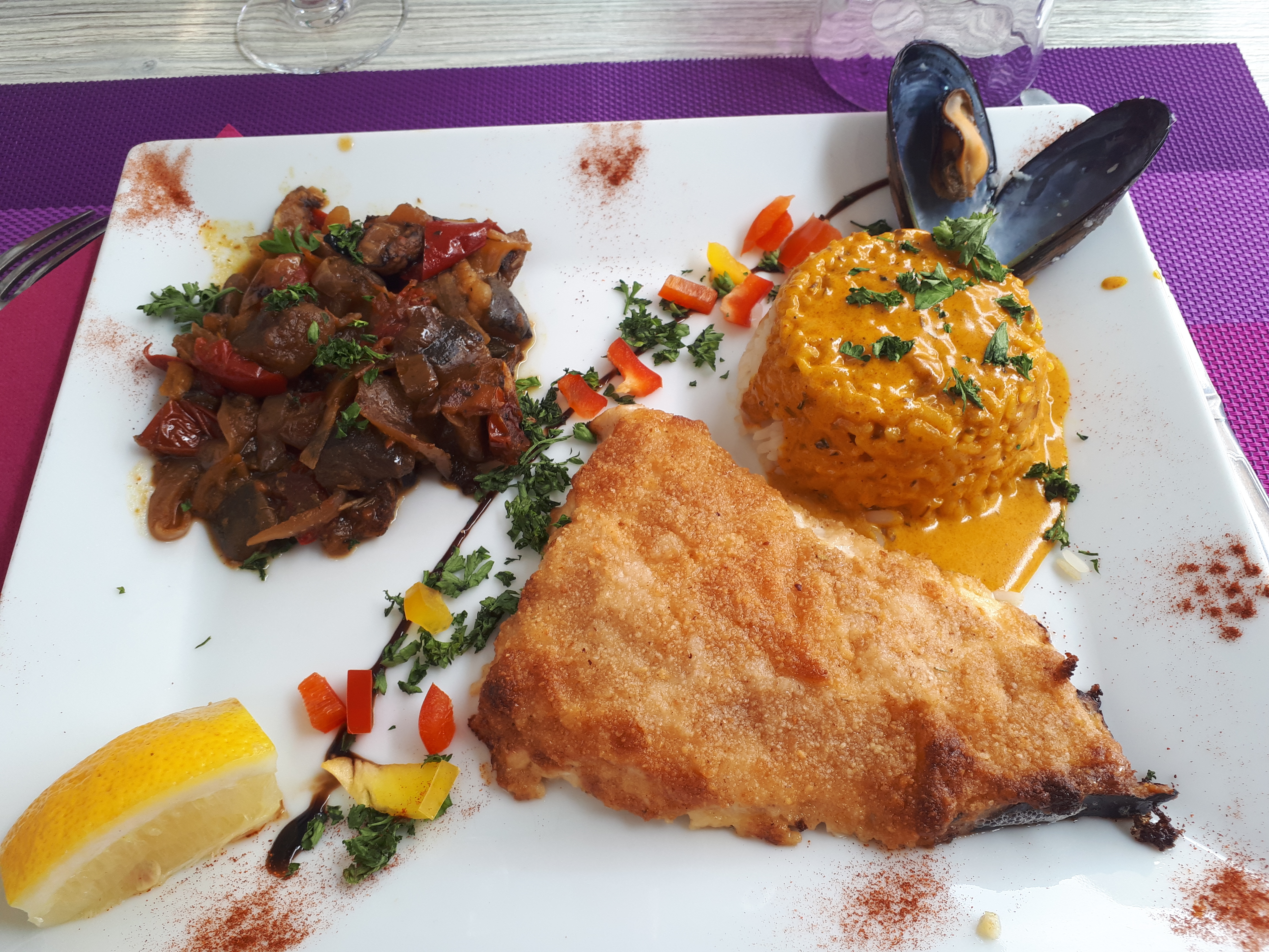 Bonjour, nous avons déjeuné avec nos 2 petits enfants, paella délicieuse, avec des morceaux de poisson tres croustillants. assiettes très copieuses et service réactif.