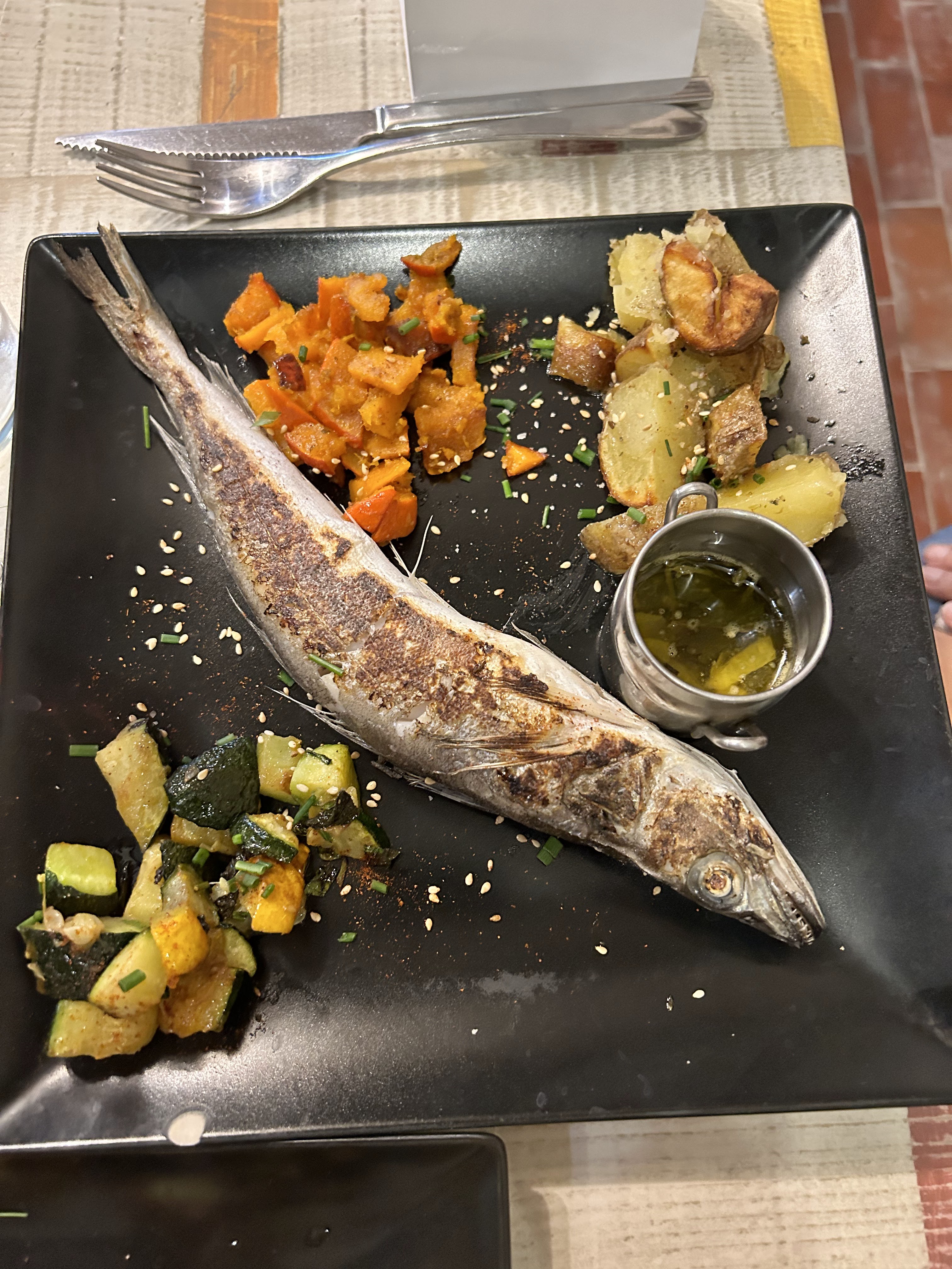 Le merluchon et sa sauce au beurre, citron et herbes, accompagné de blettes, pommes de terres et cougettes: un délice !! accueil très sympa , service attentionné et une salle agréable en cette journée de forte chaleur. Une très bonne découverte que cette adresse et la chef est douée