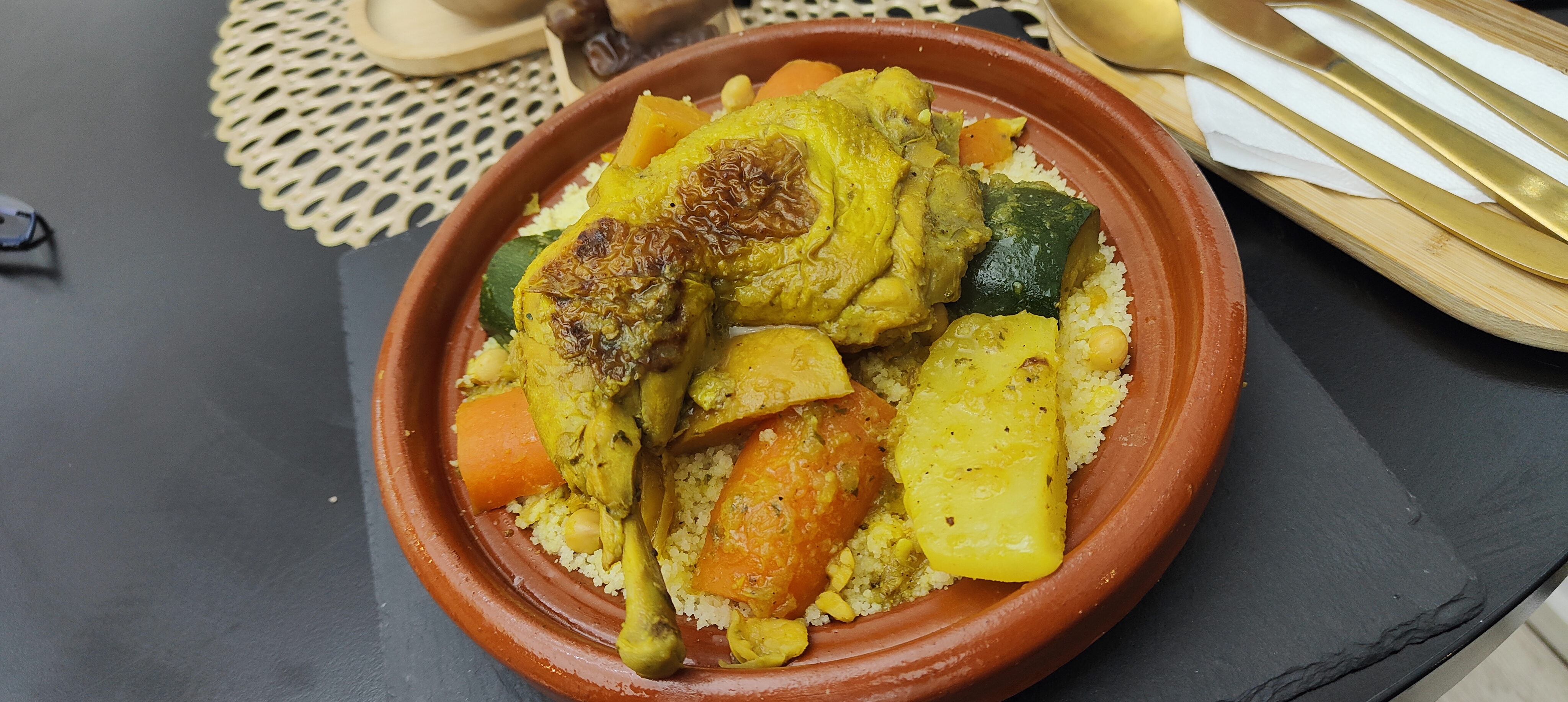 Invité chez mes beaux parents, j'ai pu manger le tajine poulet et agneau qui , à mon goût n'avait pas assez de légumes et les morceaux de viandes trop gros . (Demi coquelet) Le goût était là mais je celà ne pas fais voyager. Dommage 🫤