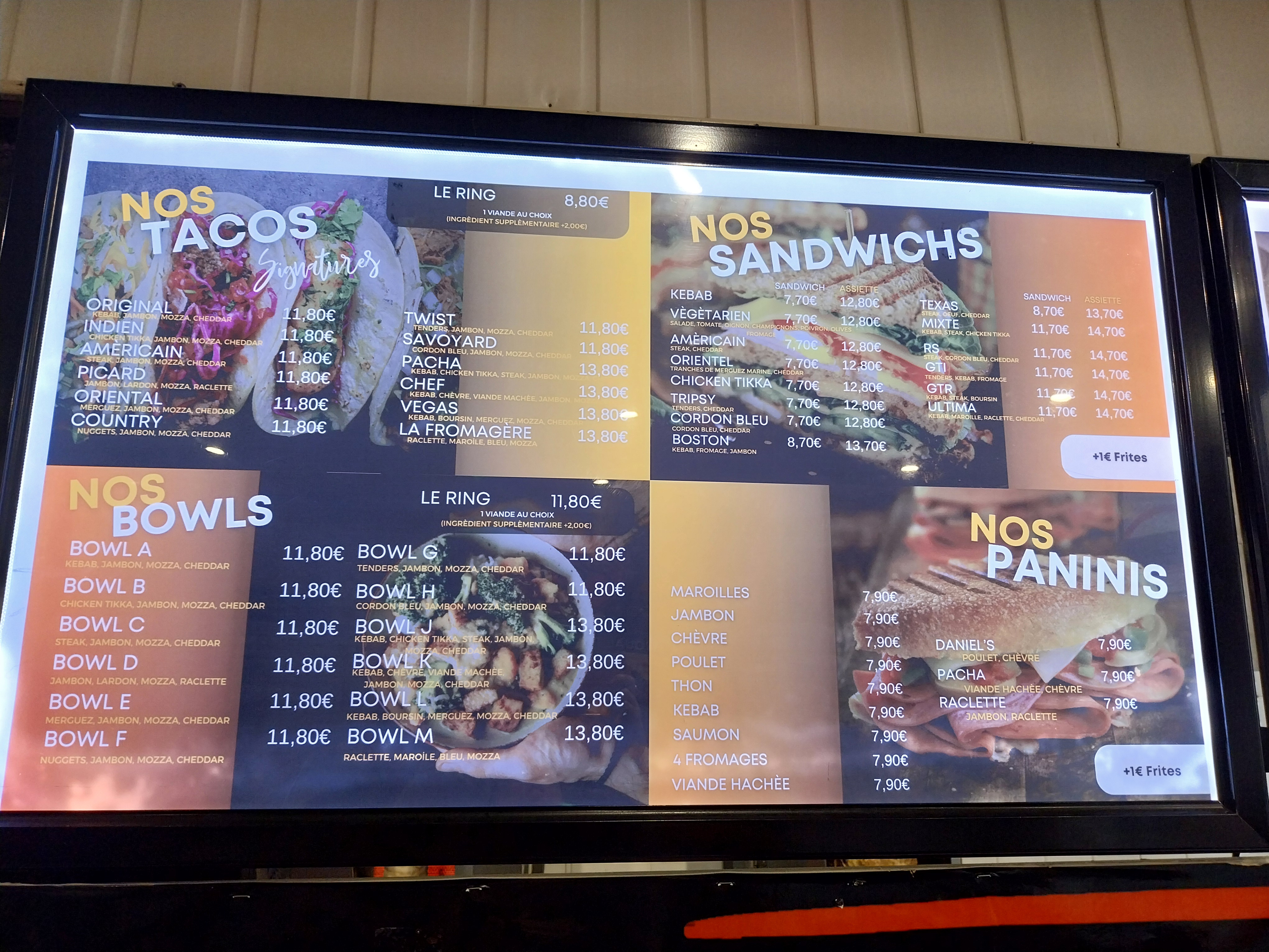 J'ai payé 15€ un tacos 1 viande de taille S avec 3 supplément.On voit pas les suppléments qu'on peut mettre ni le prix que cela nous coûtera .Le tacos est plutôt bon mais pas j'ai demandé une sauce que j'ai pas eu .