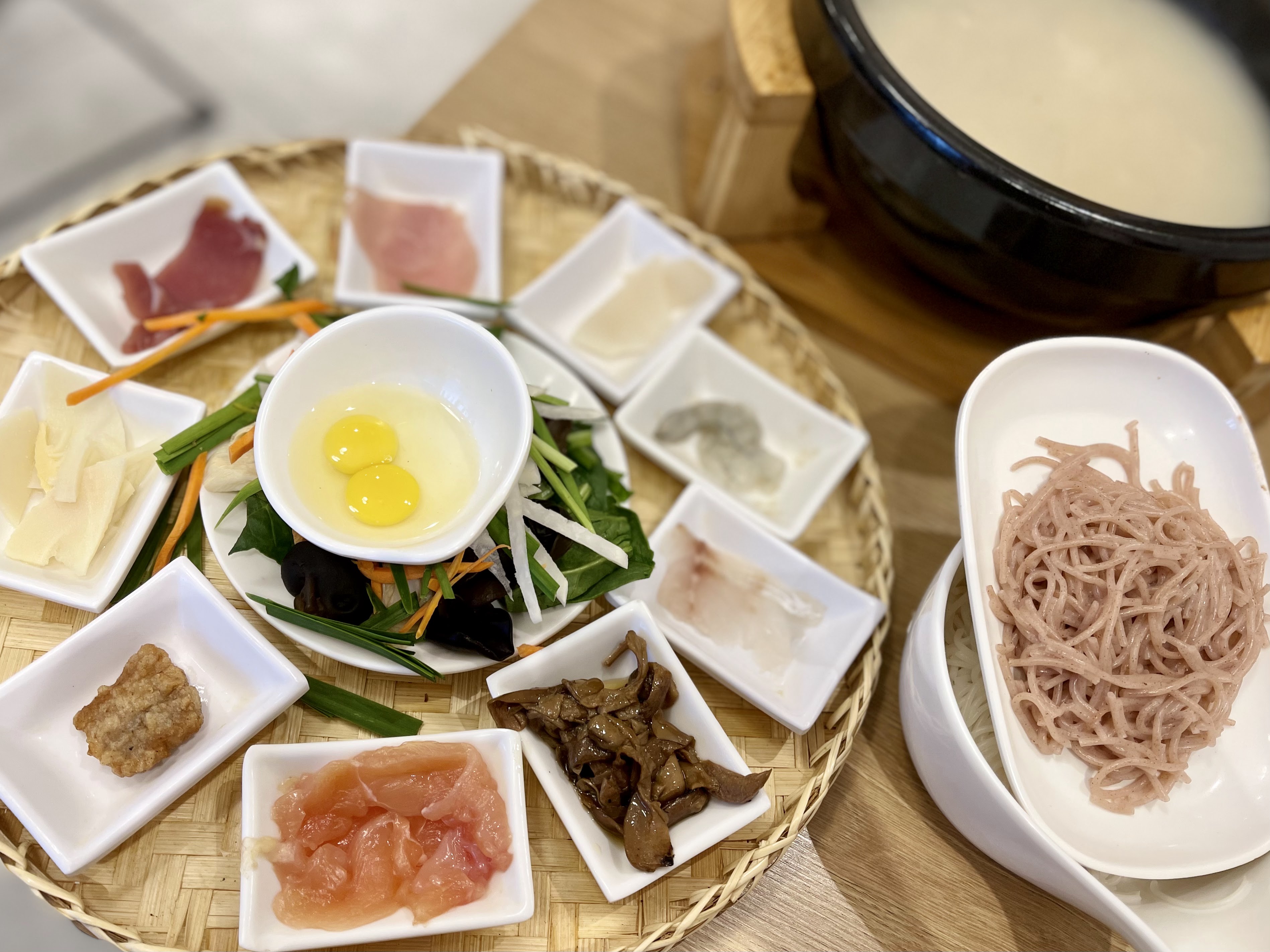 Le porc cuit à la vapeur et le tofu mariné sont très savoureux. Les nouilles de riz ont un goût un peu trop léger. Beaucoup d'ingrédients.