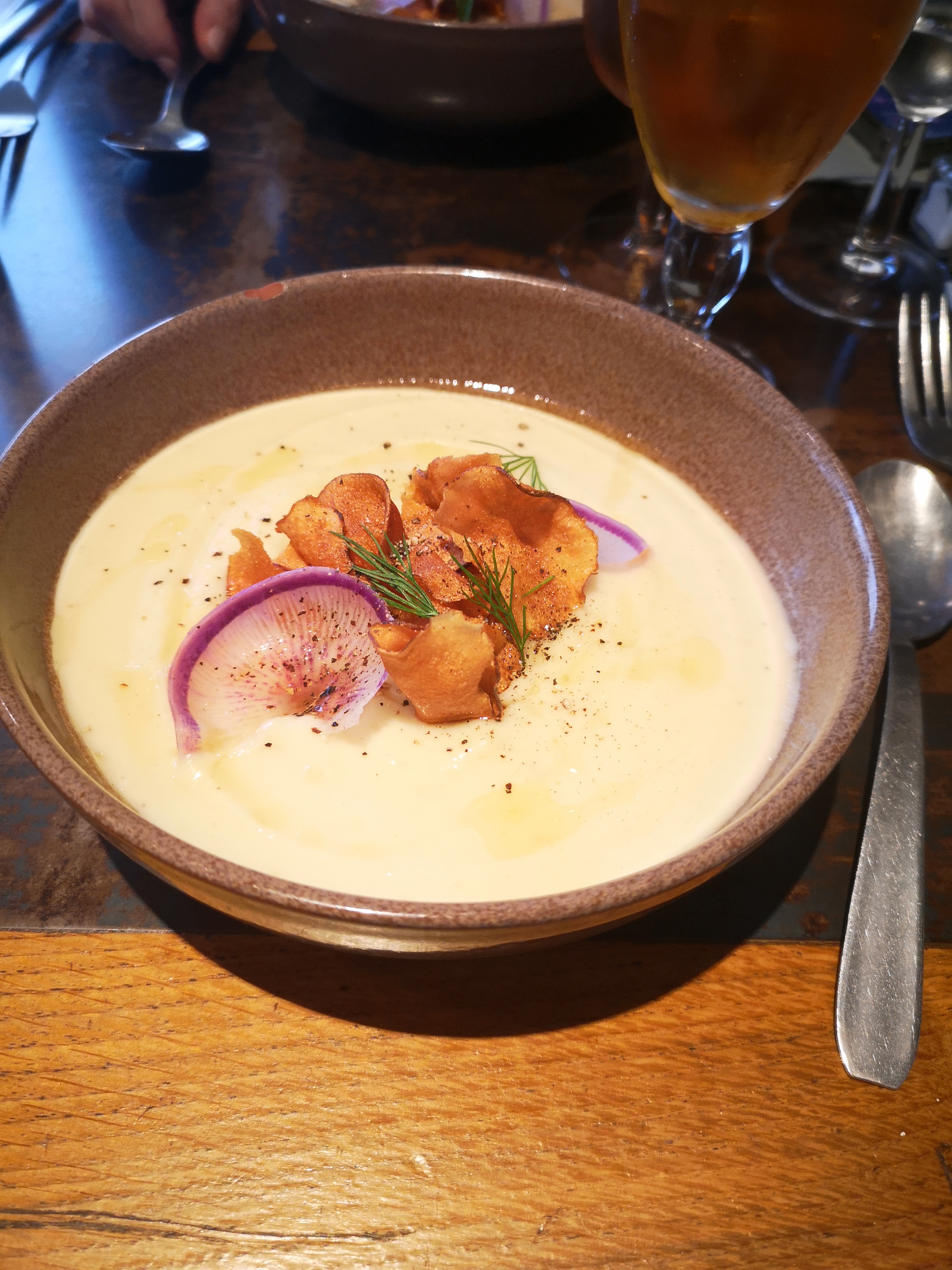 Nous nous sommes arrêtés pour le déjeuner et avons vraiment apprécié notre repas. Parlant uniquement anglais, nous ne pouvions distinguer que des extraits du menu, mais nous avons décidé d'essayer un poisson et une soupe. Les deux étaient des œuvres d’art visuelles avec des saveurs merveilleuses assorties. J'aurais aimé avoir assez faim pour en essayer davantage. Le meilleur repas que nous ayons eu à Lyon jusqu'à présent !