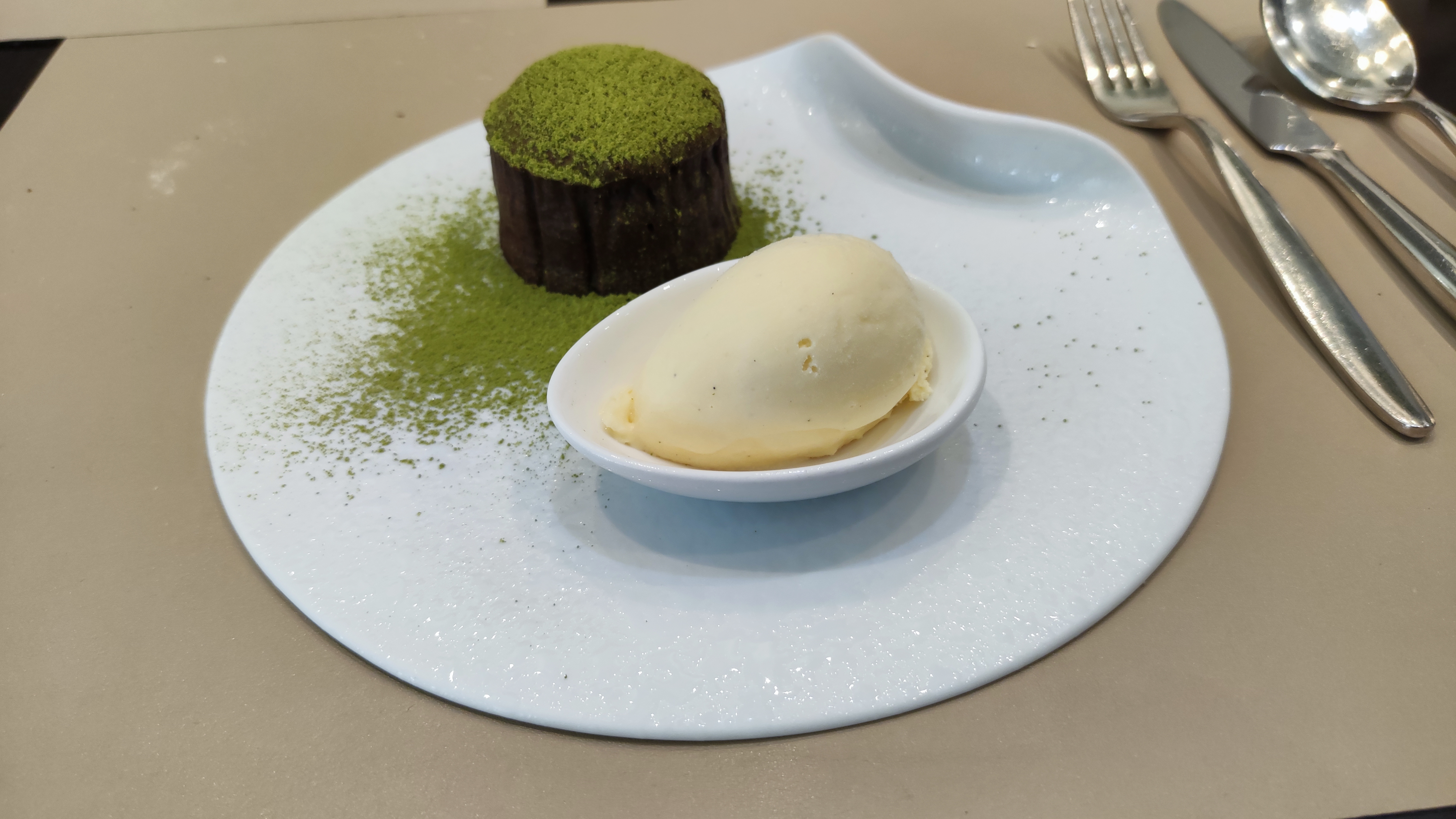 La nourriture était cuite à la perfection. J'ai déjeuné en trois plats : raviolis de crevettes et foie gras sauce homard, daurade grillée sauce fruits de mer à l'huile d'olive, gâteau au chocolat chaud et Macha avec glace vanille. Le service était impeccable. J'étais assis même si je n'avais pas de réservation. Une personne attendait sur toutes les tables. Elle a fait un travail incroyable en prenant les commandes, en disposant les couverts pour chaque plat et en servant la nourriture.